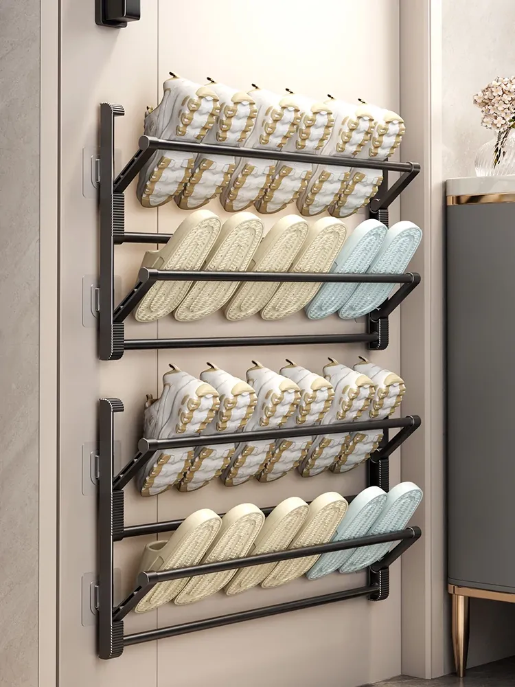 Wall-Mounted No-Drill Bathroom Slipper Rack - Foldable Double-Layer Drainage Shoe Organizer for Space-Saving Storage Behind Doors, Perfect for Your Bathroom!