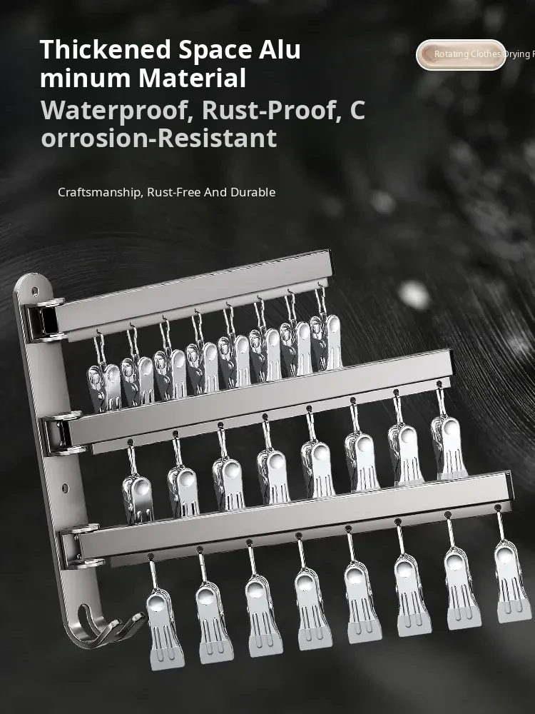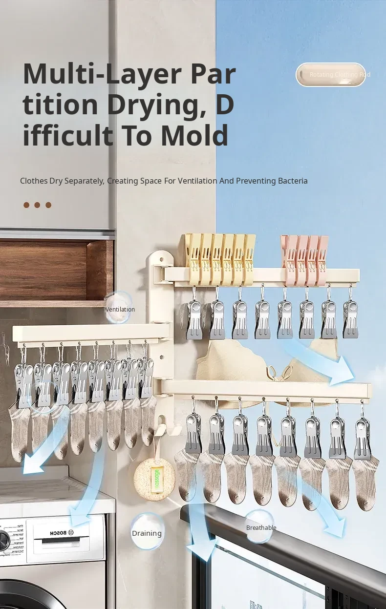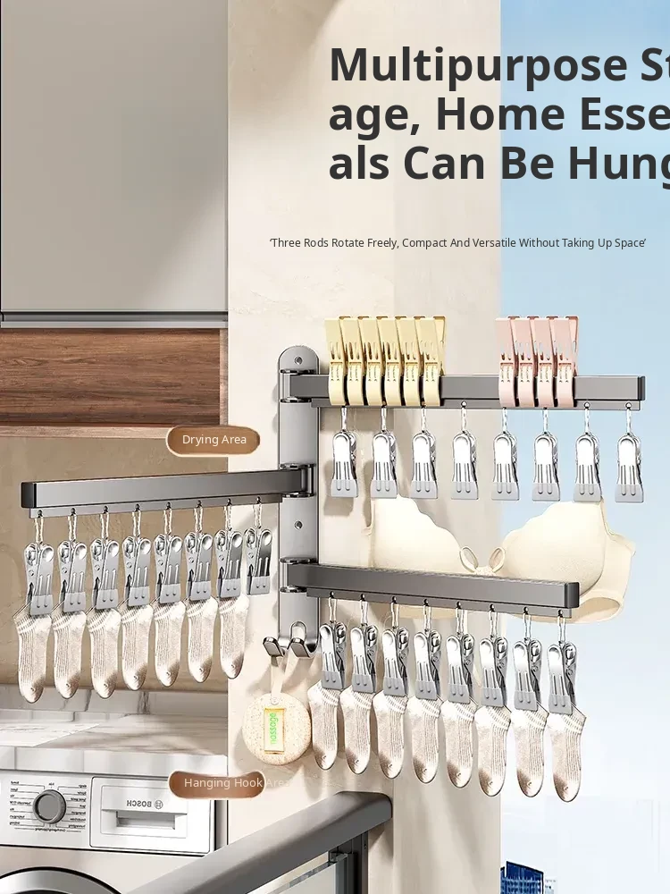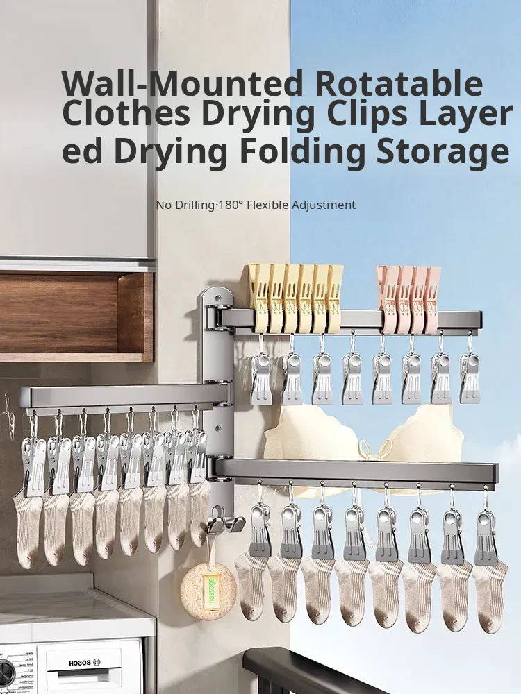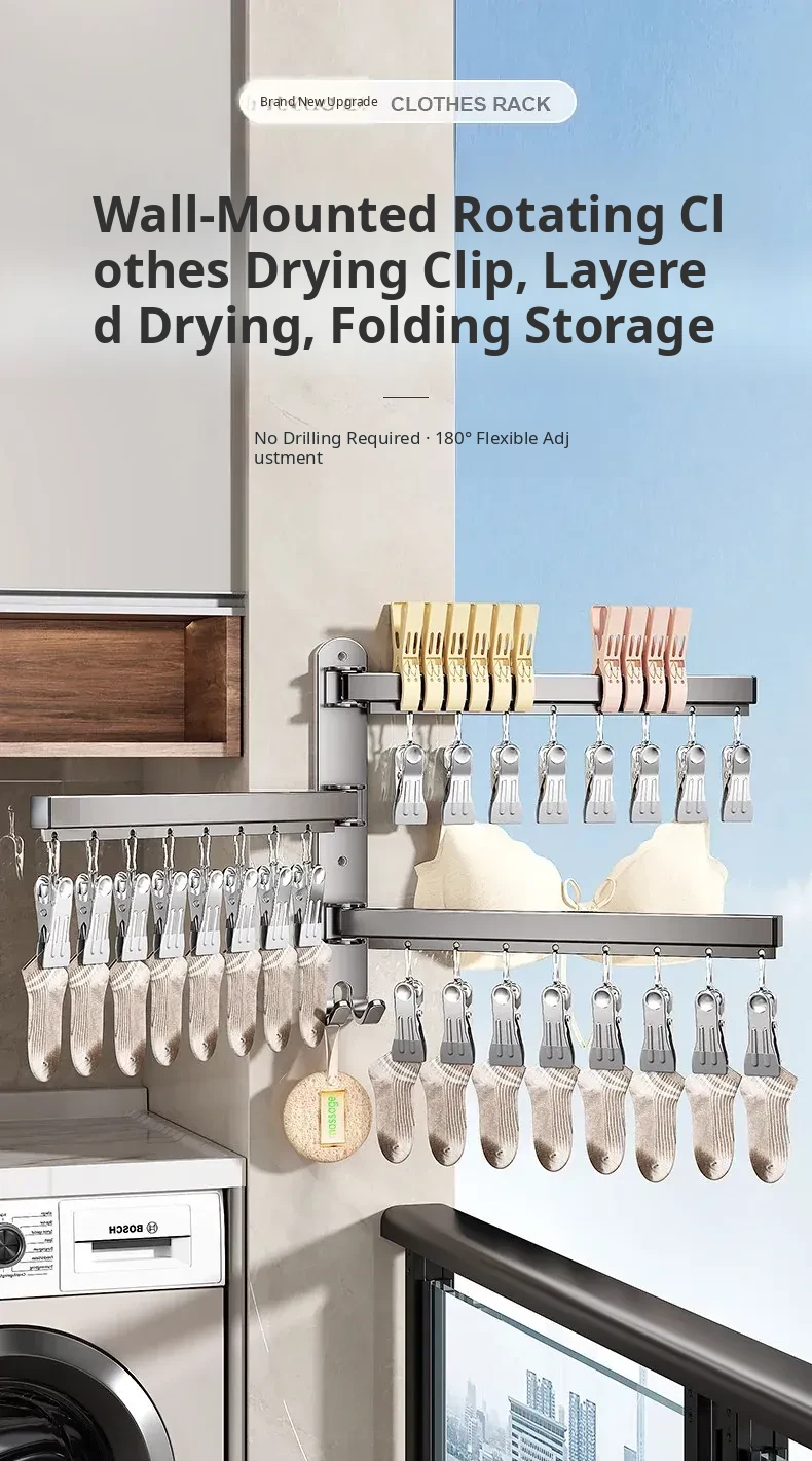 Foldable No-Drill Sock and Underwear Drying Rack - Multi-Functional Rotating Clothes Hanger with Multiple Clips for Balcony Storage Solution