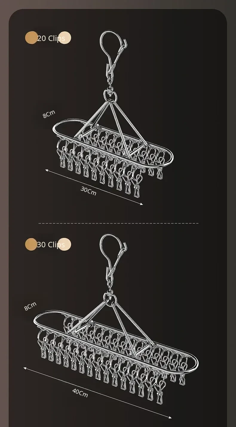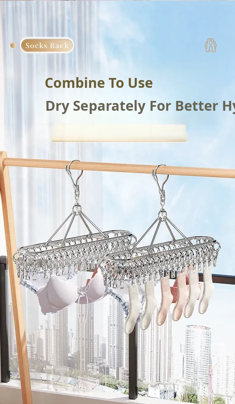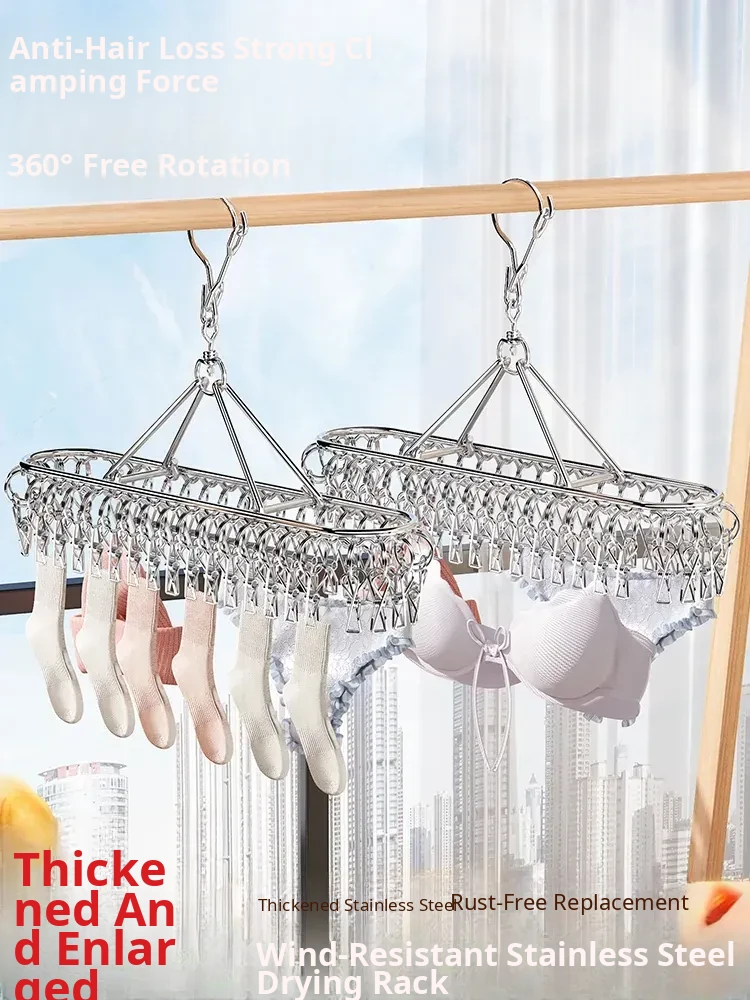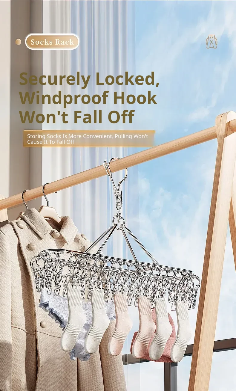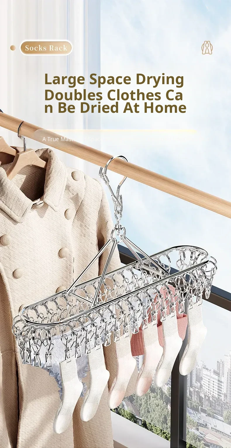 Stainless Steel Sock Drying Rack with Multiple Clips - Windproof, No Trace Magic Clothes Hanger for Home Use, Versatile Indoor/Outdoor Underwear and Panties Drying Solution for Your Balcony.