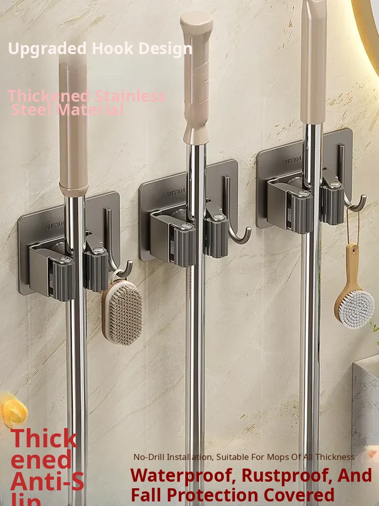 Wall-Mounted Mop Holder - No Drilling Required! Strong Adhesive Mop Clip for Bathroom, Easy Storage and Organization, Keeps Your Cleaning Supplies Neat and Tidy. Perfect for Small Spaces!