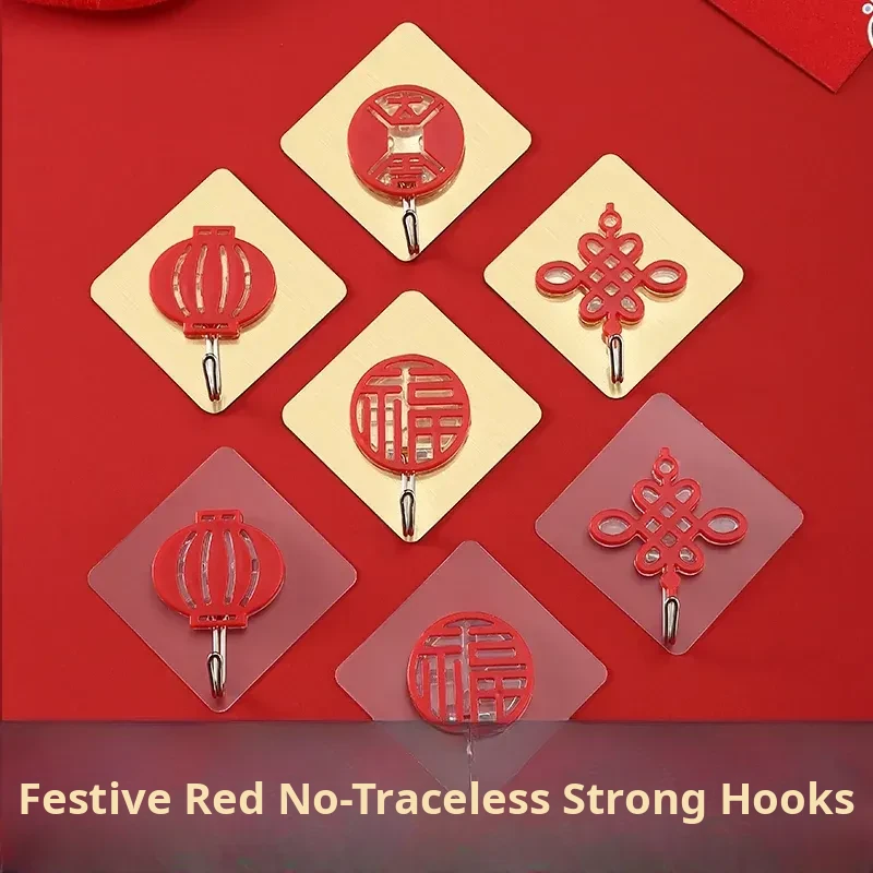 "Festive Red 'Fu' Wall Hooks - Strong Adhesive, No Drilling Needed! Perfect for New Year Celebrations, No Trace Wall Mounts for a Joyful Home Decor"