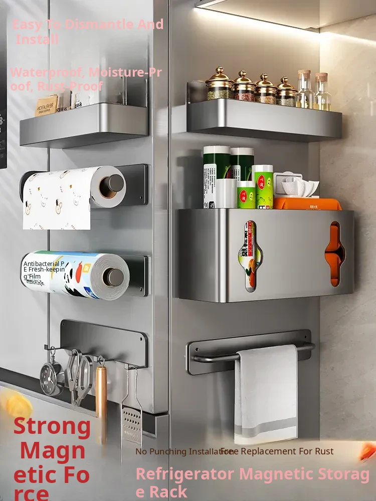 Magnetic Refrigerator Storage Rack with Hooks - No Drill Paper Towel Holder and Kitchen Organizer for Plastic Wrap and Spice Rolls - Keep Your Kitchen Tidy and Efficient!
