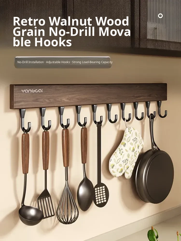 Walnut Wood Grain Kitchen Rotating Hooks - No Drill Wall-Mounted Storage Rack for Spatulas and Utensils - Stylish & Space-Saving Kitchen Organizer