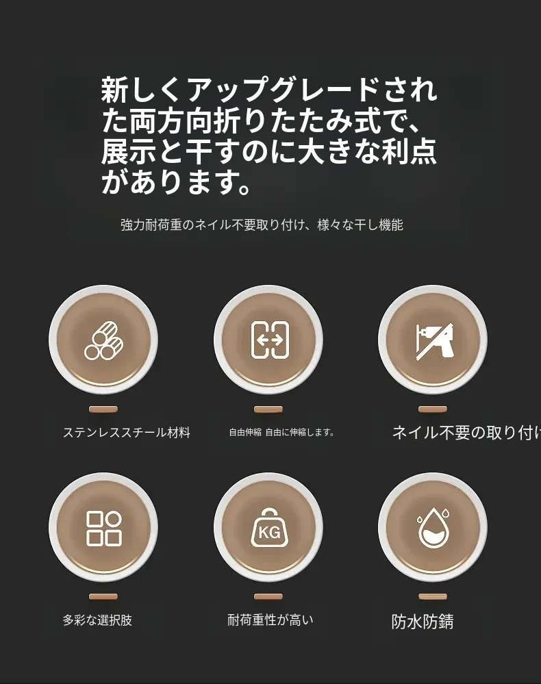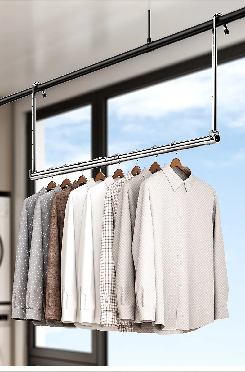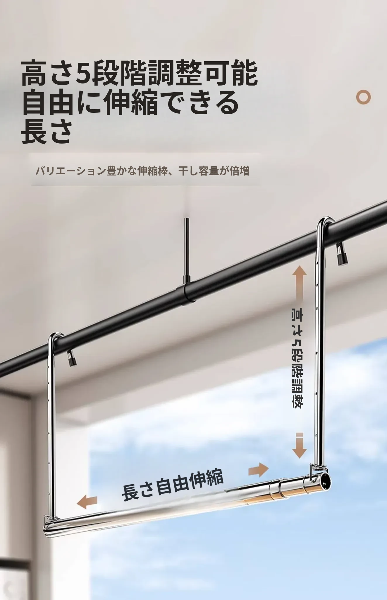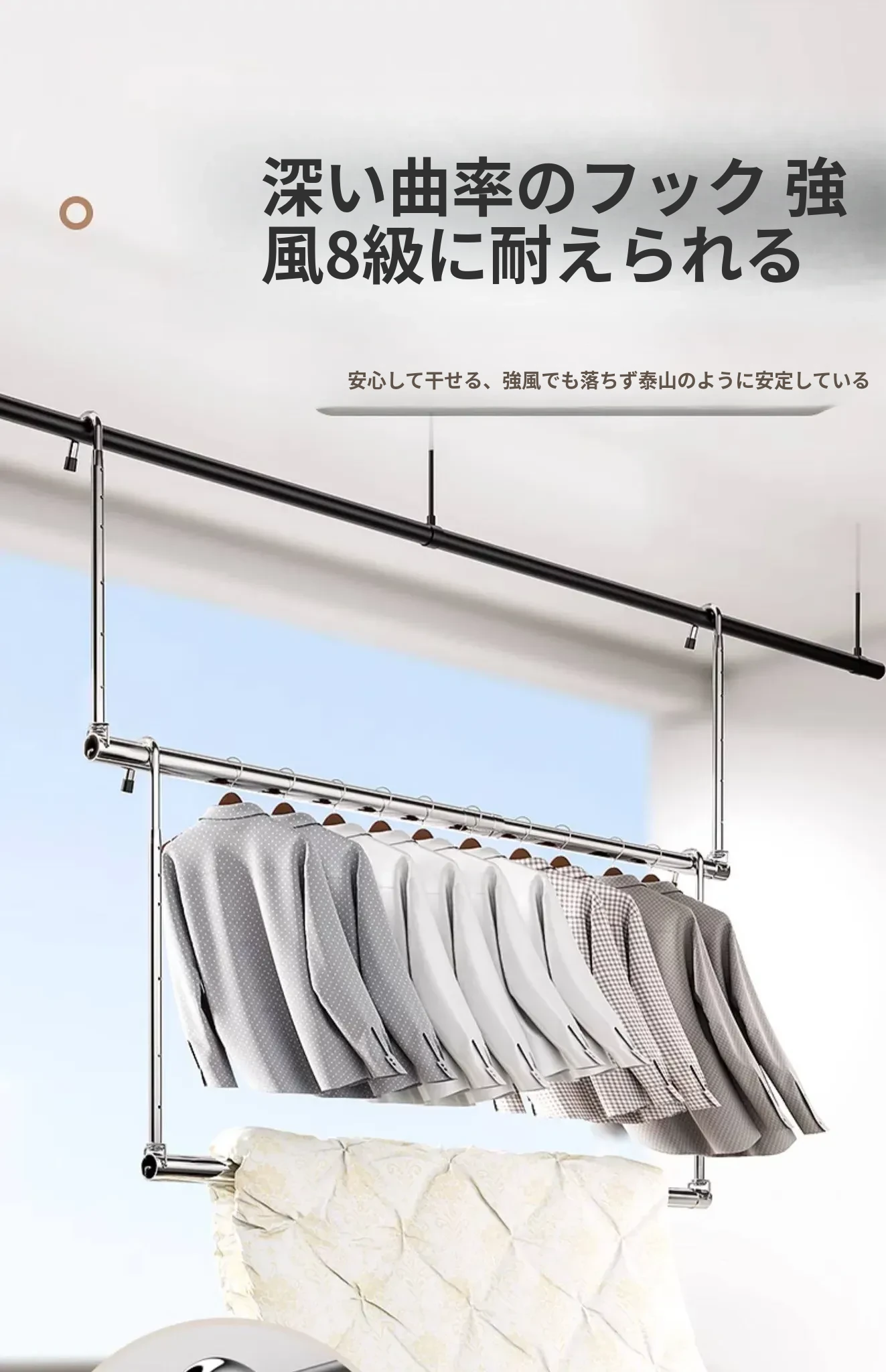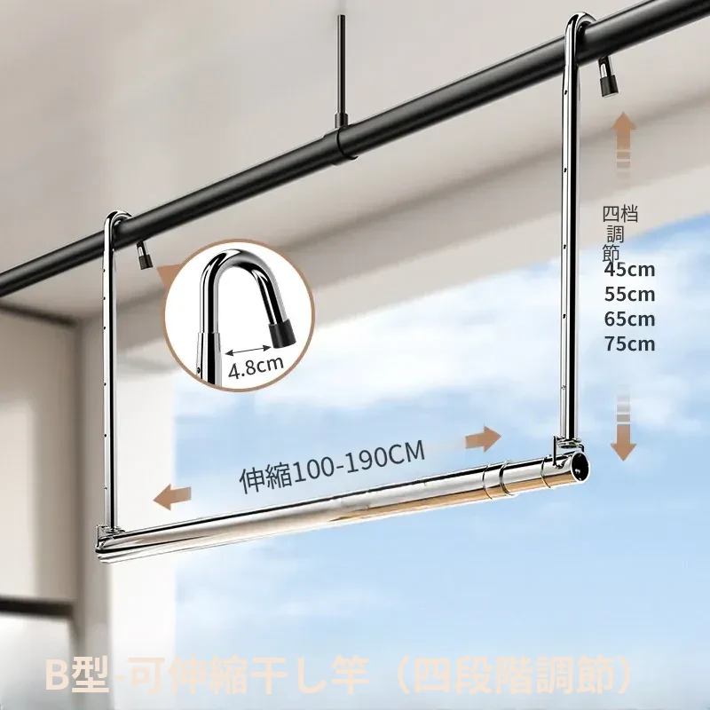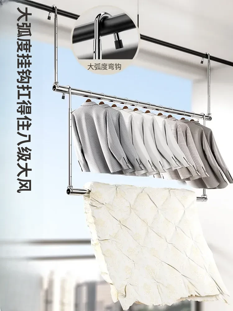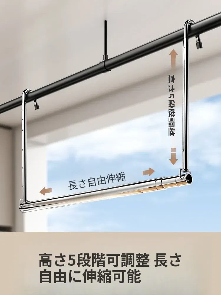 家用バルコニー用伸縮式物干しラック - 穴を開けずに簡単取り付け、昇降式デザインで使いやすい!ステンレス製で耐久性抜群、布団干しにも最適な便利アイテム!