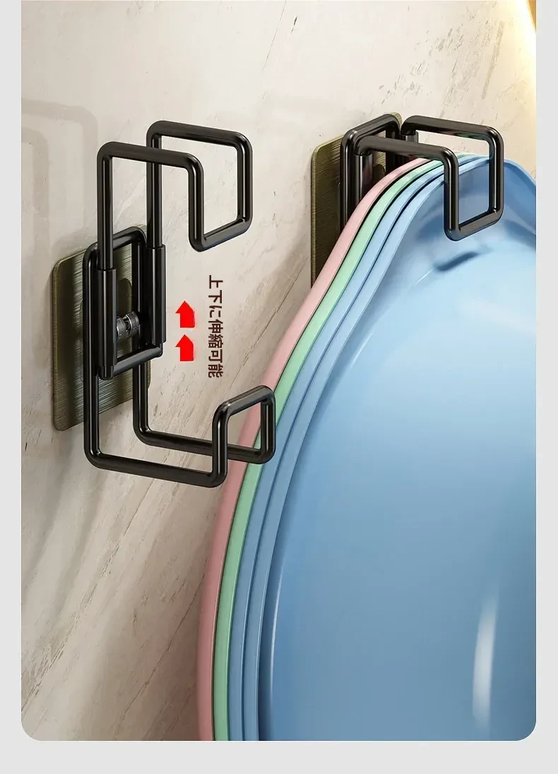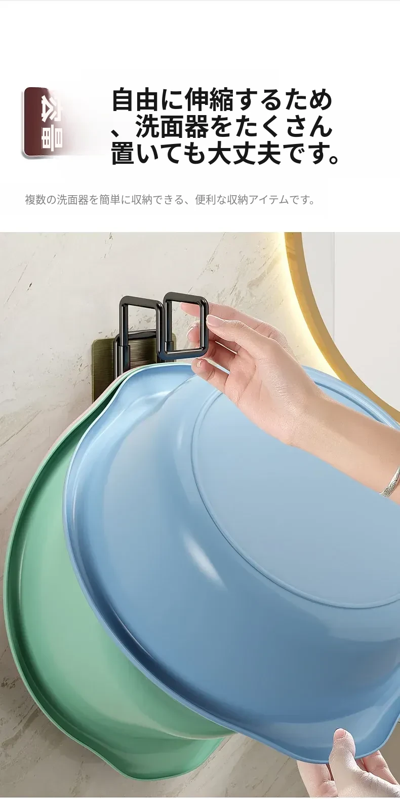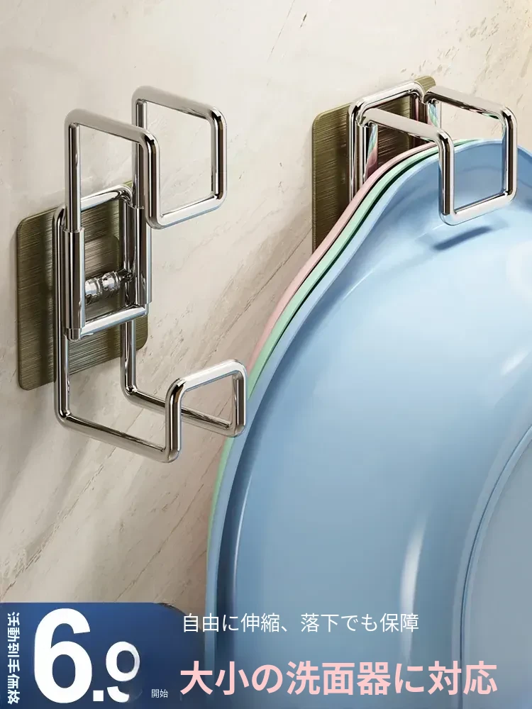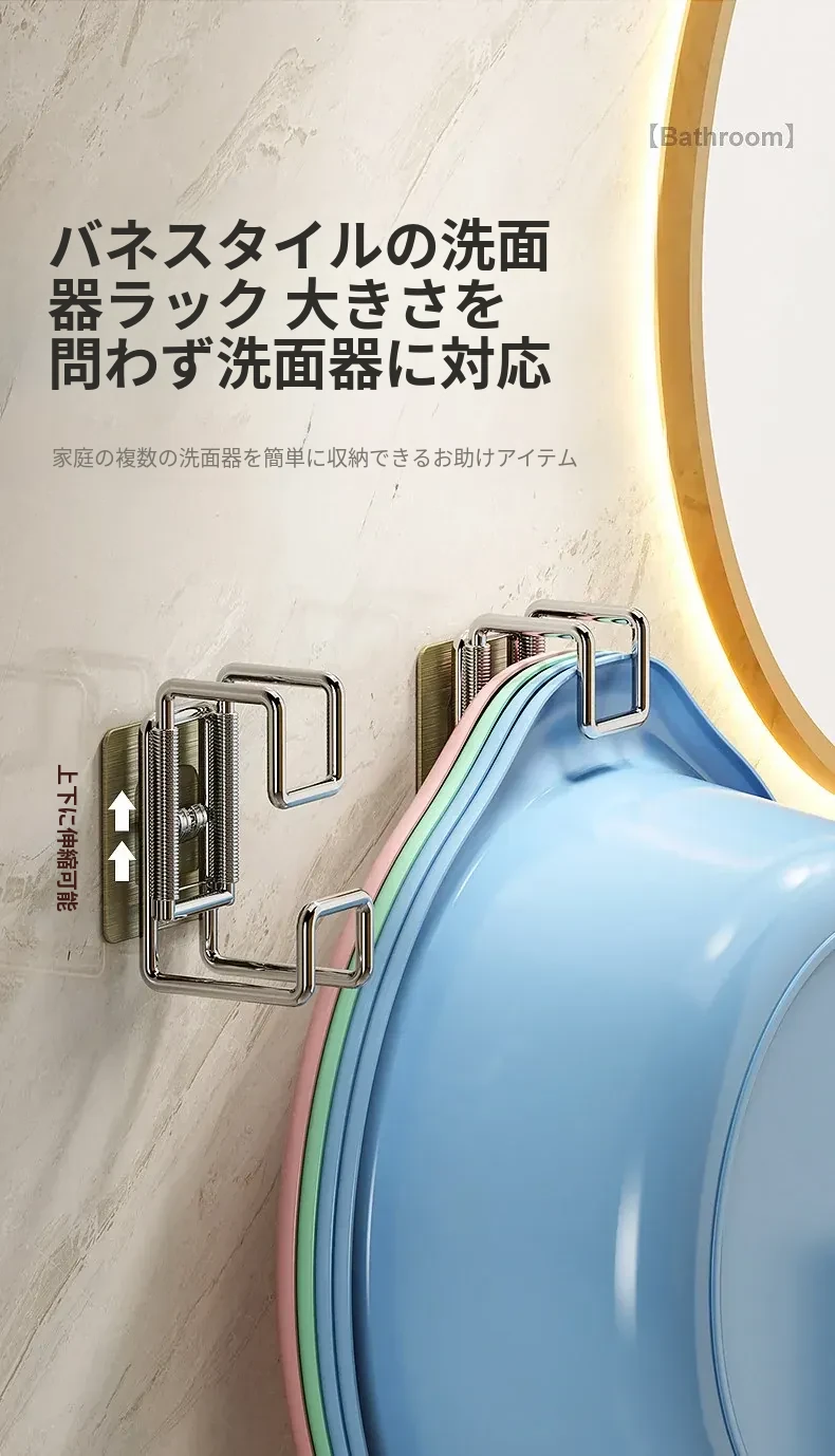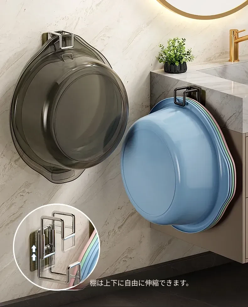 伸縮式洗面器収納ラック|穴あけ不要!バスルームに最適なフック付き壁掛け洗面器収納|省スペースでスッキリ整理!