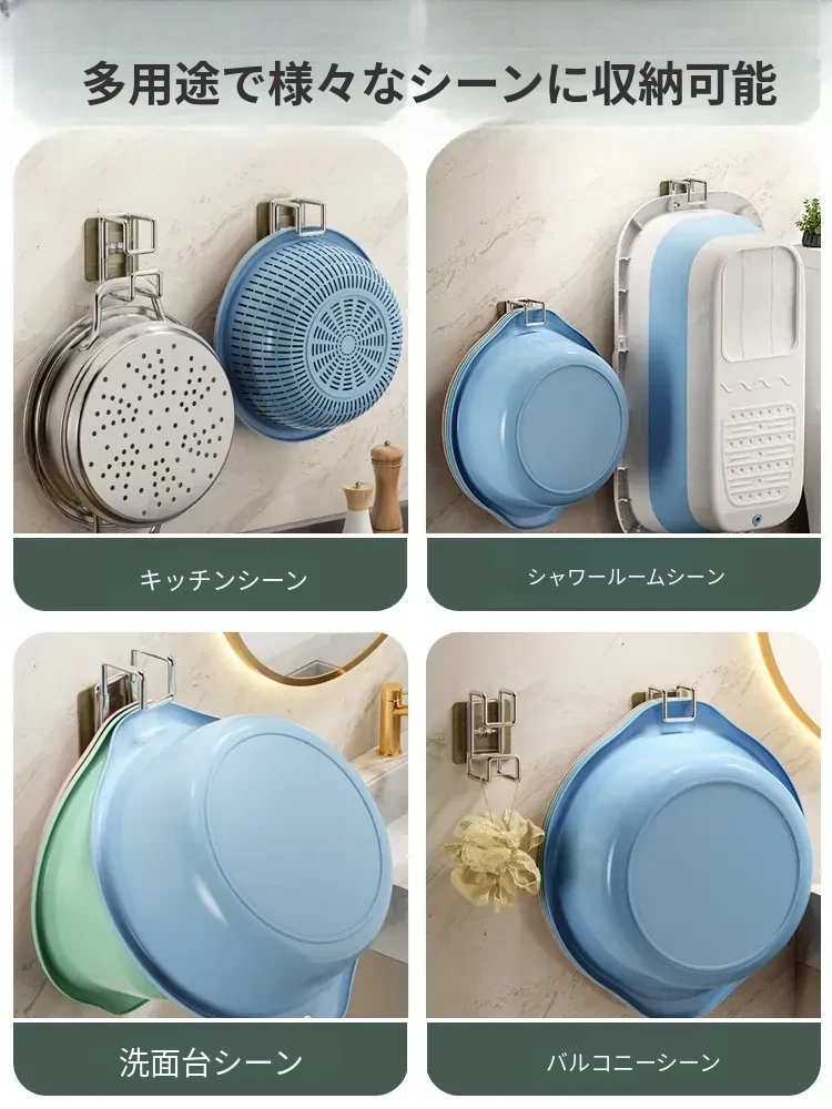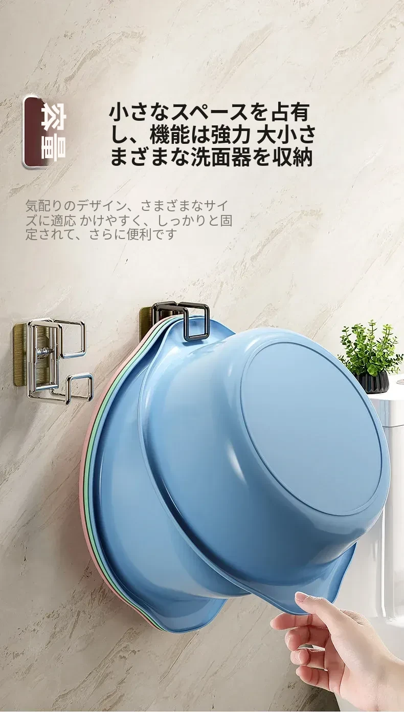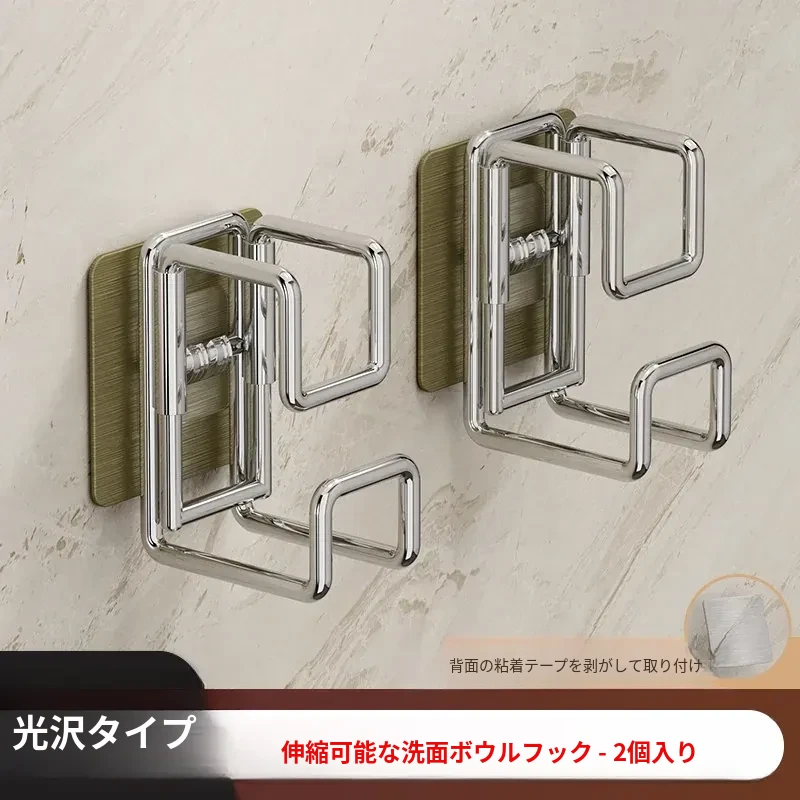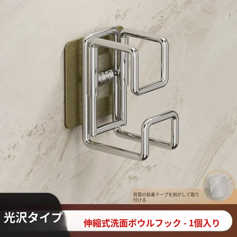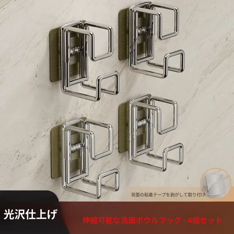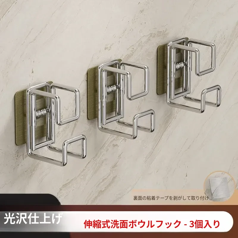 伸縮式洗面器収納ラック|穴あけ不要!バスルームに最適なフック付き壁掛け洗面器収納|省スペースでスッキリ整理!