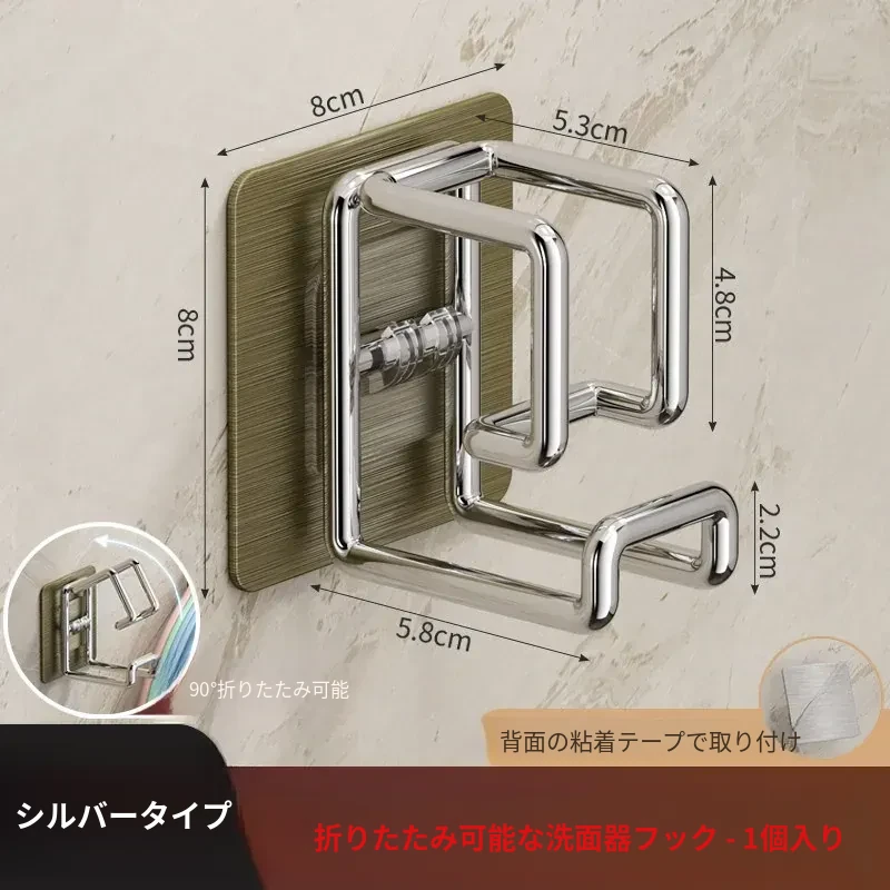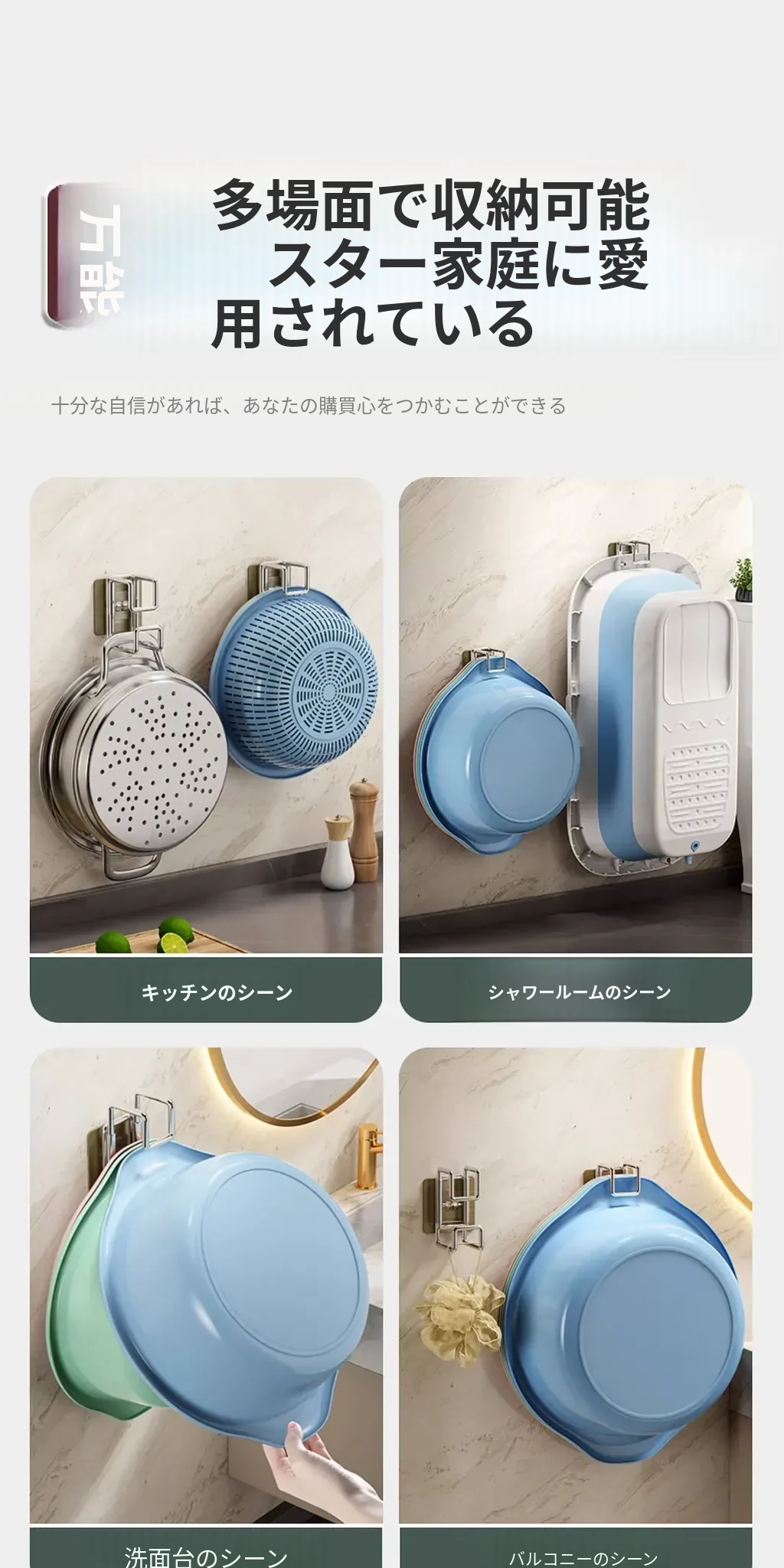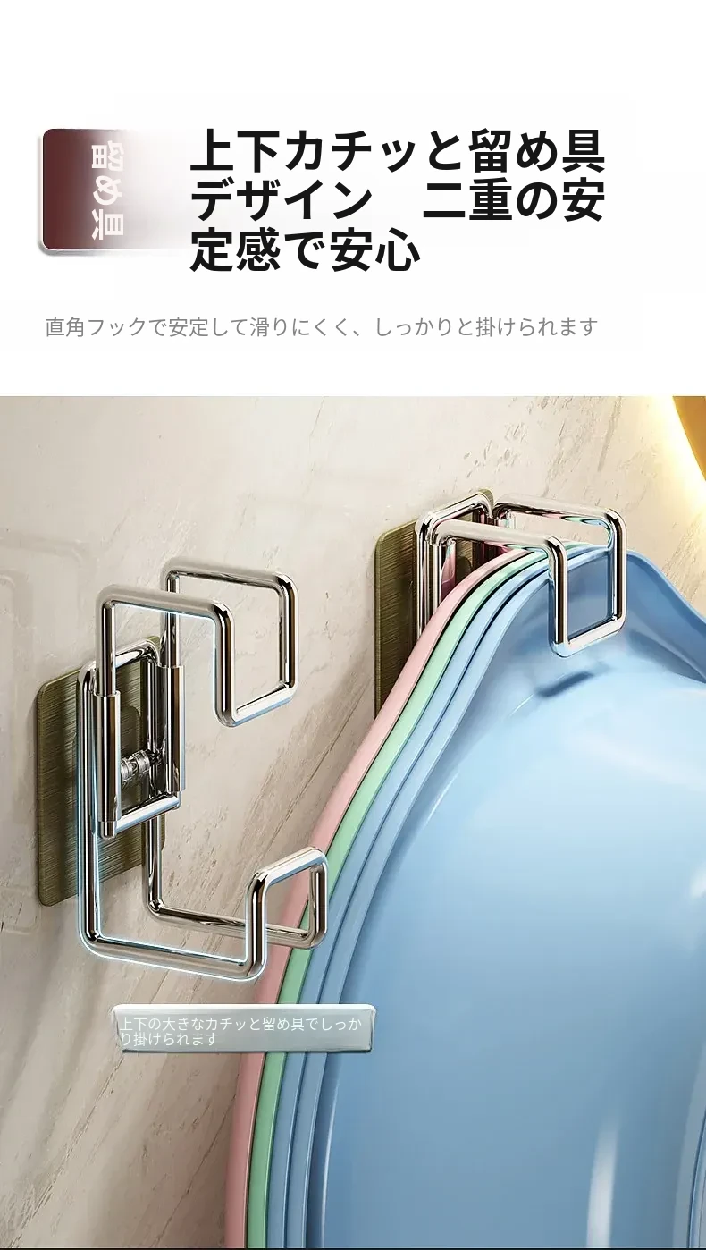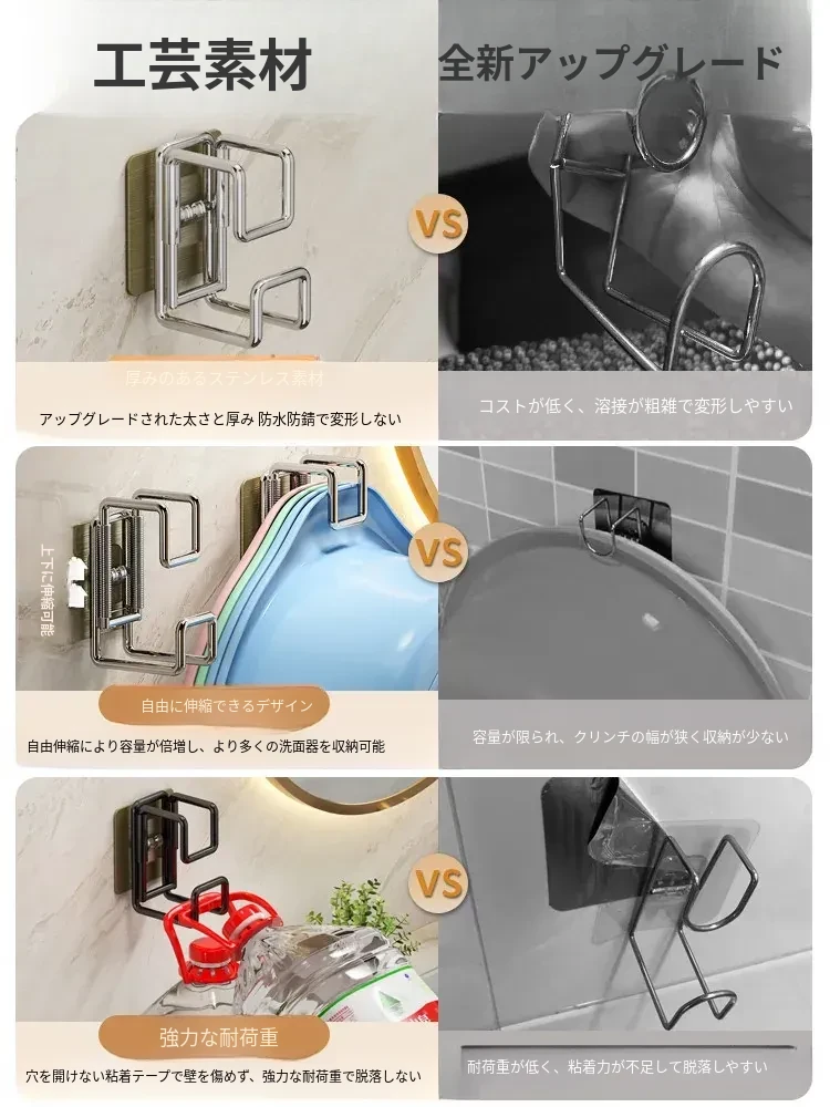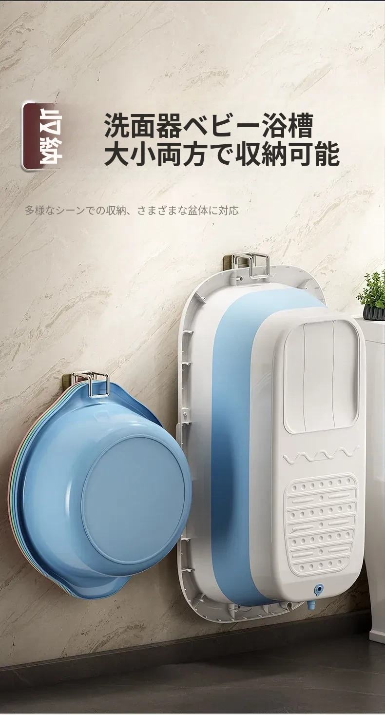 伸縮式洗面器収納ラック|穴あけ不要!バスルームに最適なフック付き壁掛け洗面器収納|省スペースでスッキリ整理!