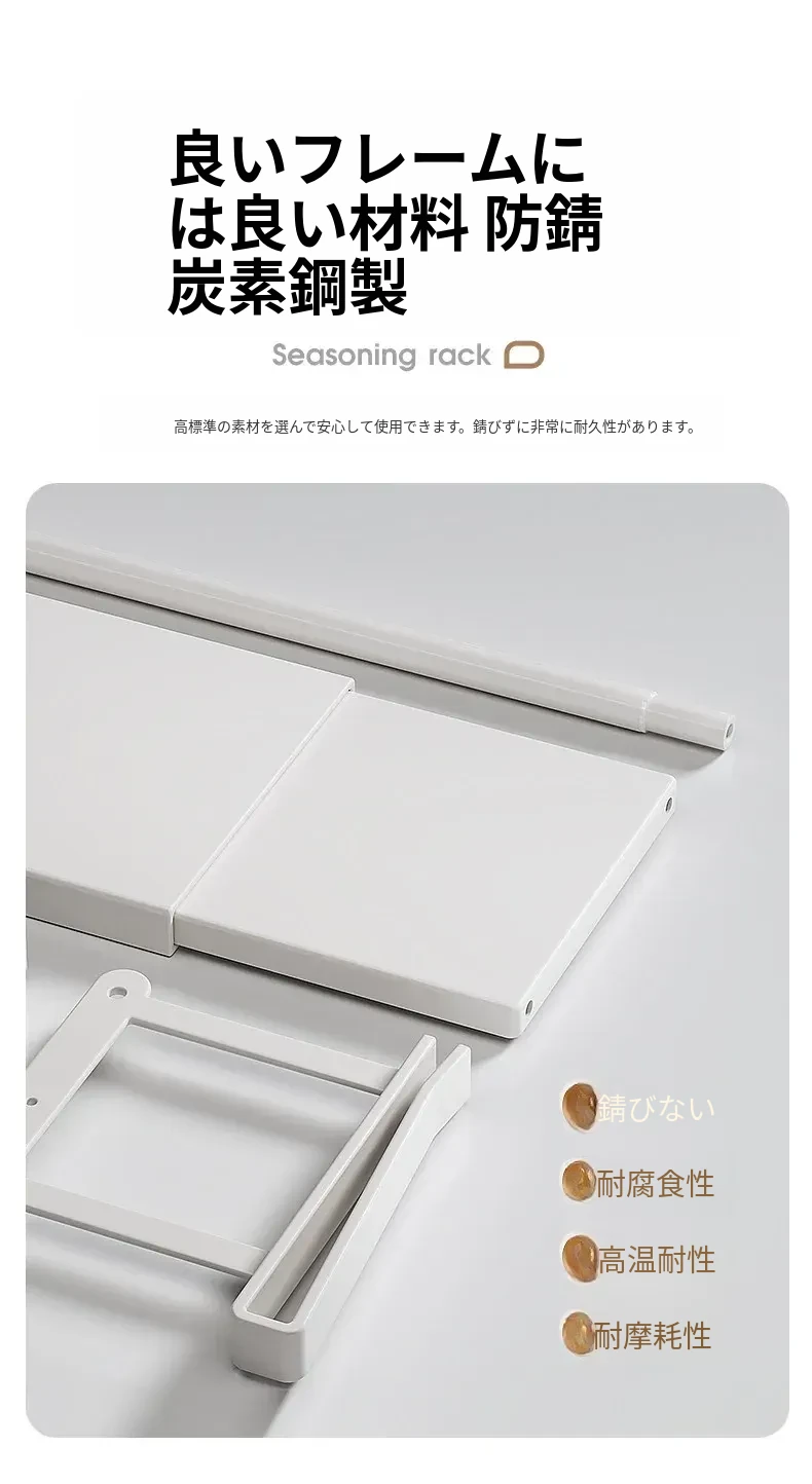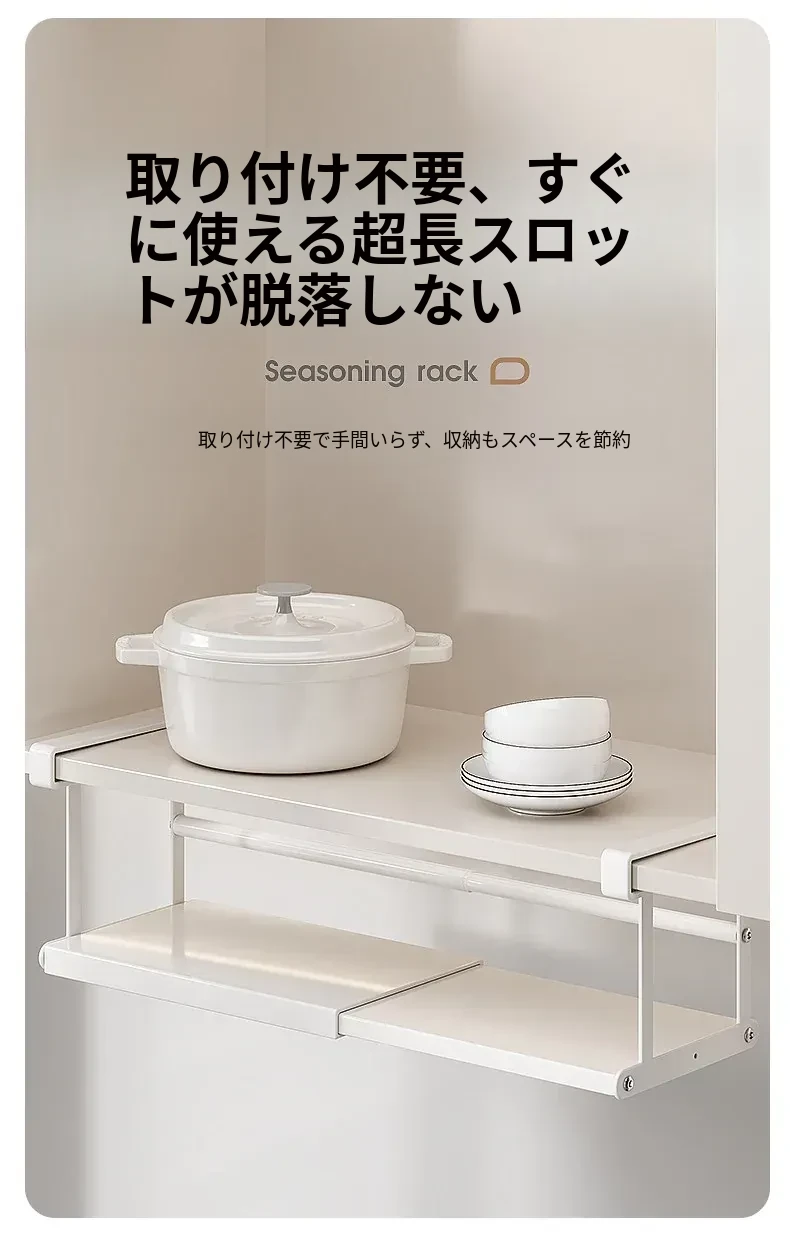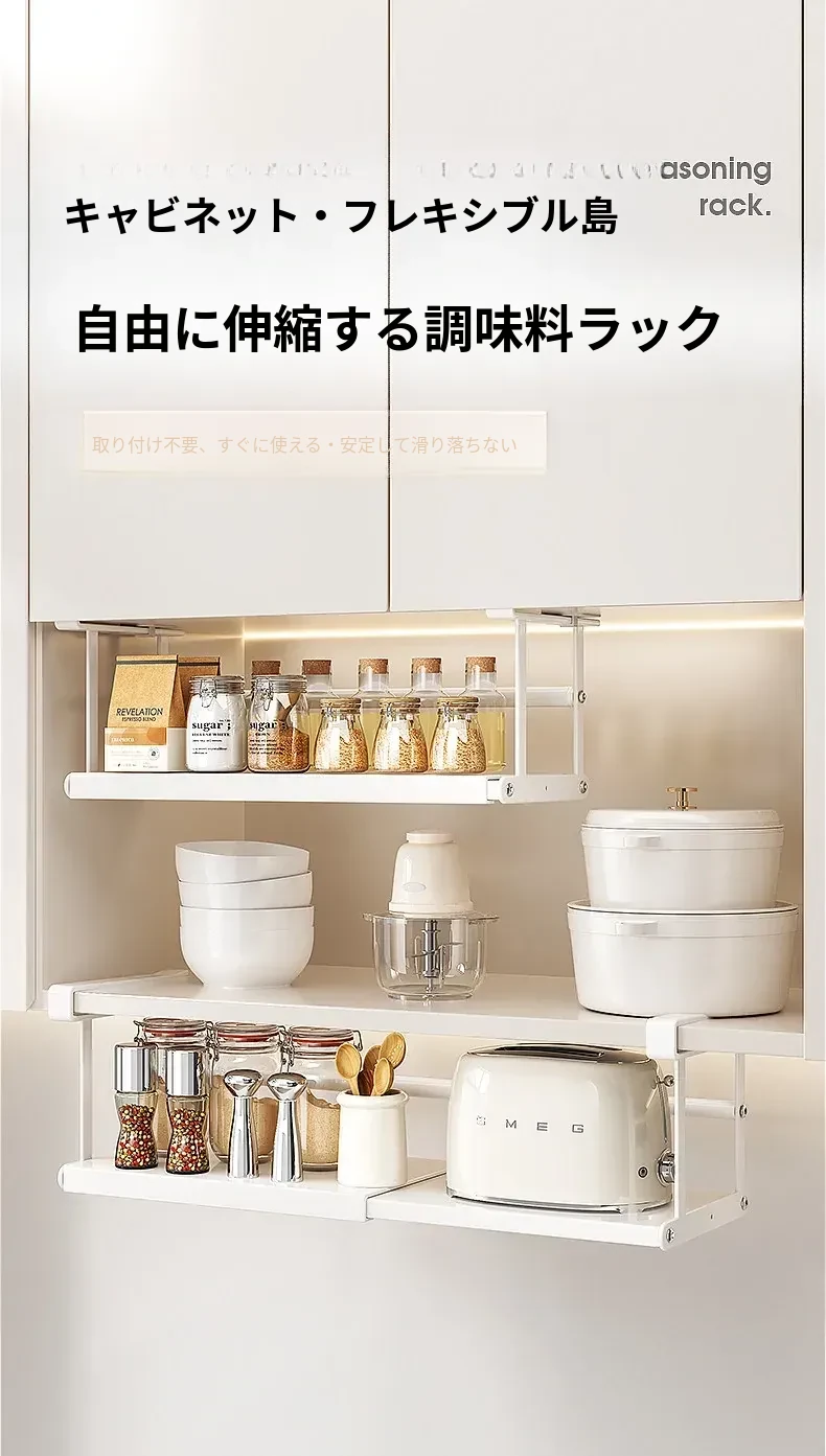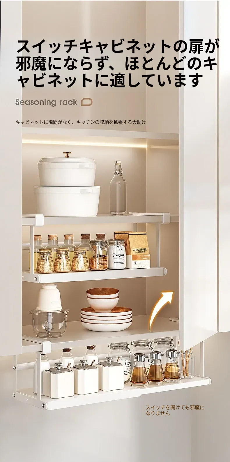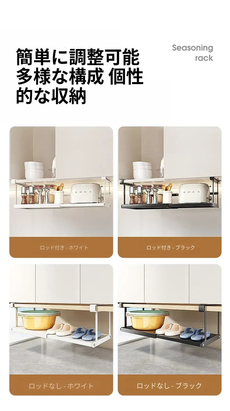 伸縮可能なキッチン収納ラック - 多機能調味料ハンガー、キャビネット下にぴったりの収納神器!整理整頓が簡単にでき、料理がもっと楽しくなるアイテムです。