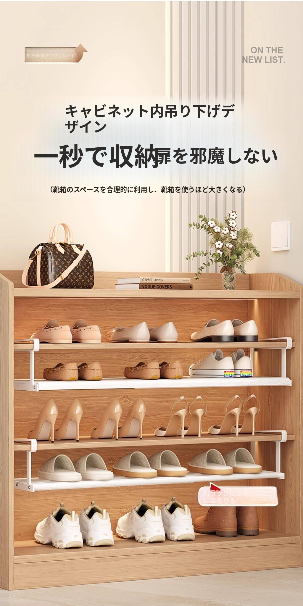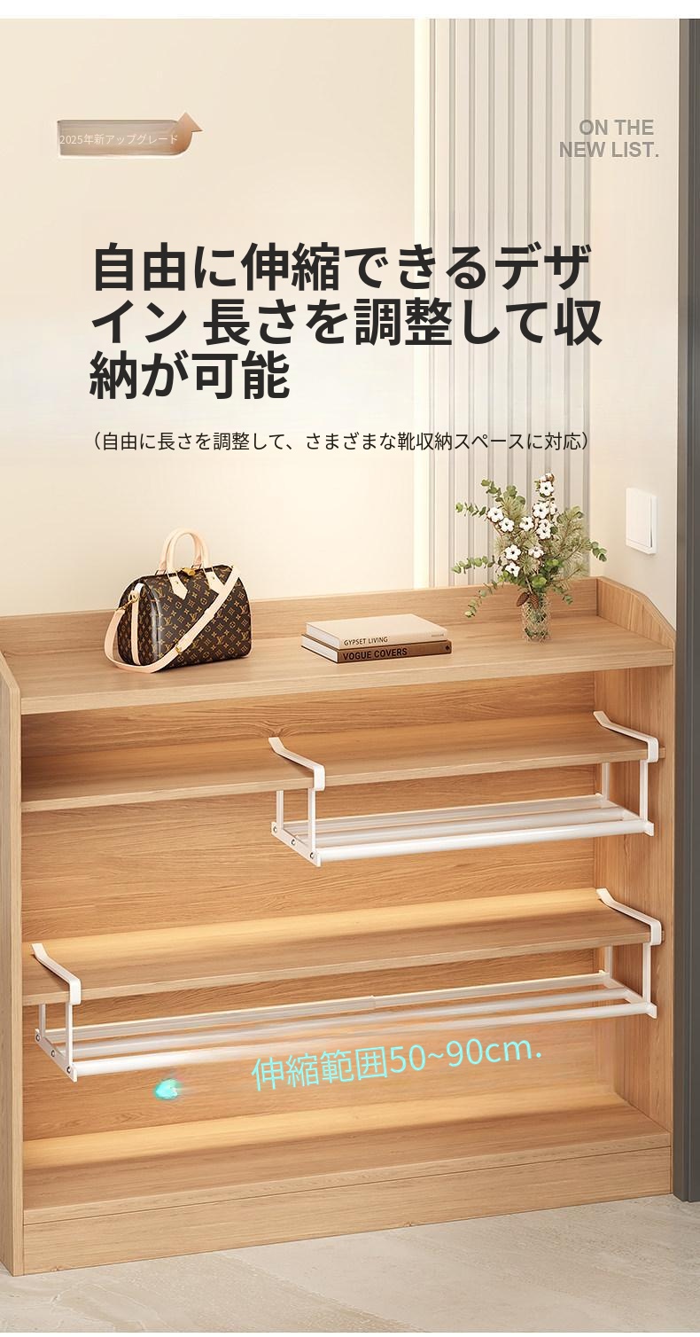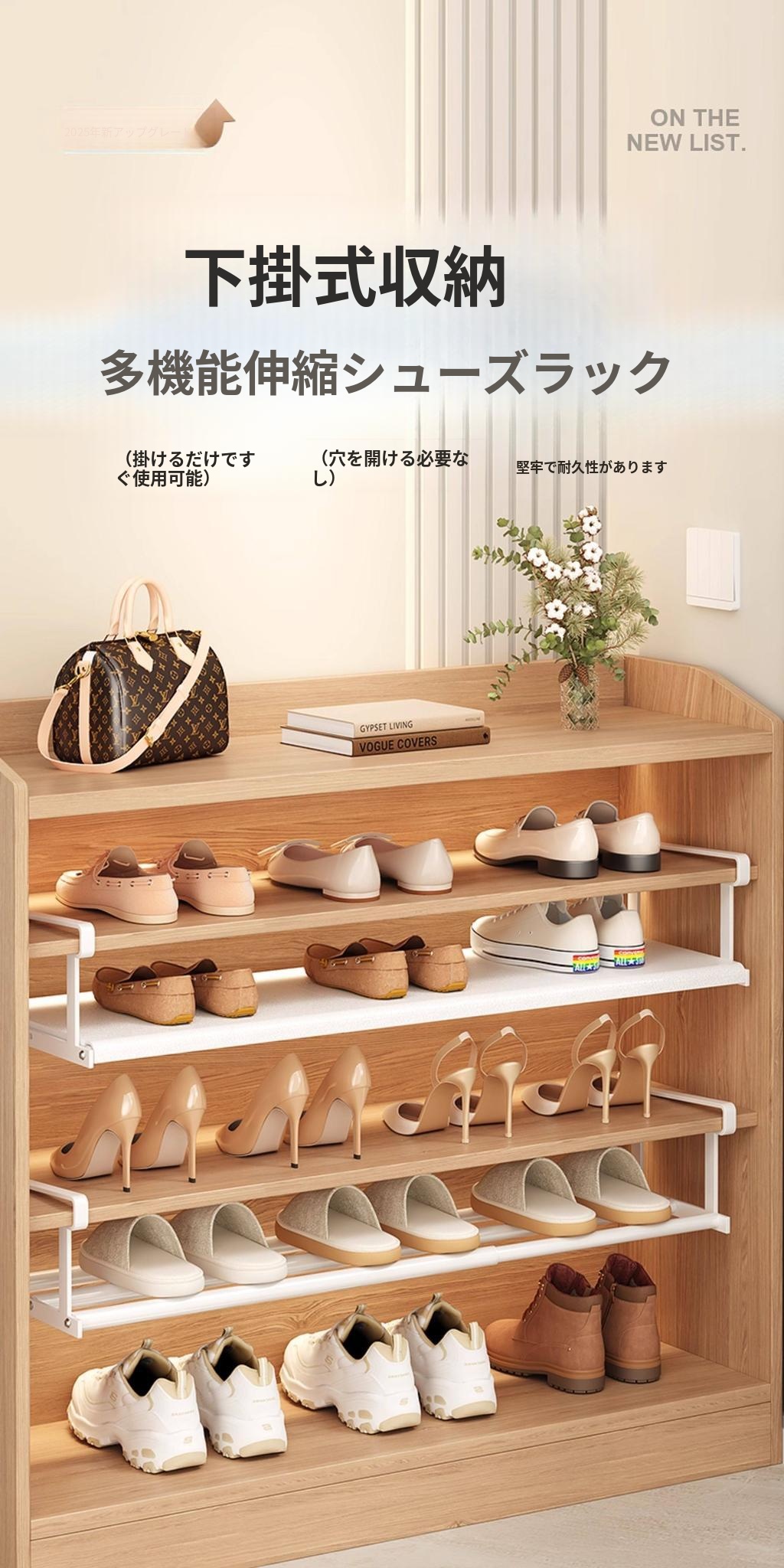 伸縮式シューズラック - 家庭用のスリムデザイン、下に吊り下げることで省スペースを実現!分層棚で靴をスッキリ収納、整理整頓をサポートする便利な収納アイテムです!