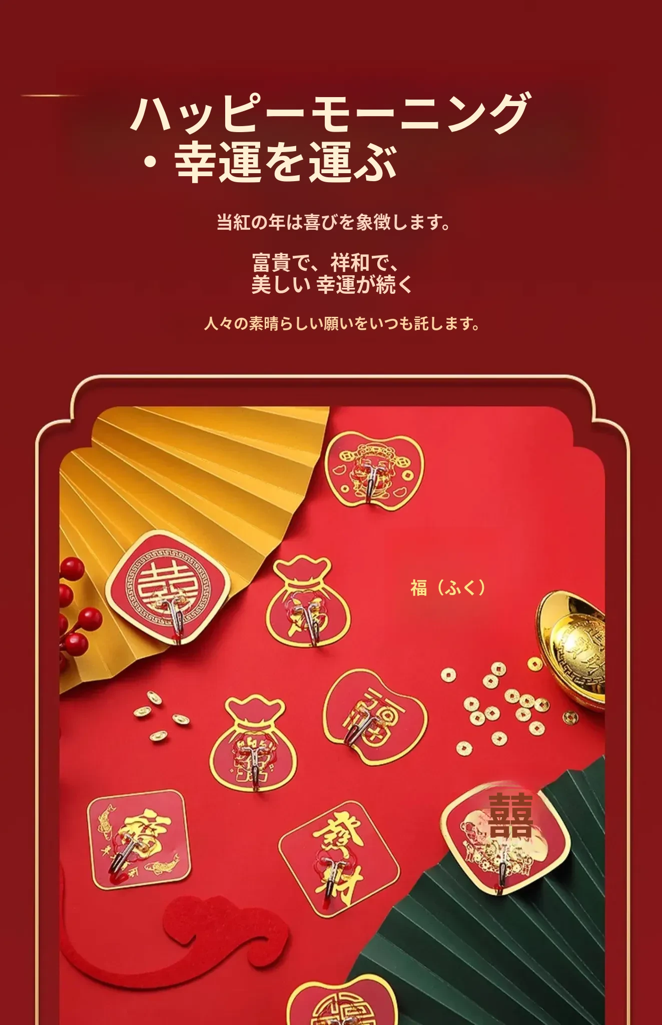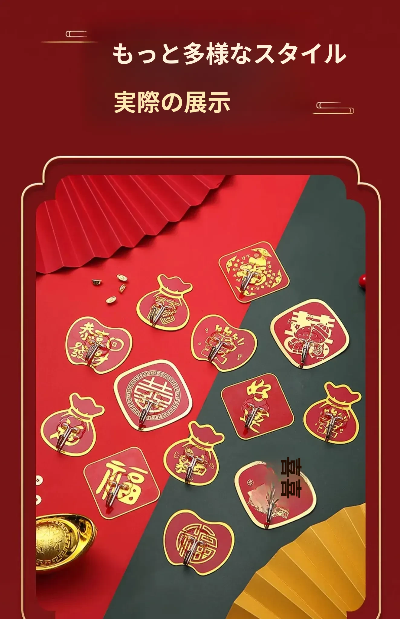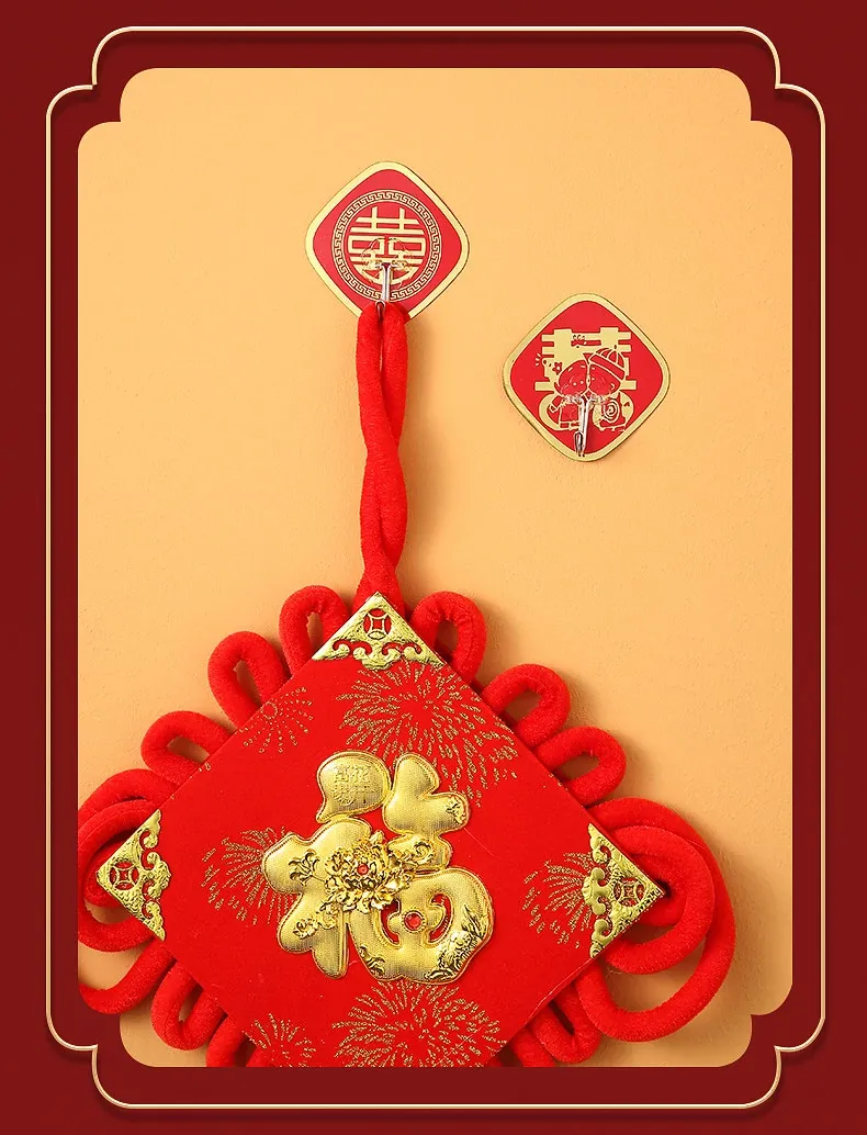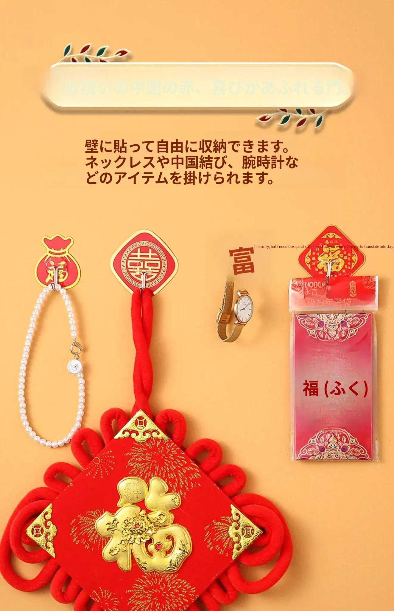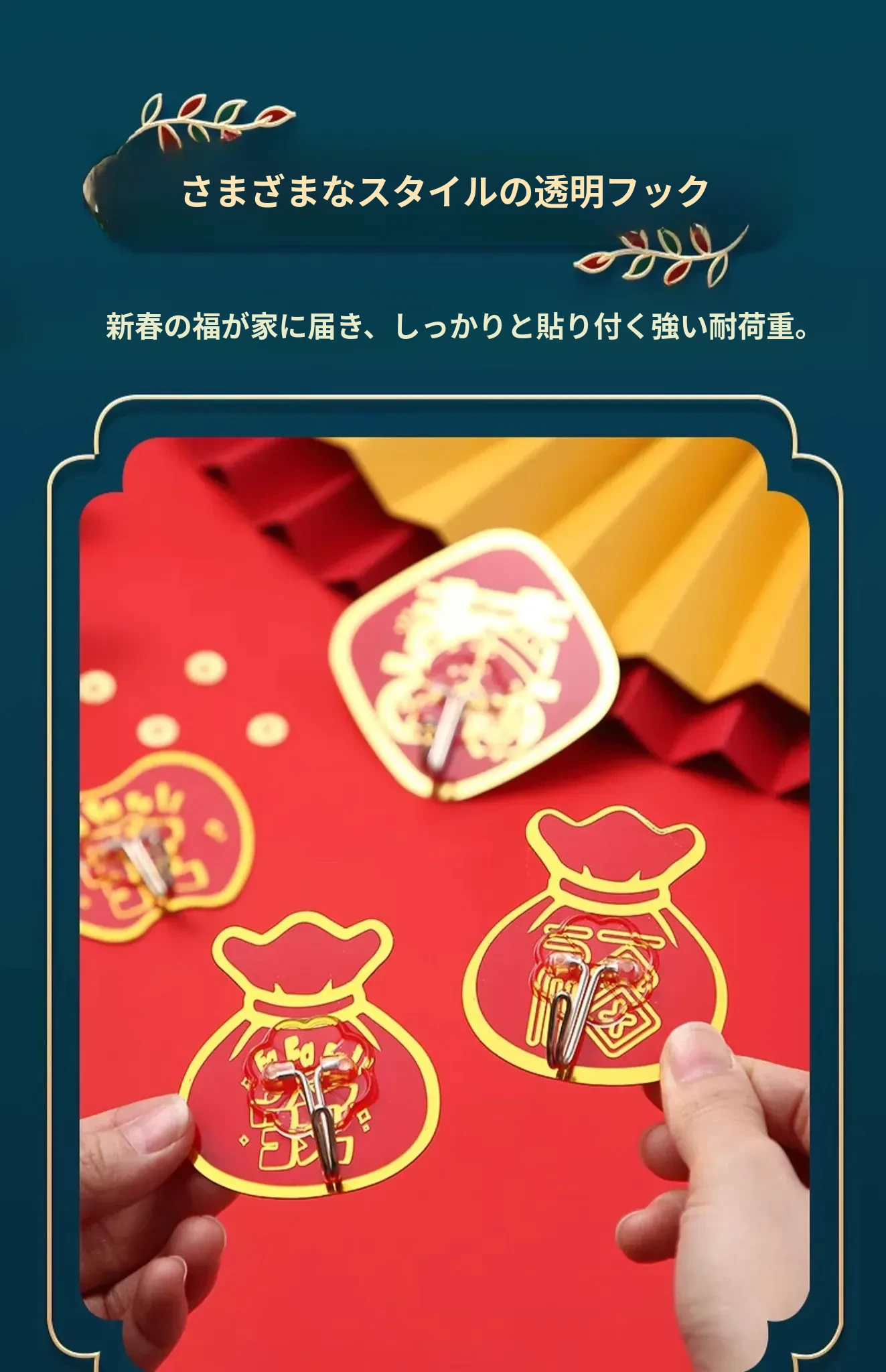 新年を祝う!福字デザインの強力粘着フック - 壁に穴を開けずに簡単取り付け、跡が残らない赤い粘着フックでおしゃれに飾ろう!