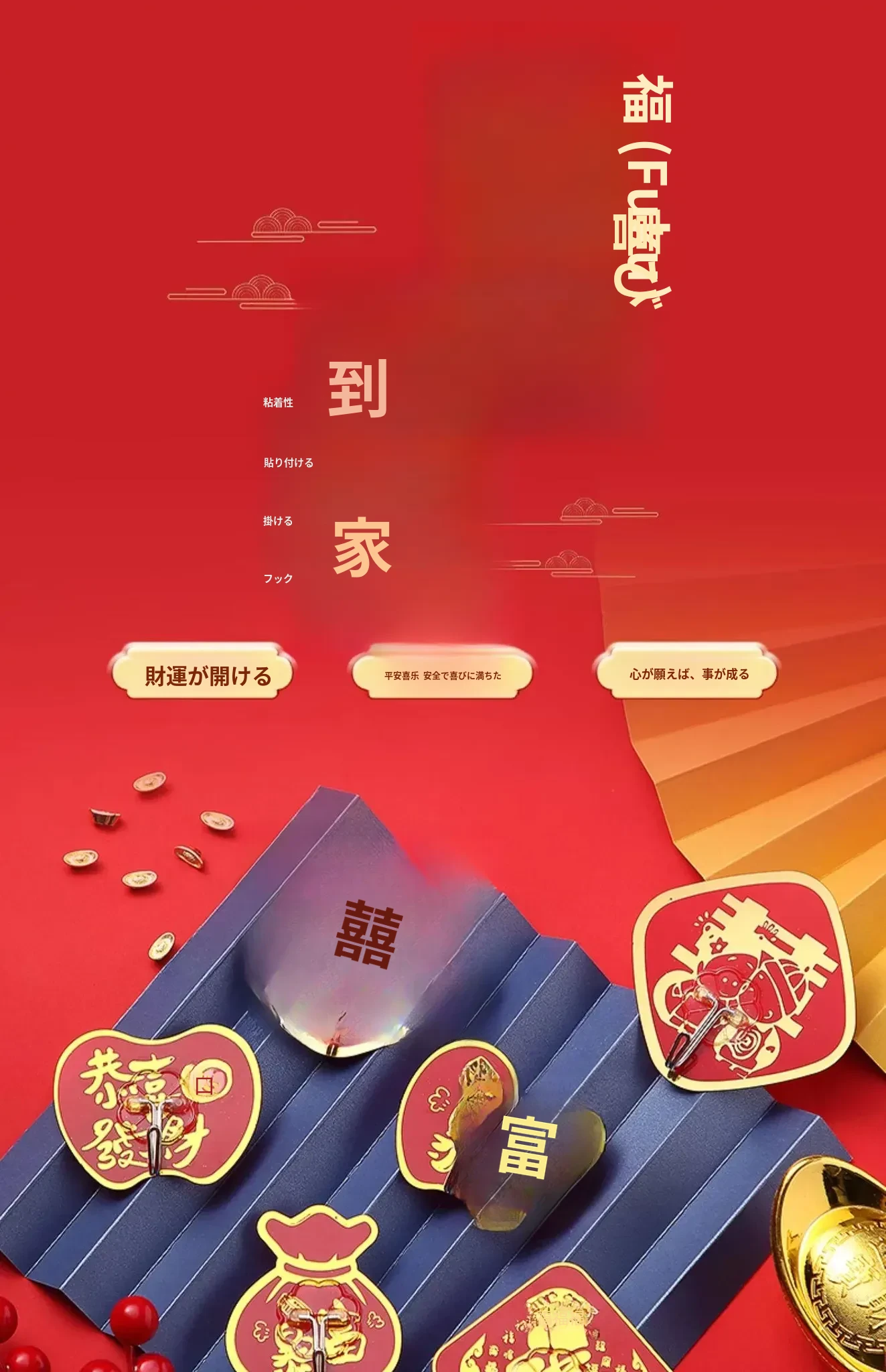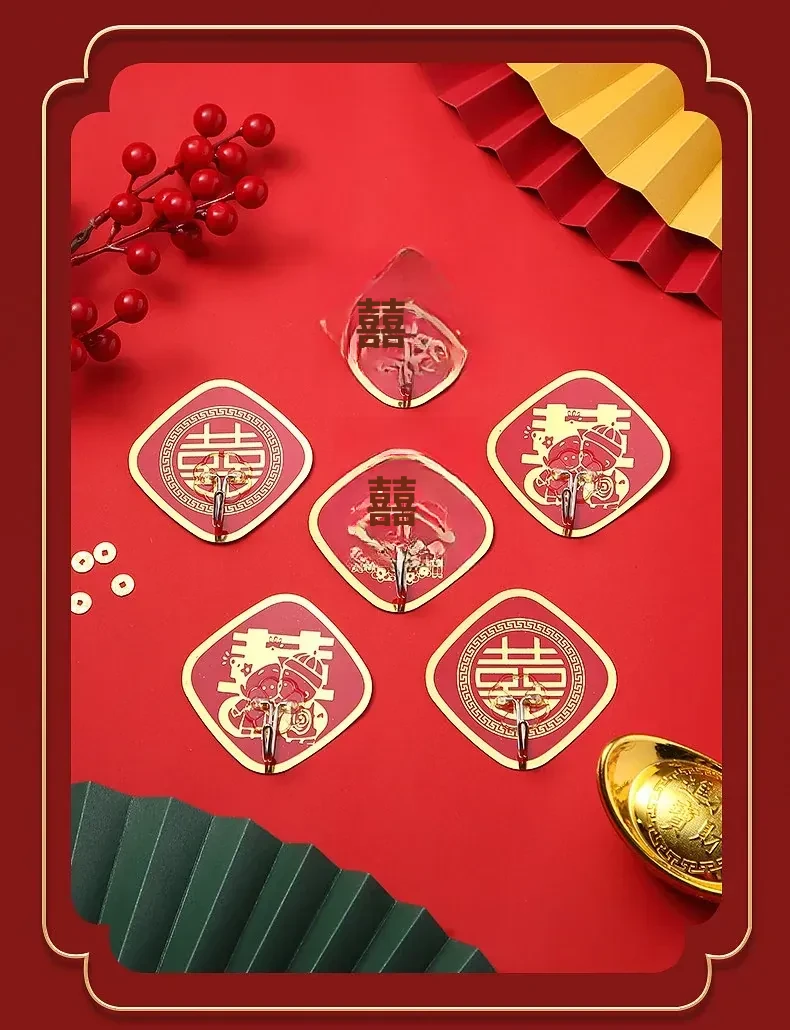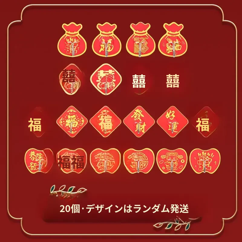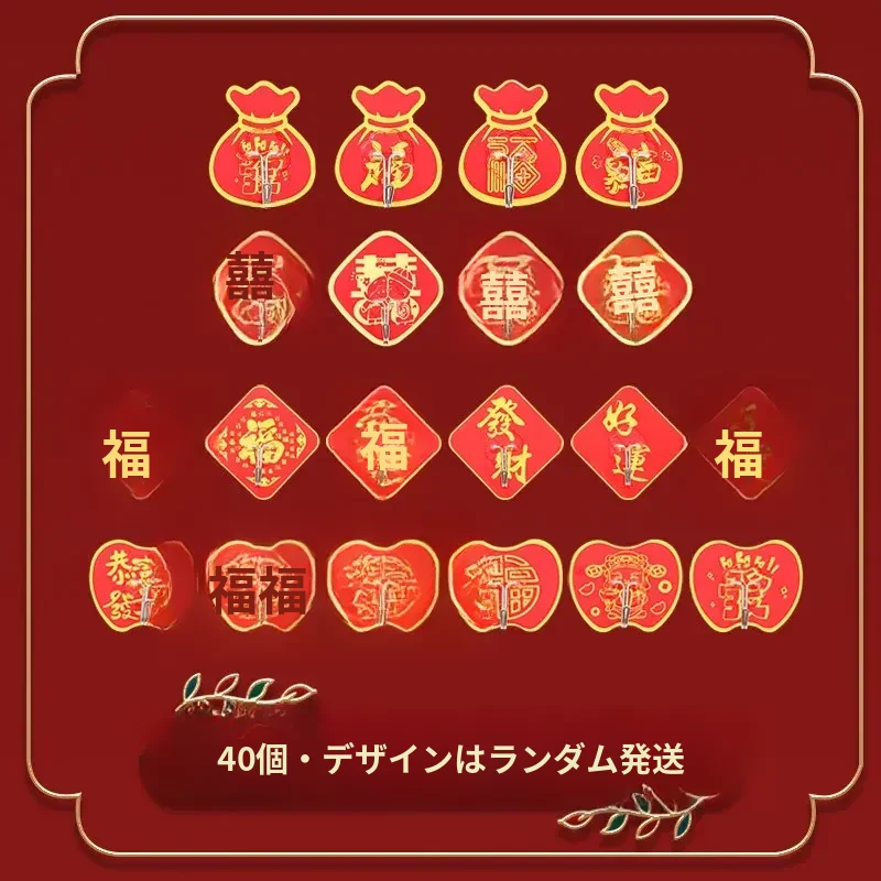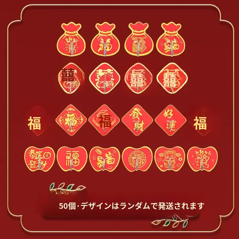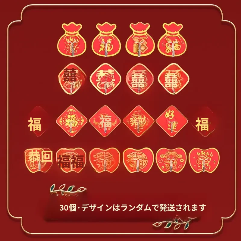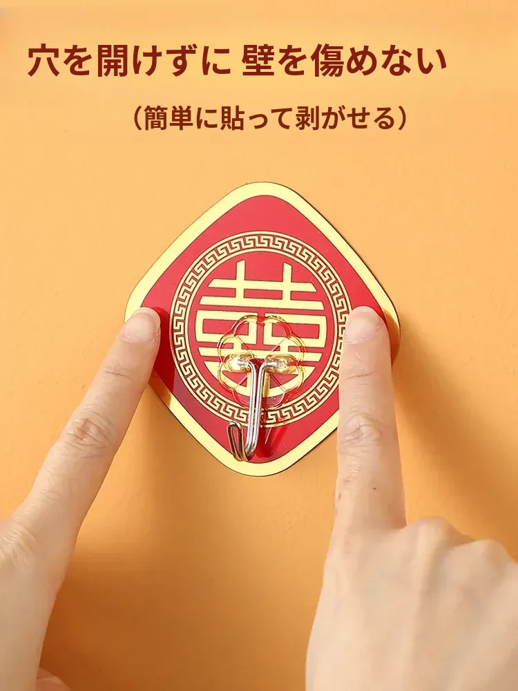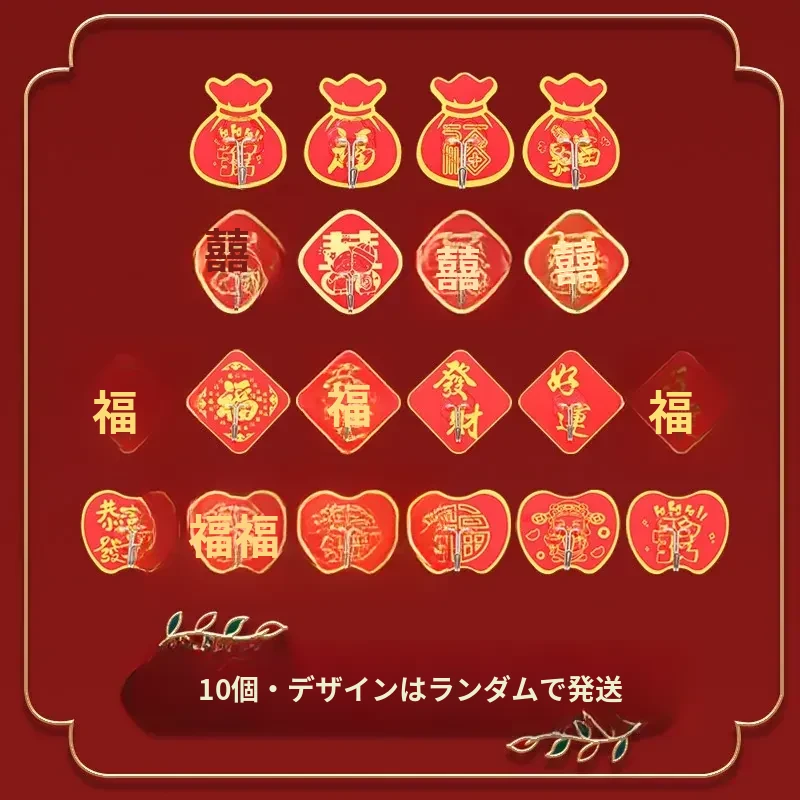 新年を祝う!福字デザインの強力粘着フック - 壁に穴を開けずに簡単取り付け、跡が残らない赤い粘着フックでおしゃれに飾ろう!