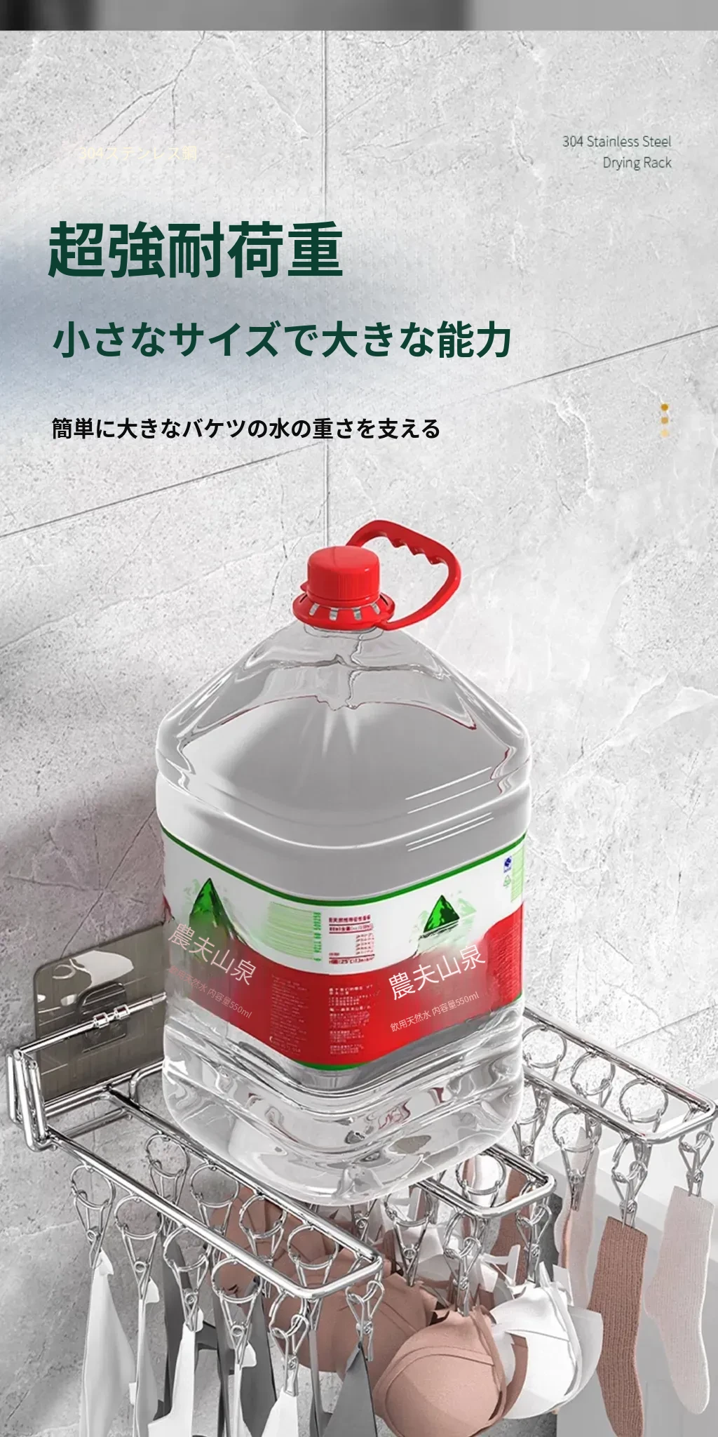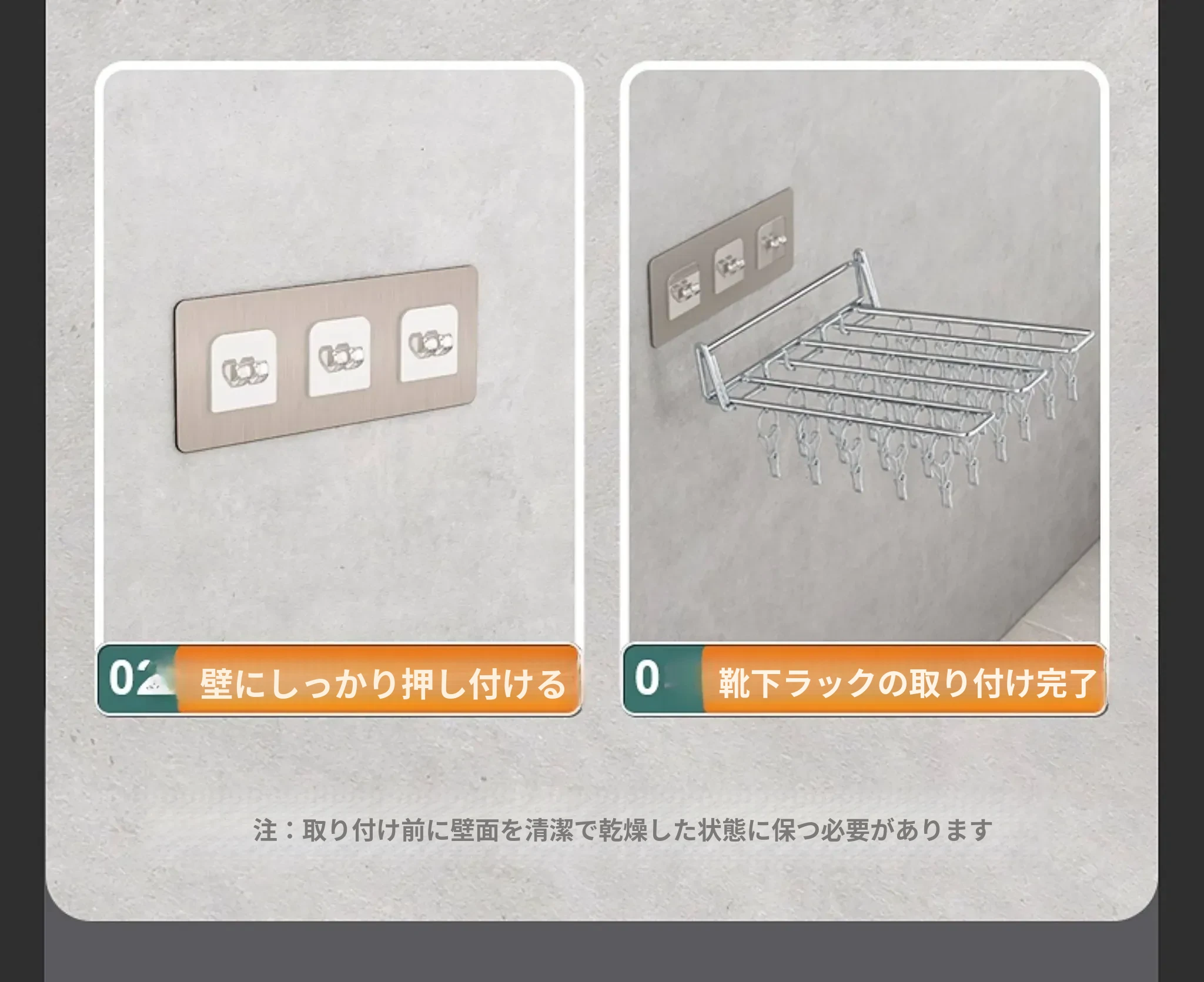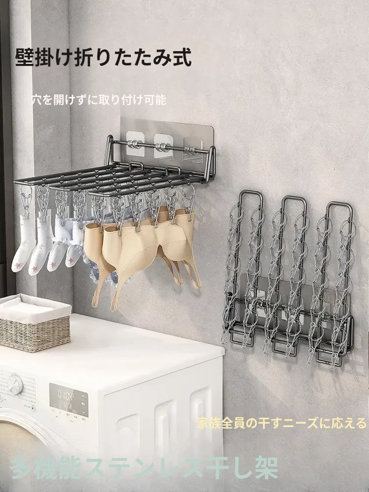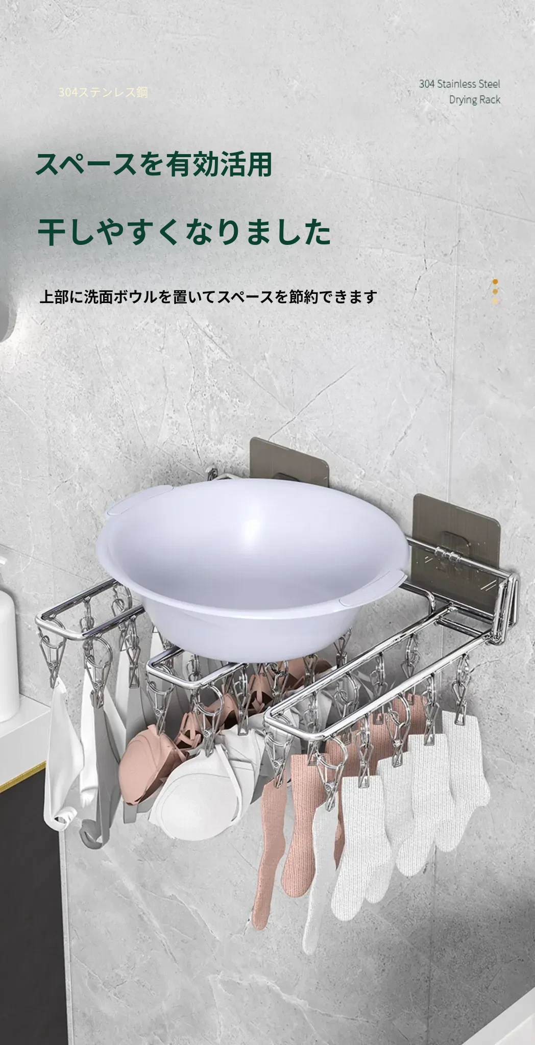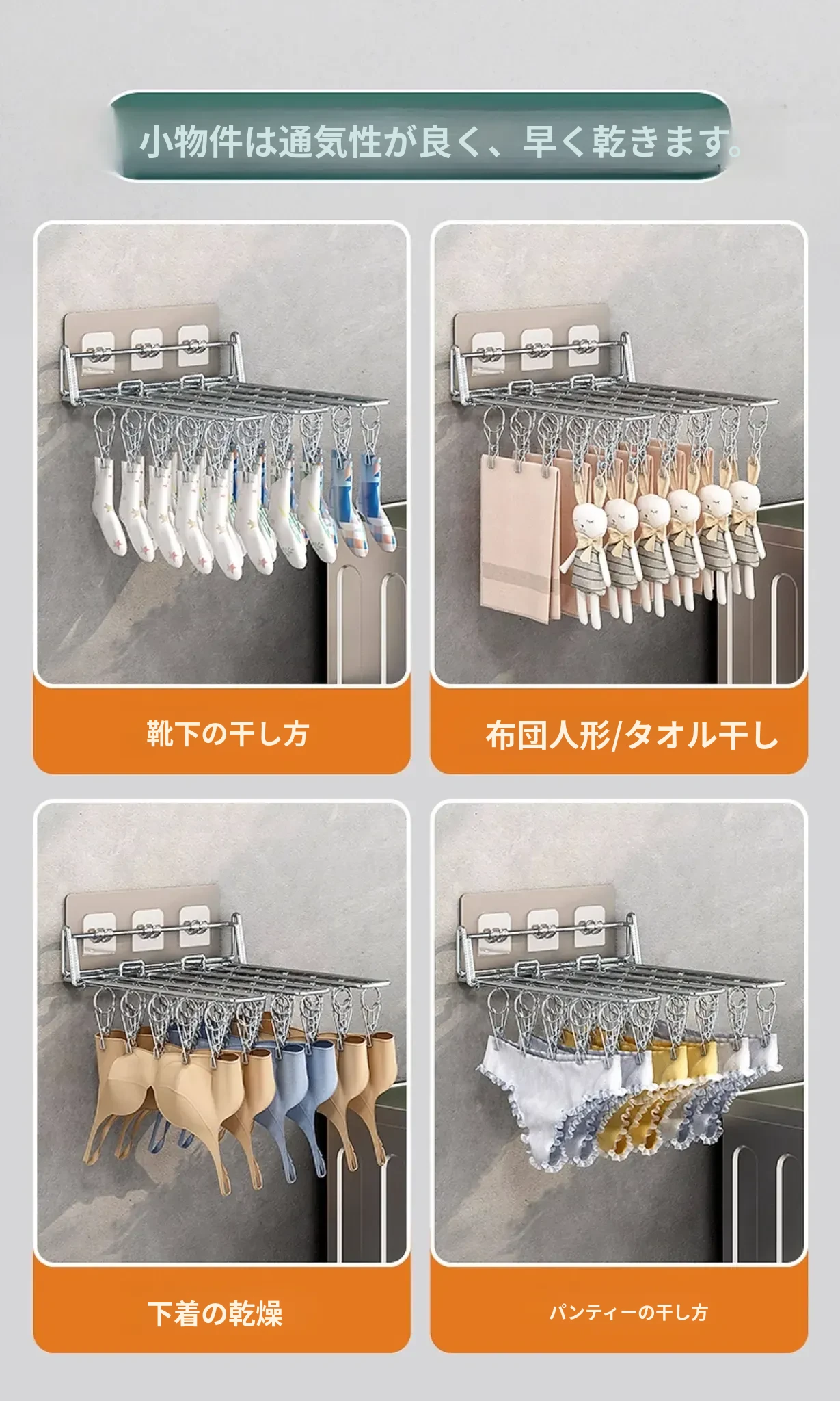 折りたたみ式ハンガー 多機能クリップ付き 壁掛けタイプ 穴あけ不要 バルコニーや浴室で大活躍!下着や靴下をスマートに干せる便利グッズ!