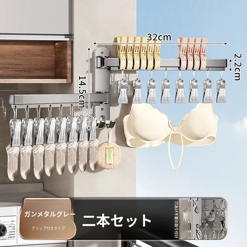 2個セット-ガン灰⭐【16クリップ】ダブルポール⭐折りたたみ靴下ラック