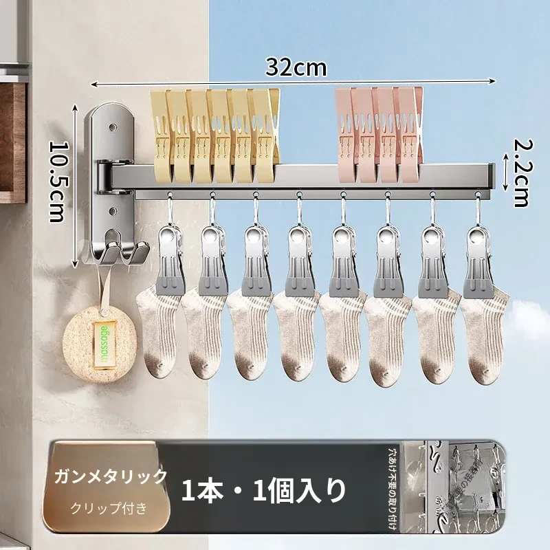 ガン灰⭐【8クリップ】シングルポール⭐折りたたみ靴下ラック