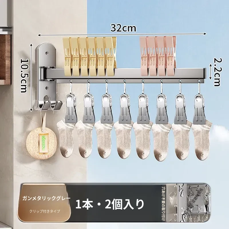 2個セット-ガン灰⭐【8クリップ】シングルポール⭐折りたたみ靴下ラック