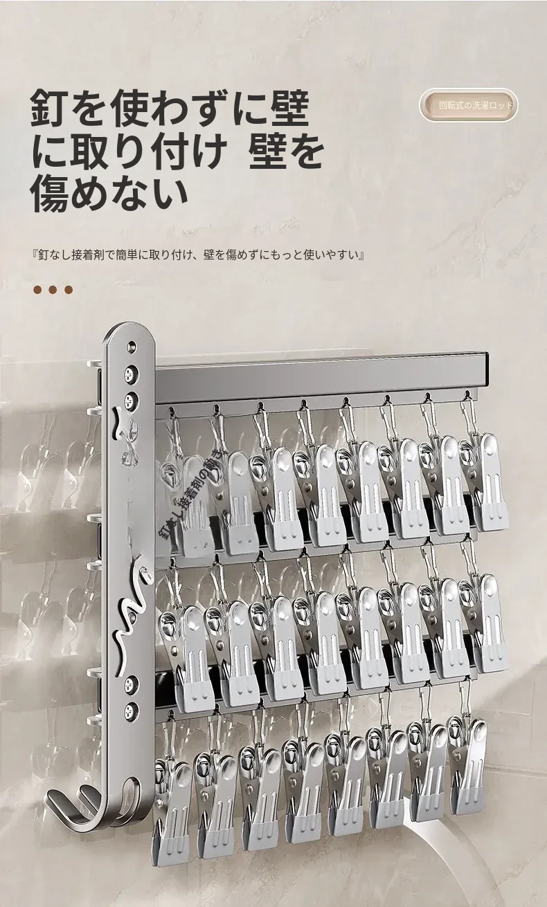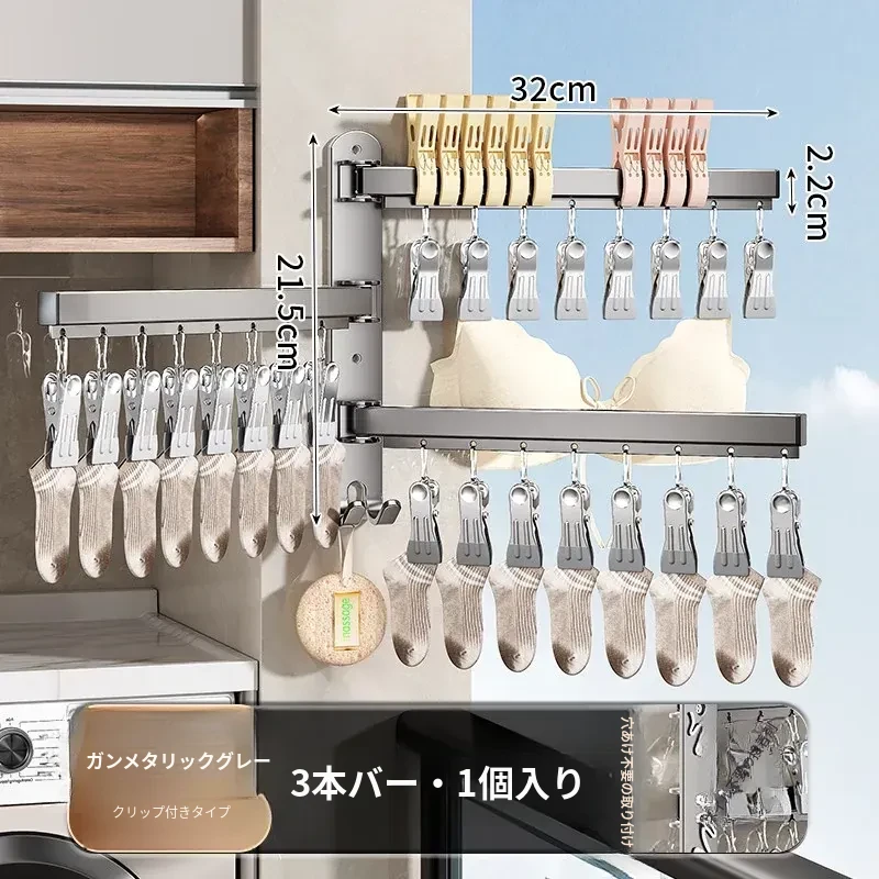 ガン灰⭐【24クリップ】トリプルポール⭐折りたたみ靴下ラック