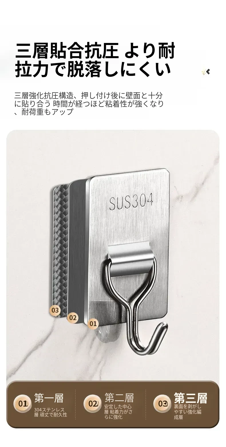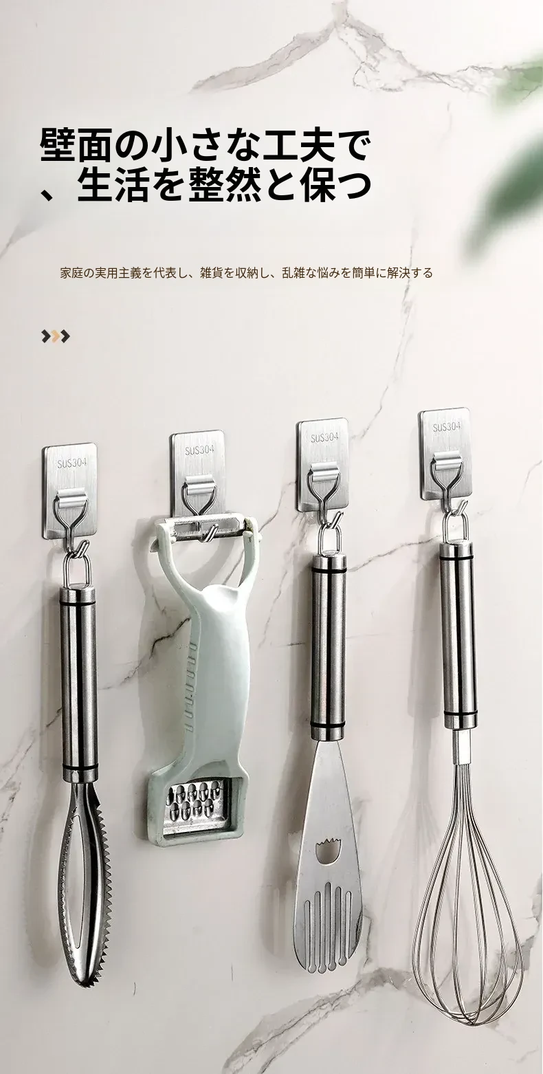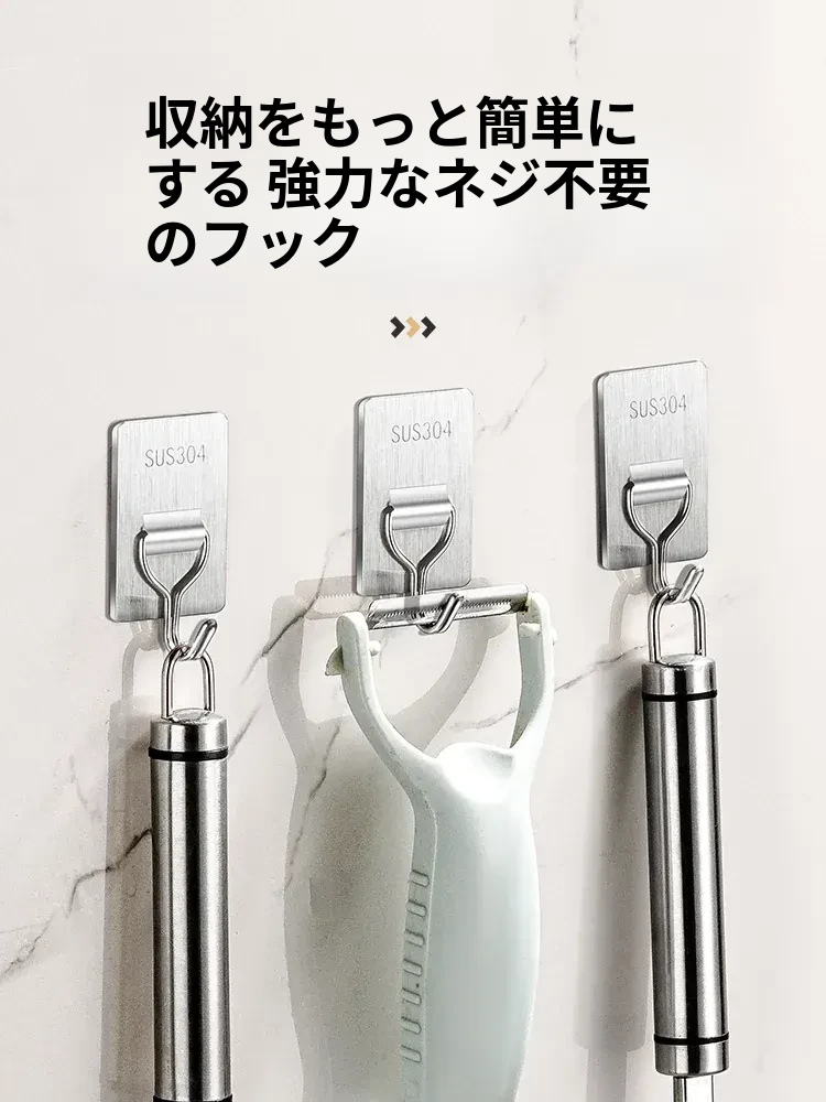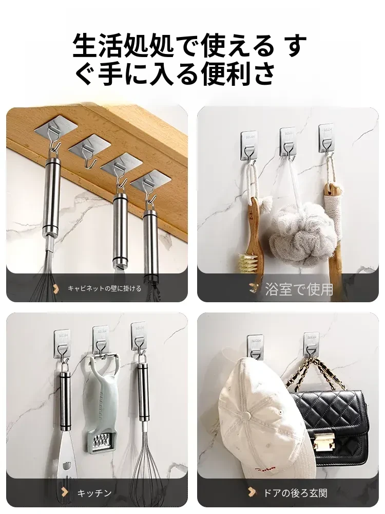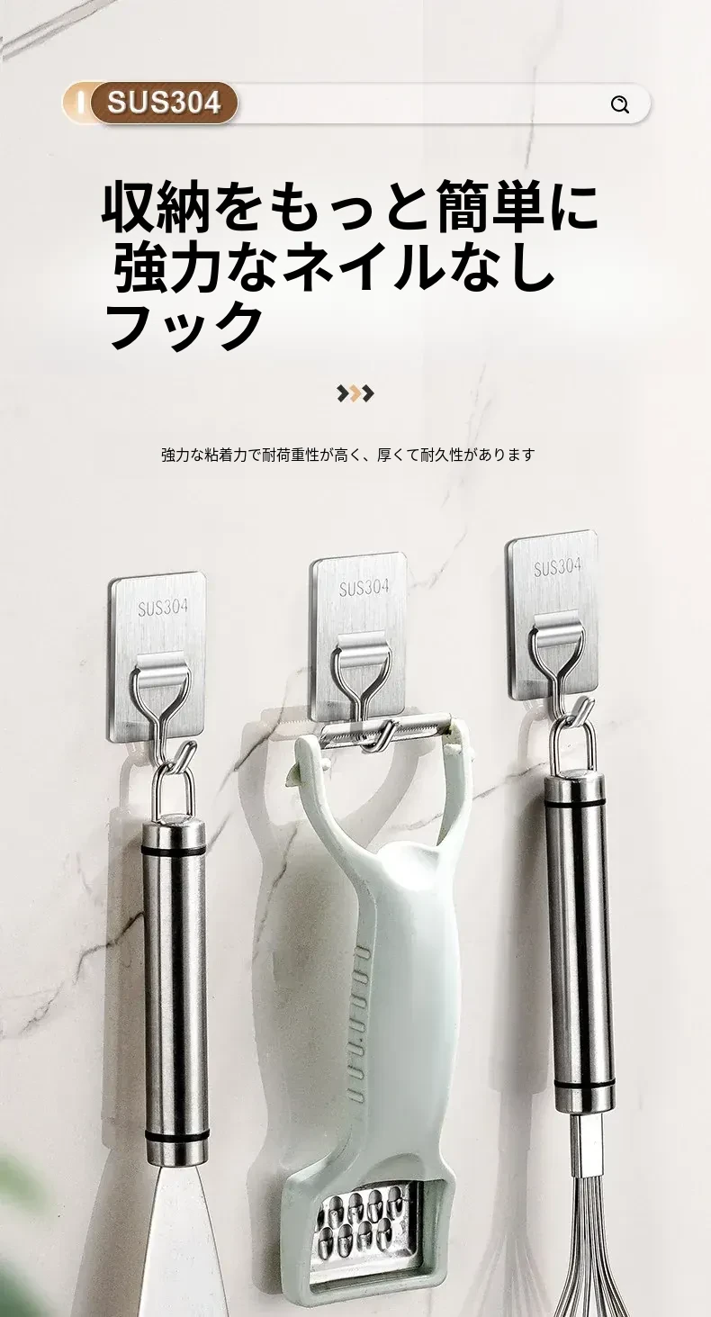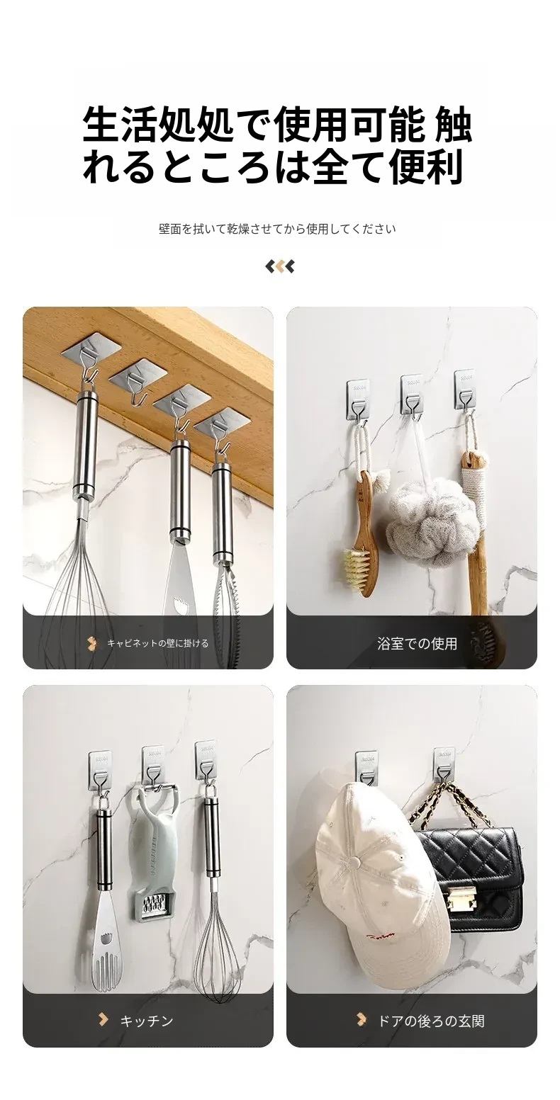 強力粘着フック - 取付け簡単!キッチンやバスルームの壁に穴を開けずに貼れる無痕フック。ステンレス製で耐久性抜群、重さもしっかり支えます!あなたの収納をもっと便利に!