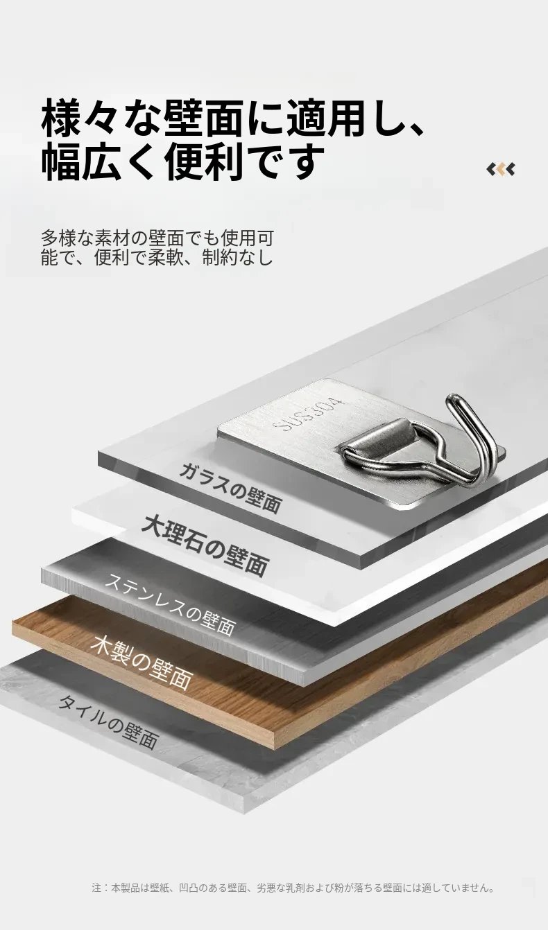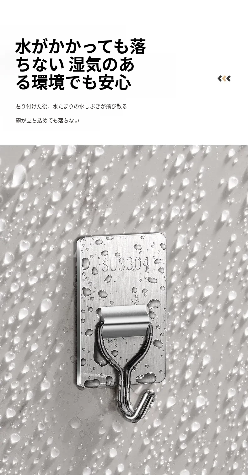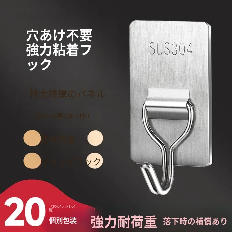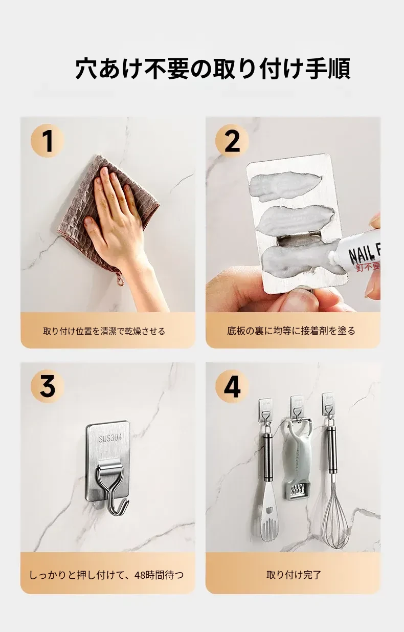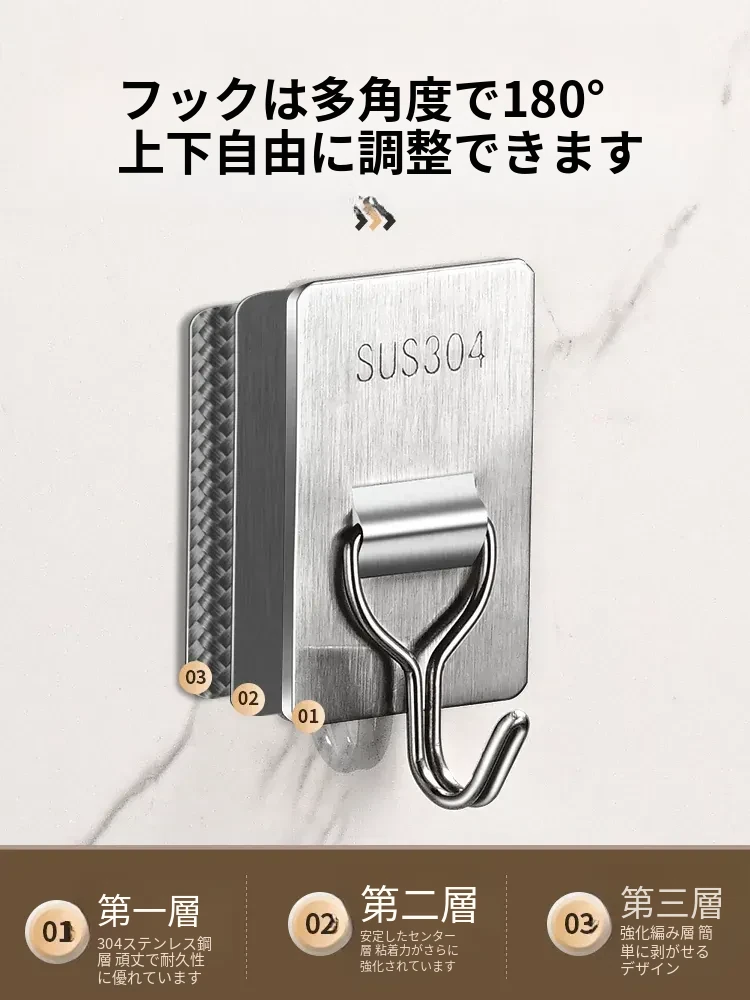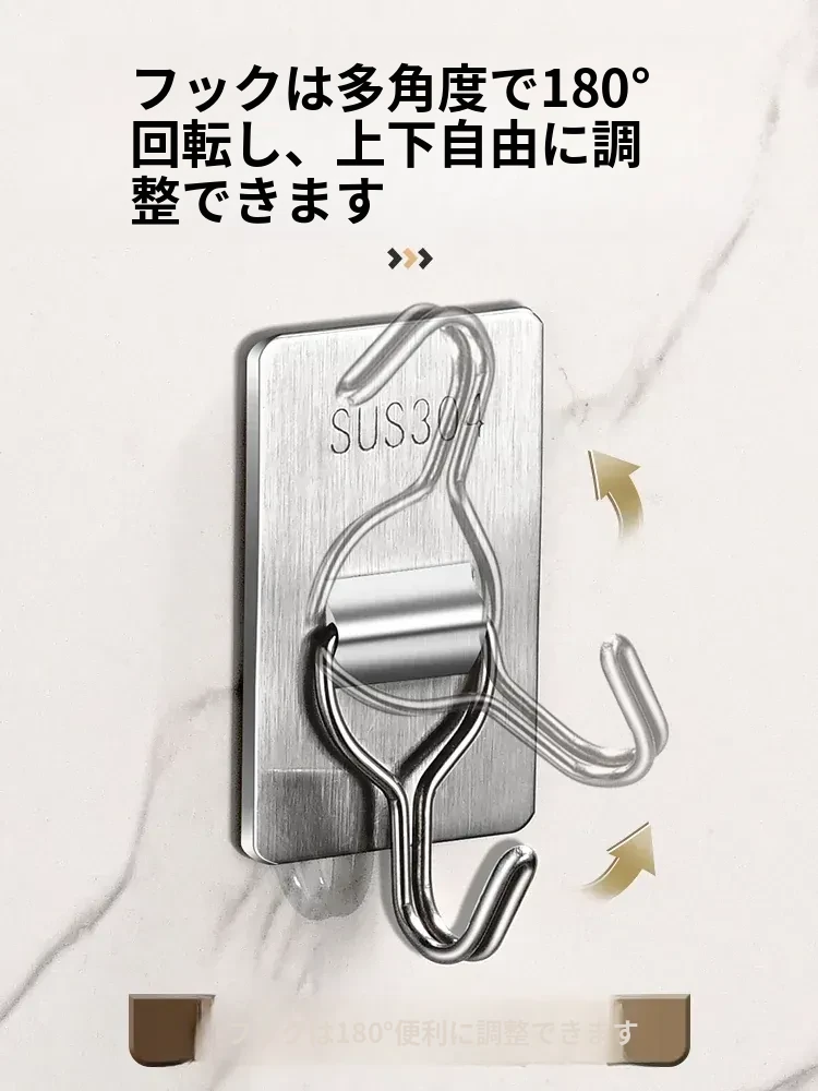 強力粘着フック - 取付け簡単!キッチンやバスルームの壁に穴を開けずに貼れる無痕フック。ステンレス製で耐久性抜群、重さもしっかり支えます!あなたの収納をもっと便利に!