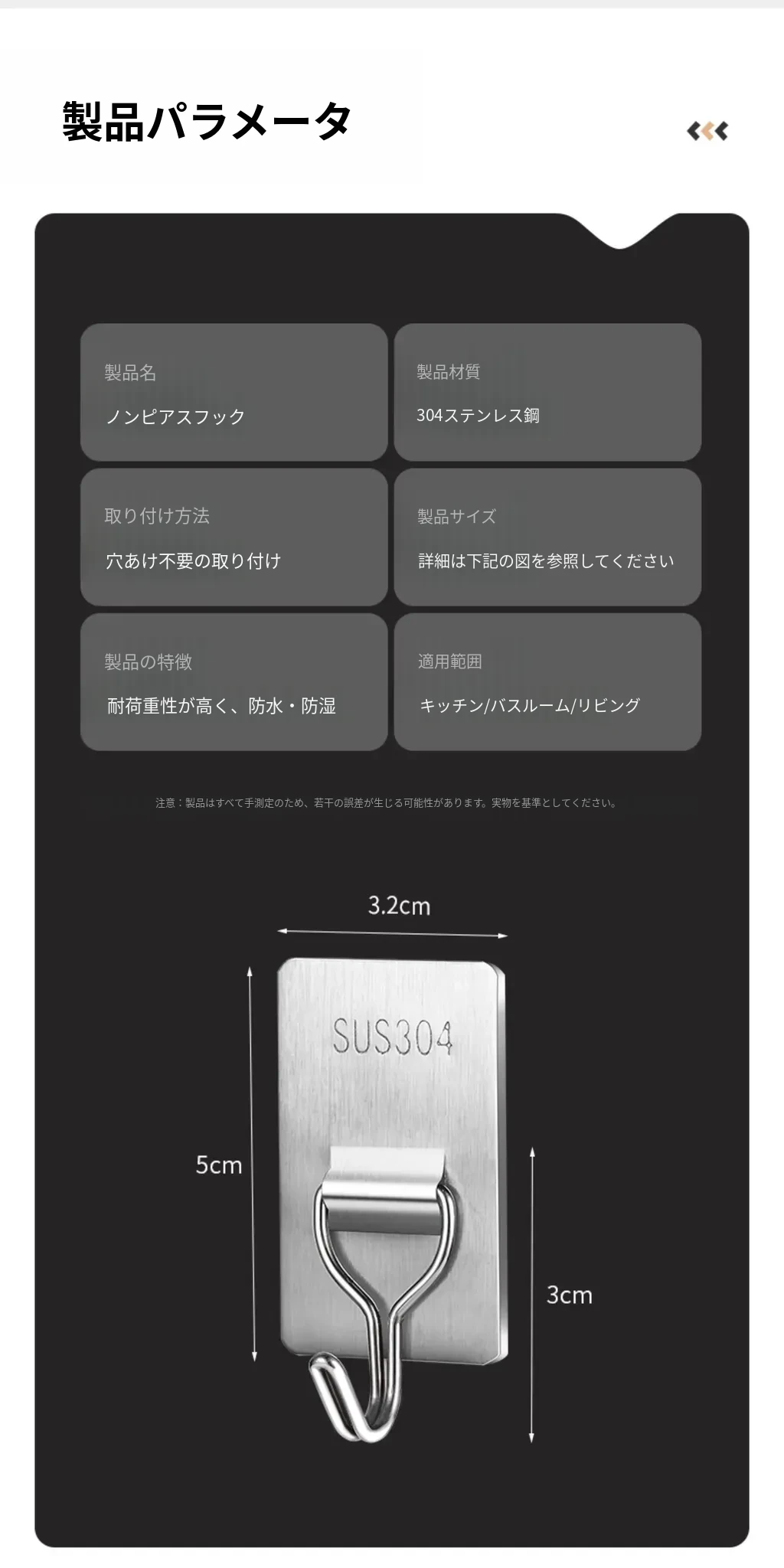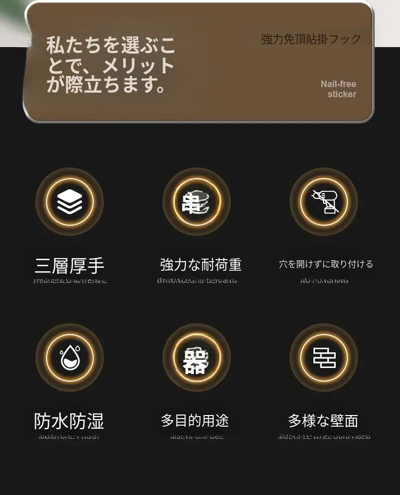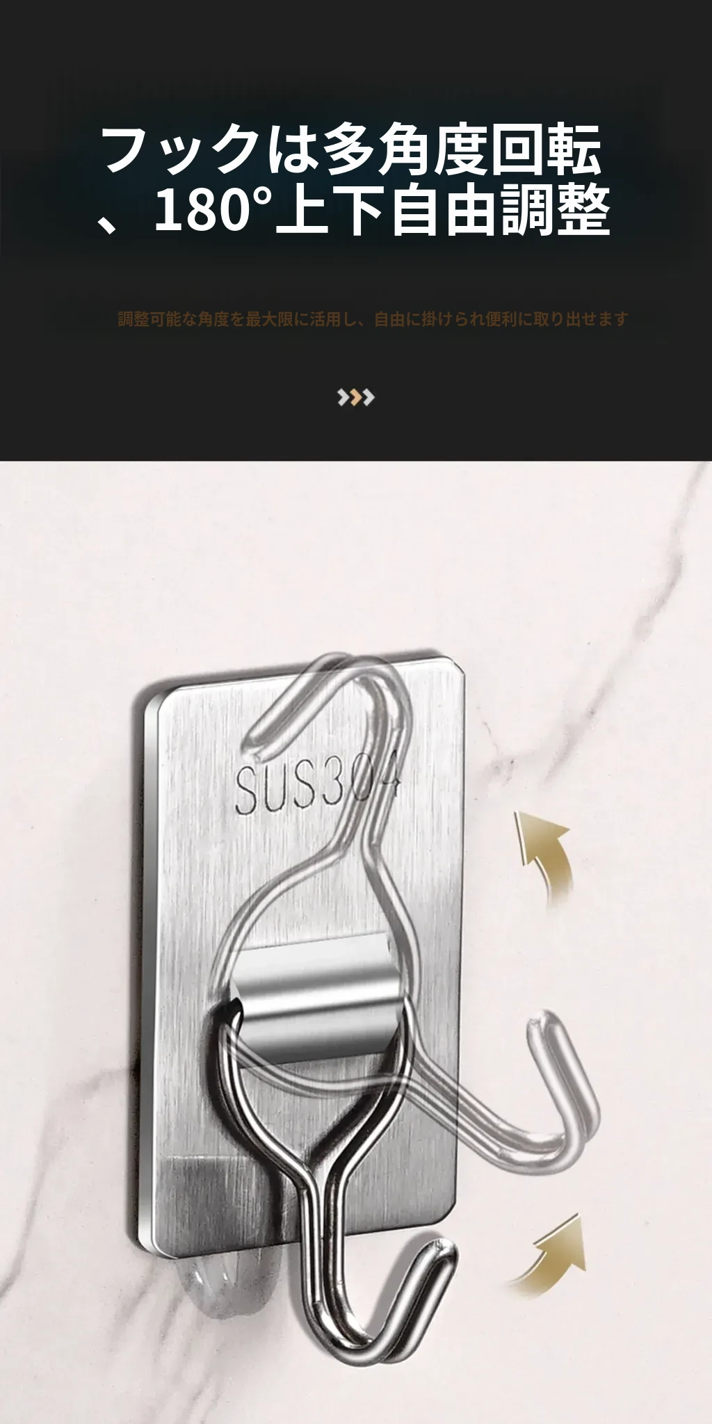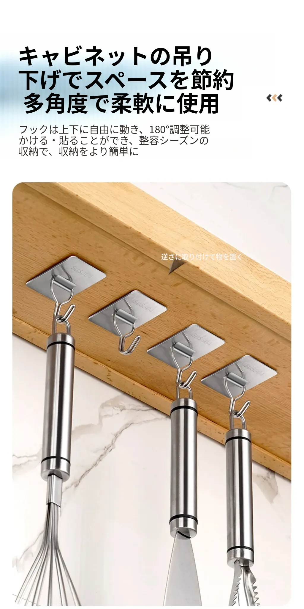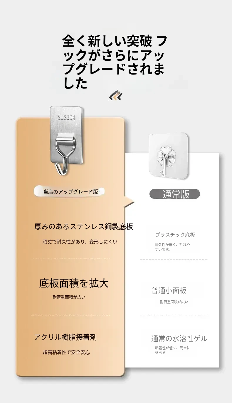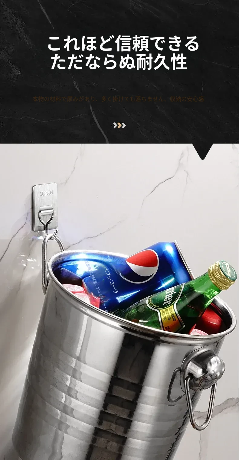 強力粘着フック - 取付け簡単!キッチンやバスルームの壁に穴を開けずに貼れる無痕フック。ステンレス製で耐久性抜群、重さもしっかり支えます!あなたの収納をもっと便利に!