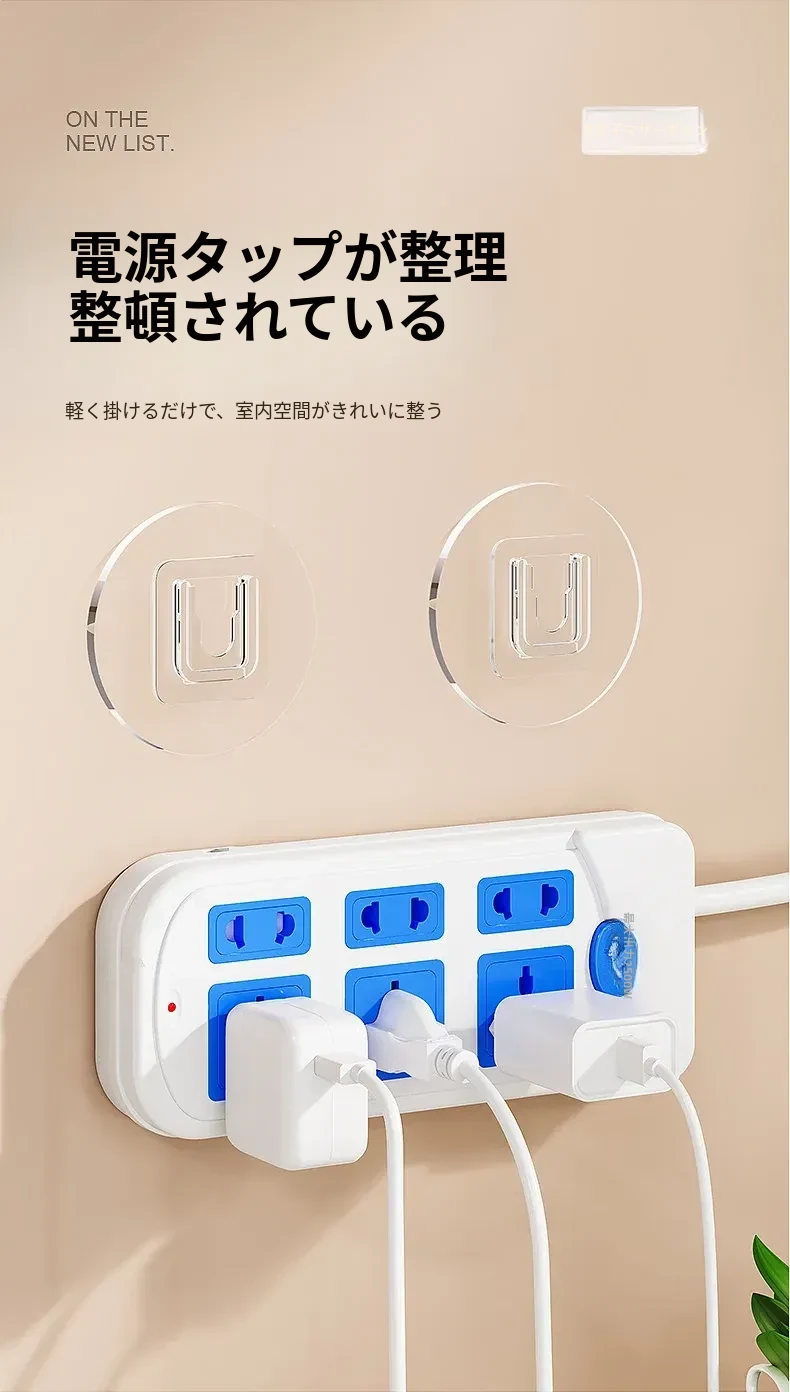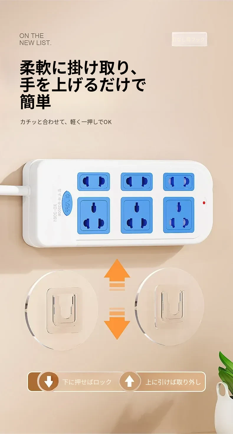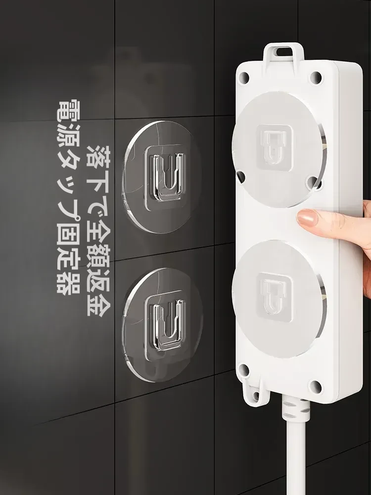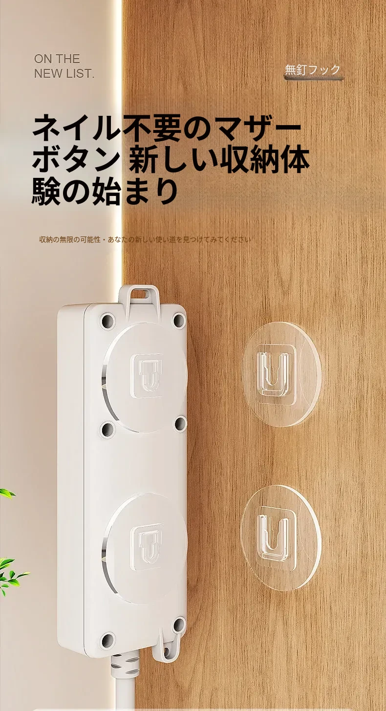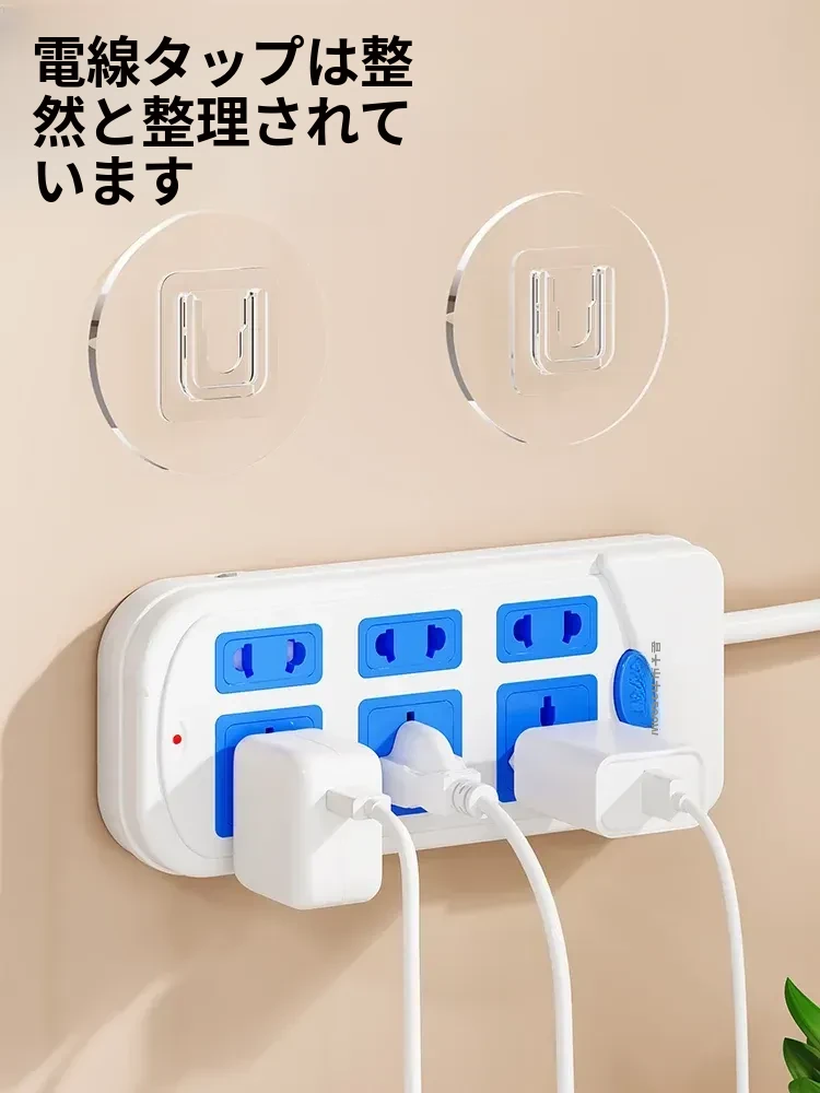 強力で厚みのある子母クリップ、ネジ不要のフック付きコンセント固定器!壁に傷をつけず、簡単に取り付け可能。お部屋をスッキリ整理整頓!