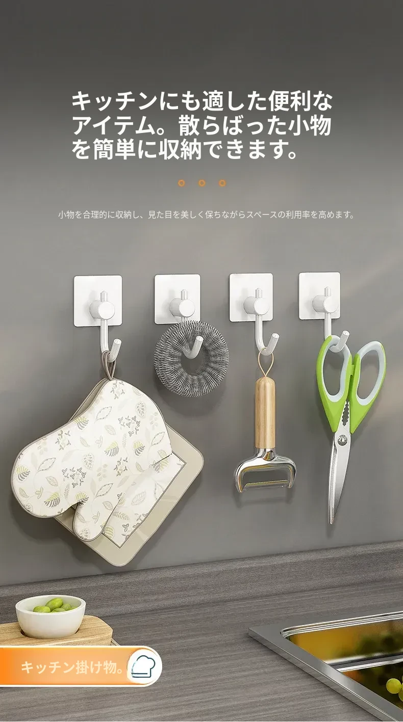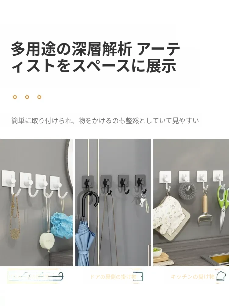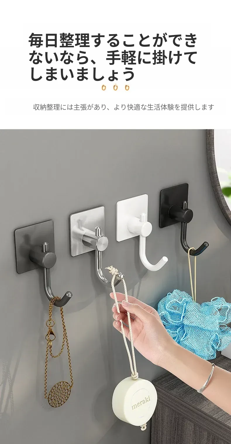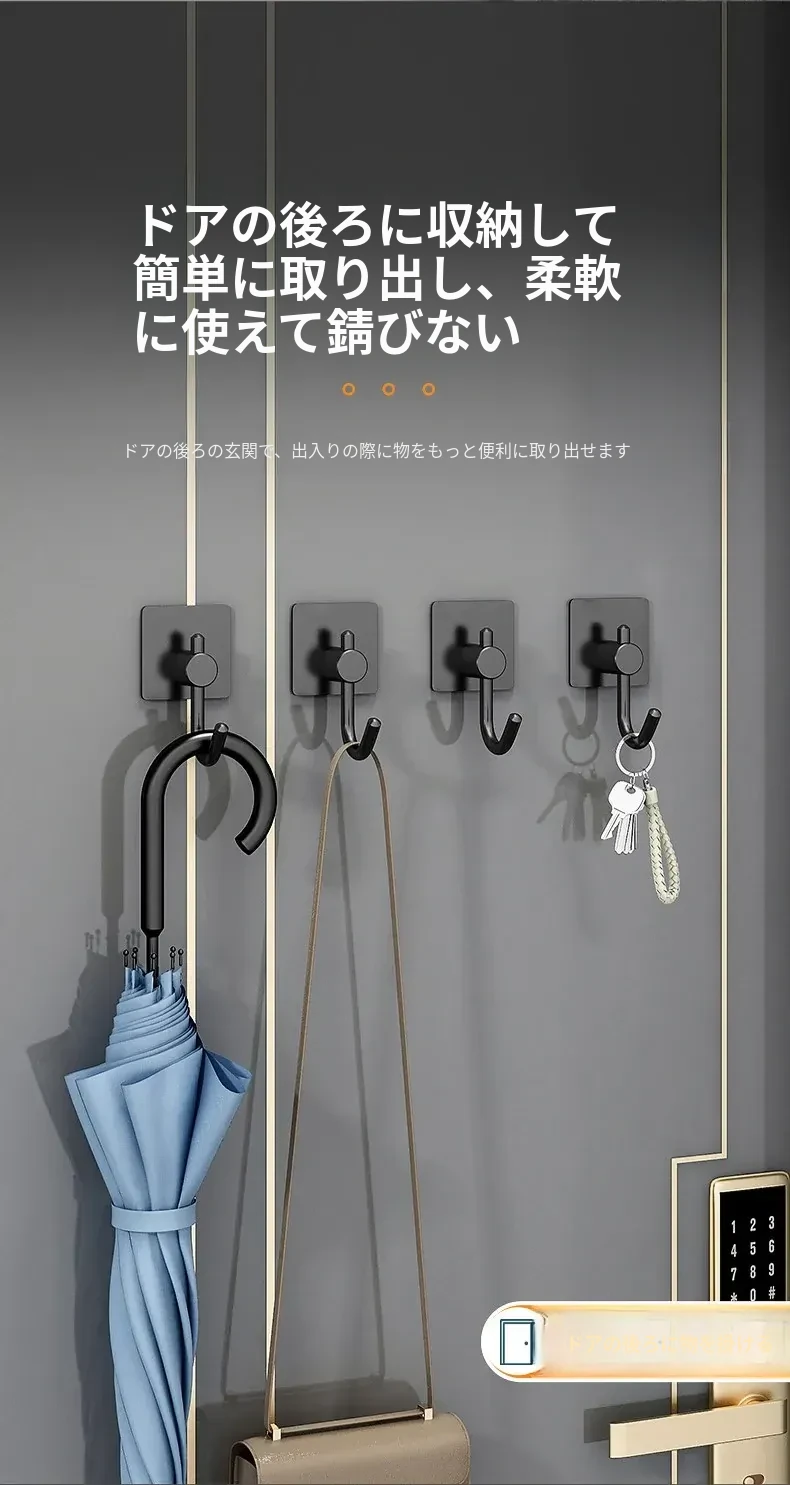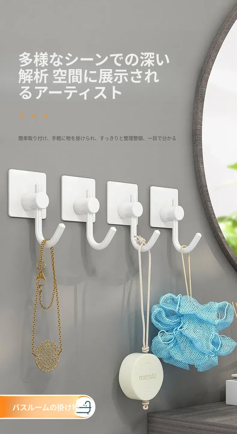 強力粘着フック - 穴あけ不要!壁に傷をつけずに簡単取り付け、衣類やキッチン用品をしっかり収納。無痕で美しい仕上がり、玄関やドア裏にもピッタリ!あなたの生活を便利にする必需品です。