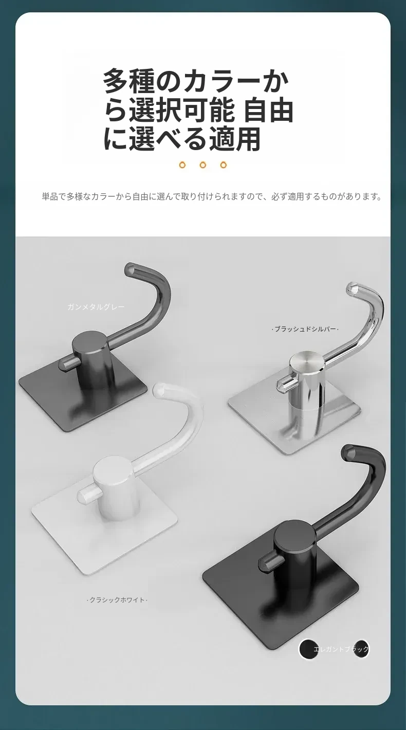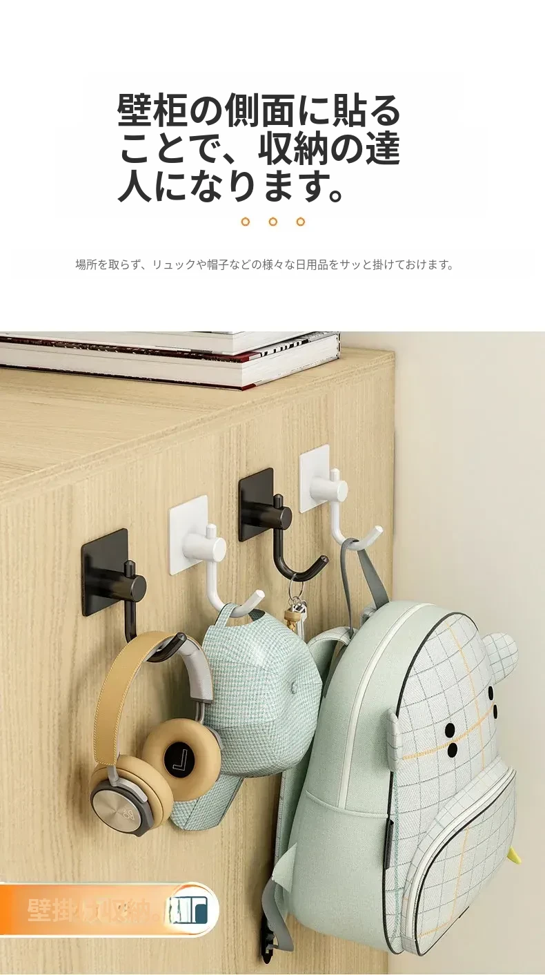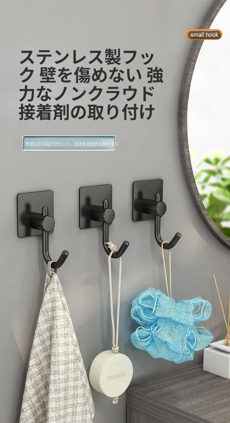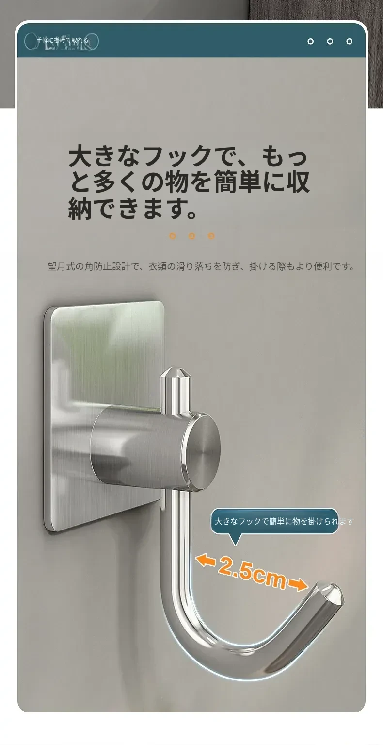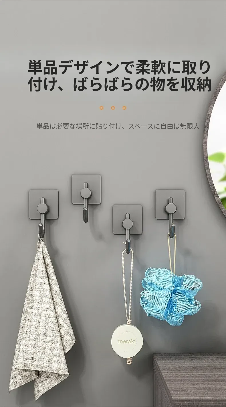 強力粘着フック - 穴あけ不要!壁に傷をつけずに簡単取り付け、衣類やキッチン用品をしっかり収納。無痕で美しい仕上がり、玄関やドア裏にもピッタリ!あなたの生活を便利にする必需品です。