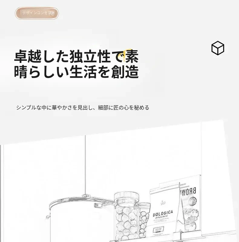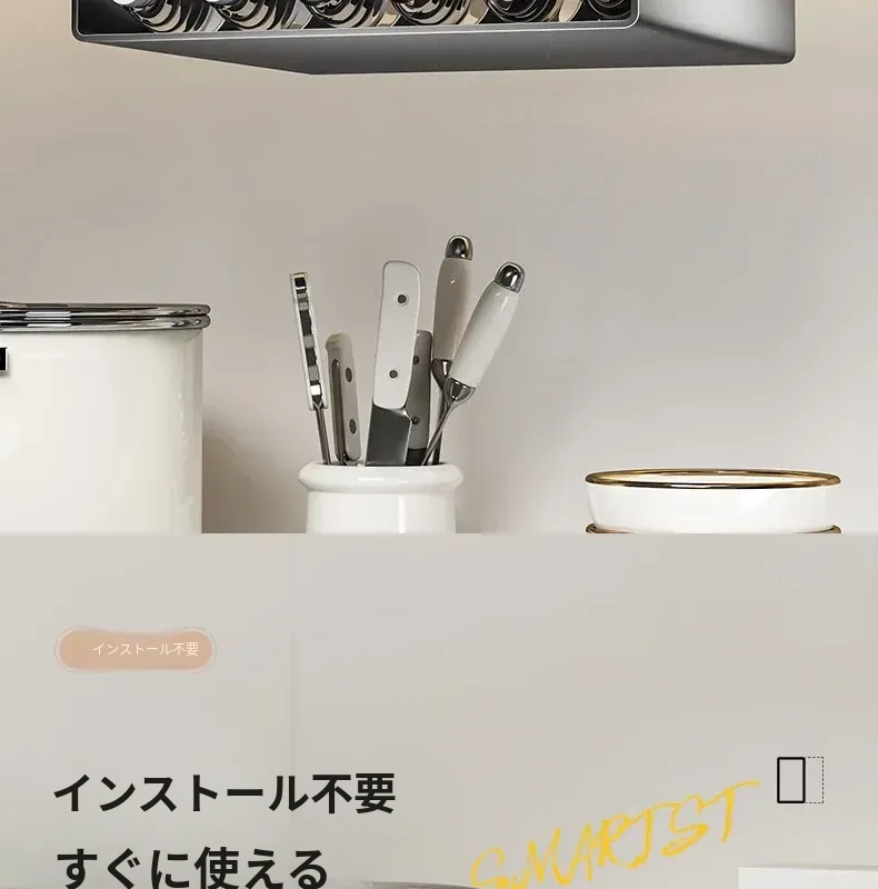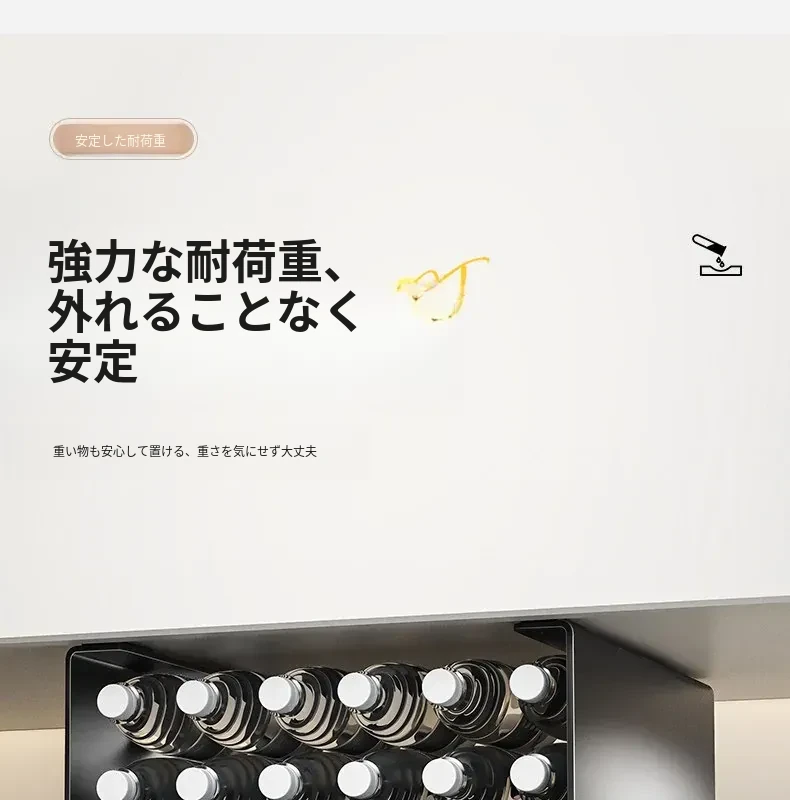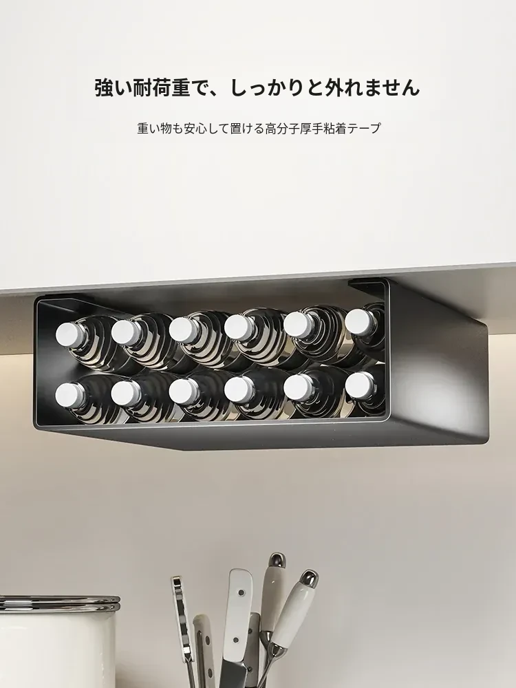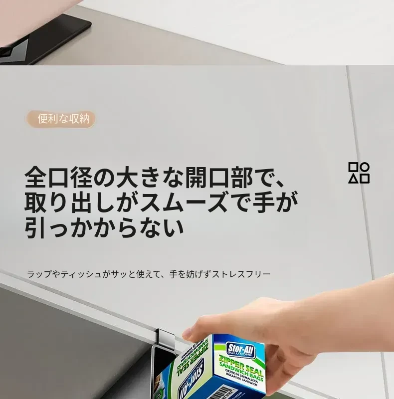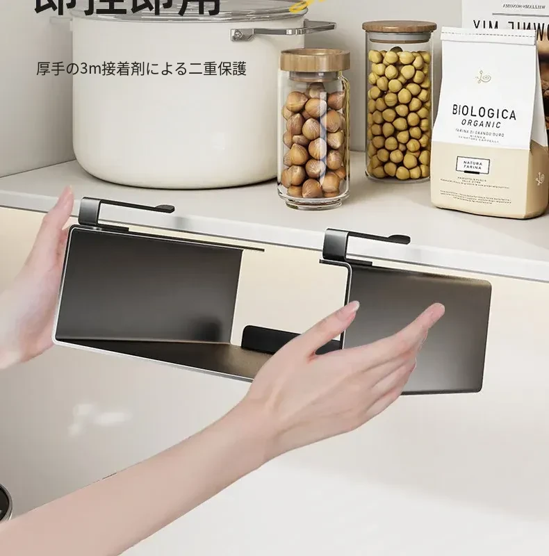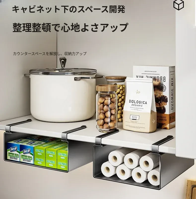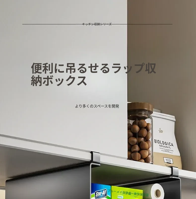 キッチンキャビネット用収納ラック!下段の吊り下げバスケットで、便利に整理整頓!ラップや袋もスッキリ収納できる、スペースを有効活用する魔法のアイテム!