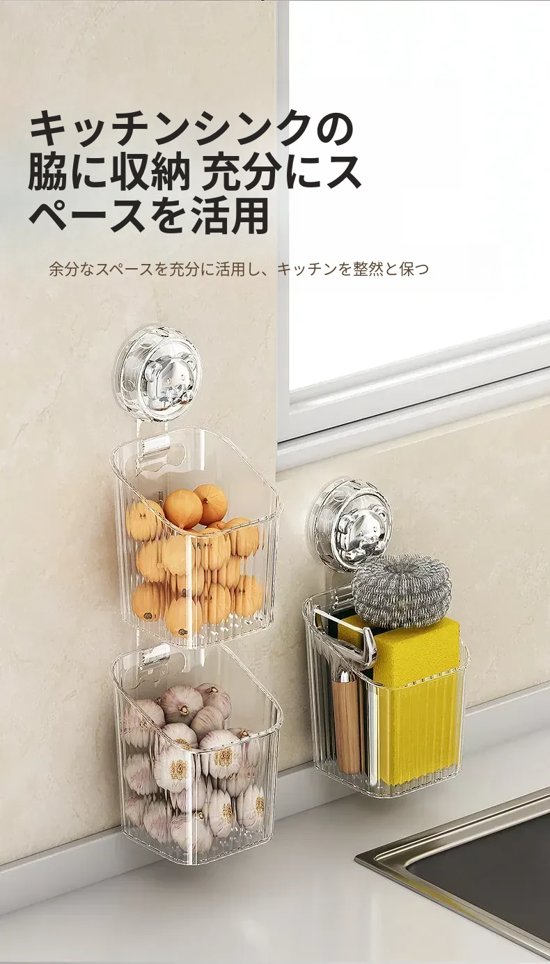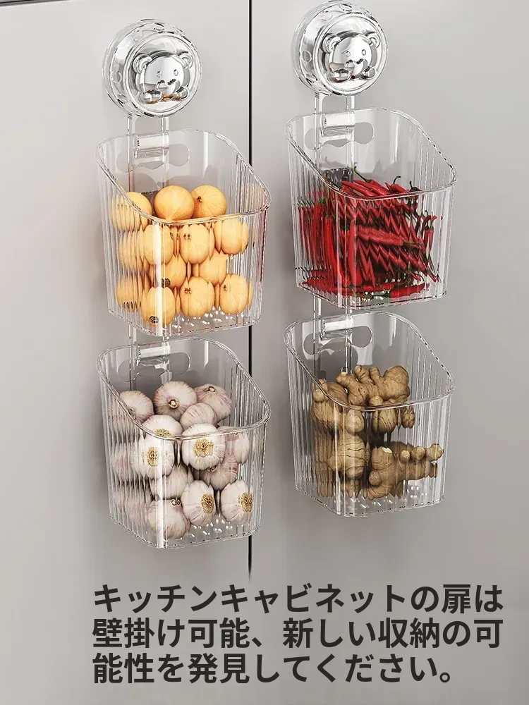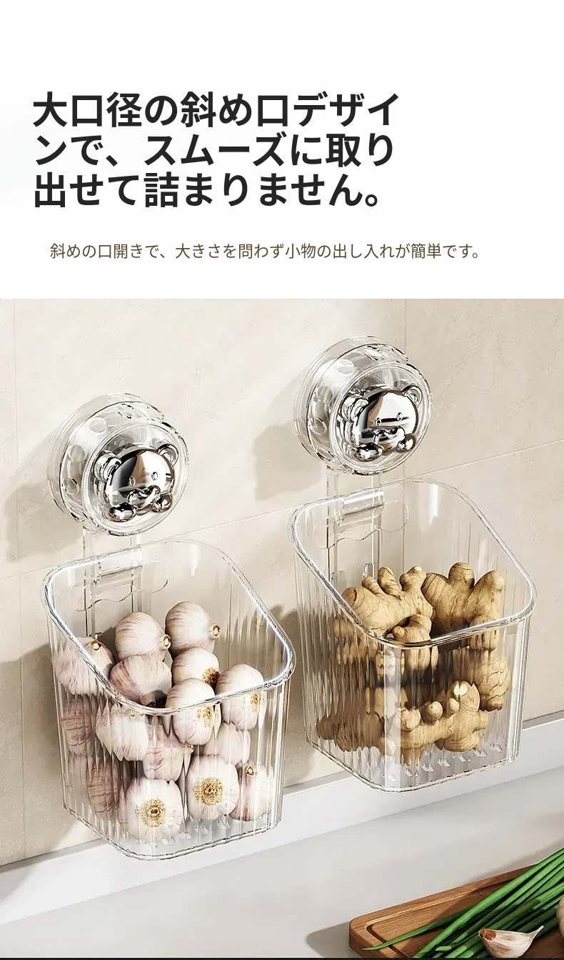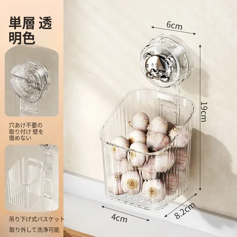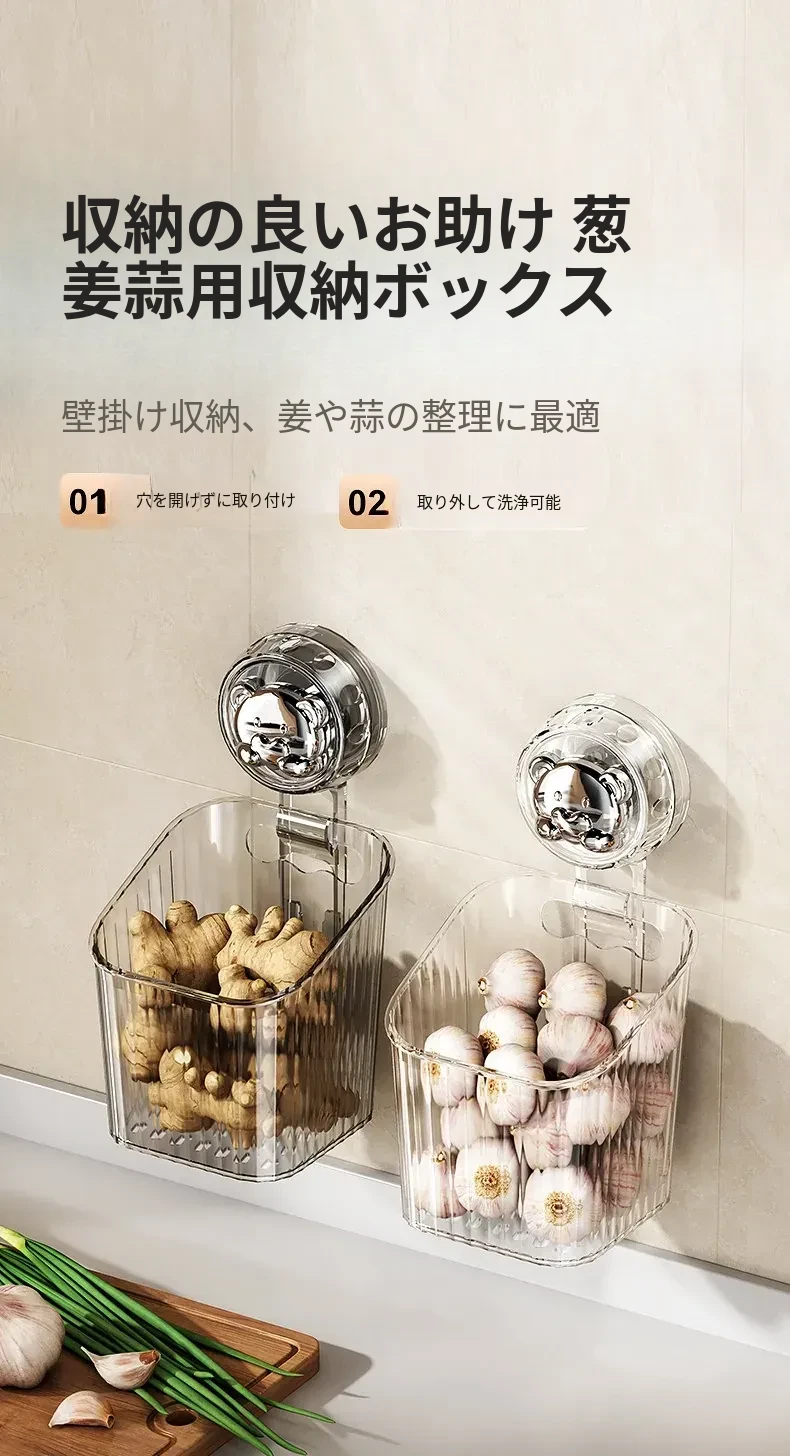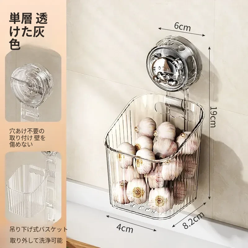 キッチン吸盤収納ラック 壁掛け葱・生姜・ニンニク収納ボックス 大蒜・生姜整理に最適な便利アイテム 穴を開けずに取り付け可能な調味料ハンギングバスケット