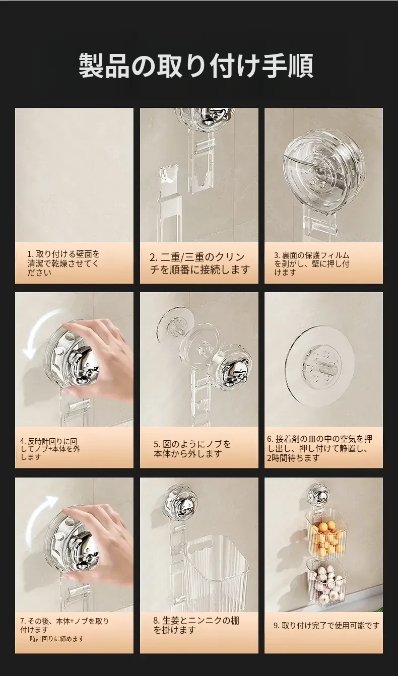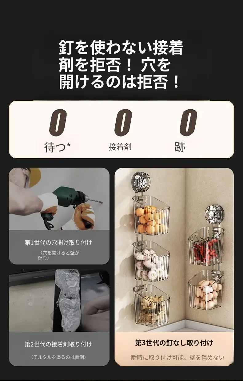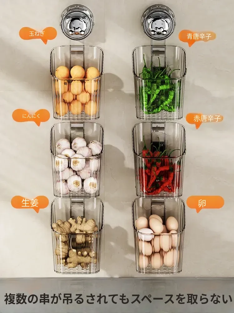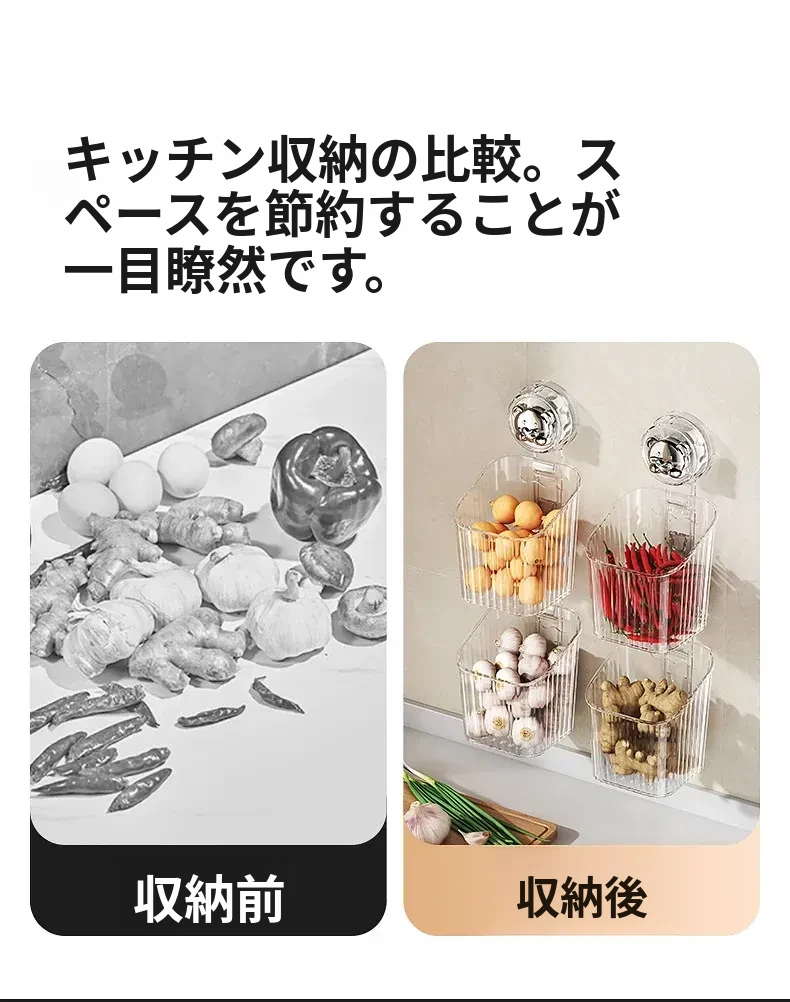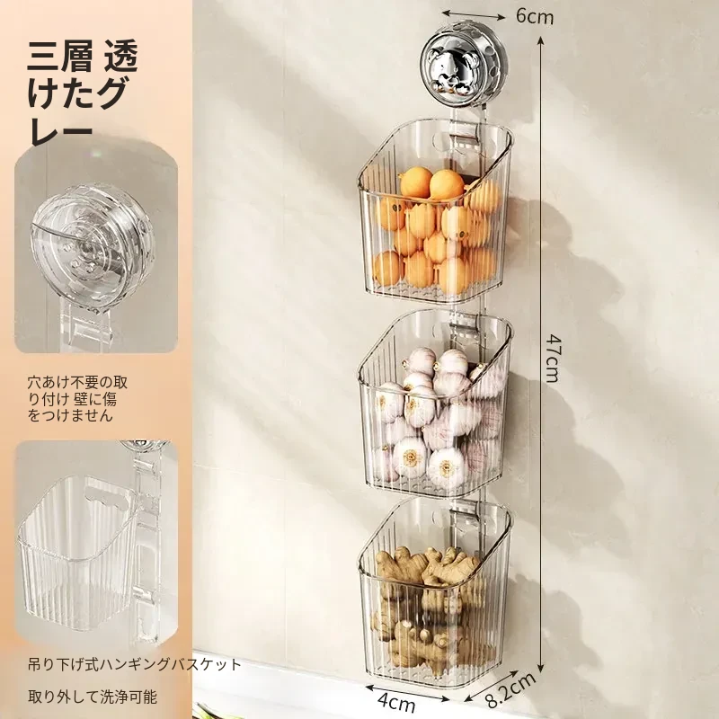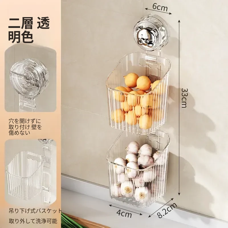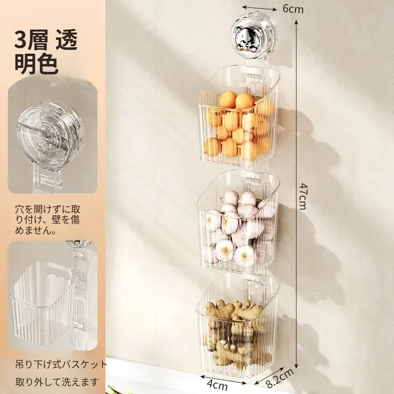 キッチン吸盤収納ラック 壁掛け葱・生姜・ニンニク収納ボックス 大蒜・生姜整理に最適な便利アイテム 穴を開けずに取り付け可能な調味料ハンギングバスケット