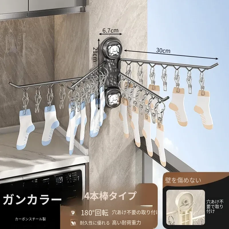 【ガンメタル】吸盤干しラック-4本●28クリップ