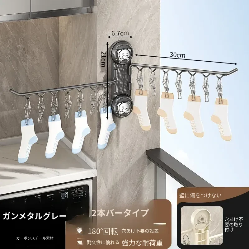 【ガンメタル】吸盤干しラック-2本●14クリップ