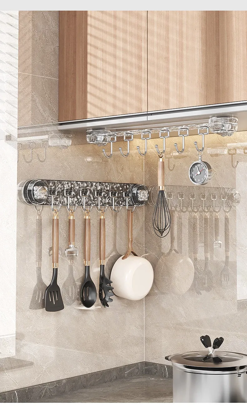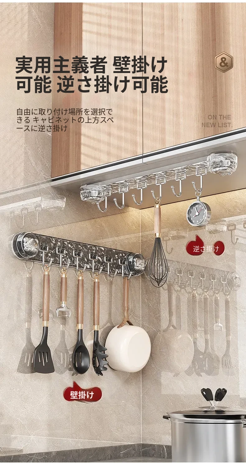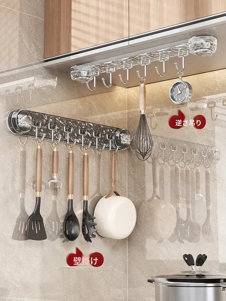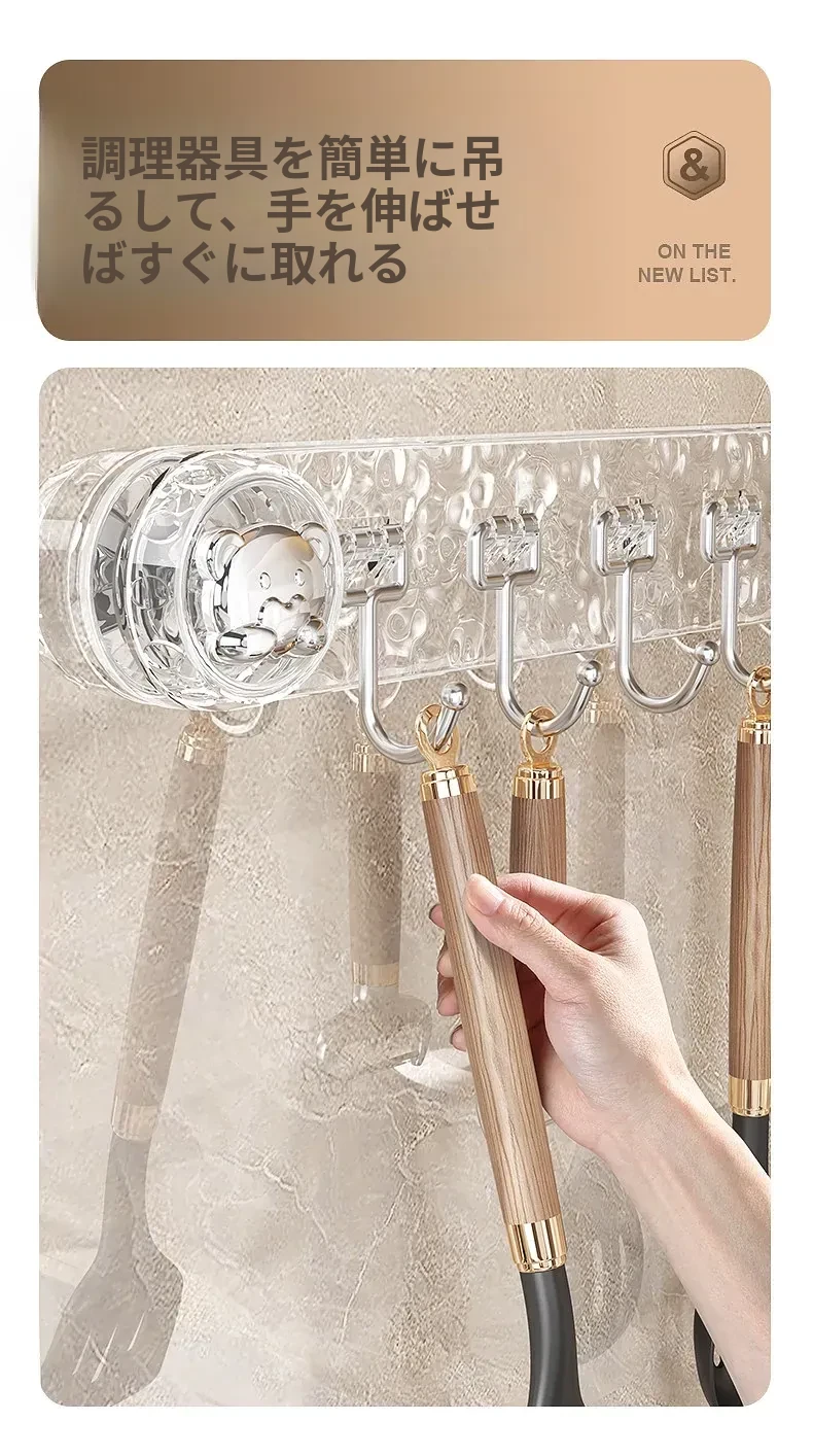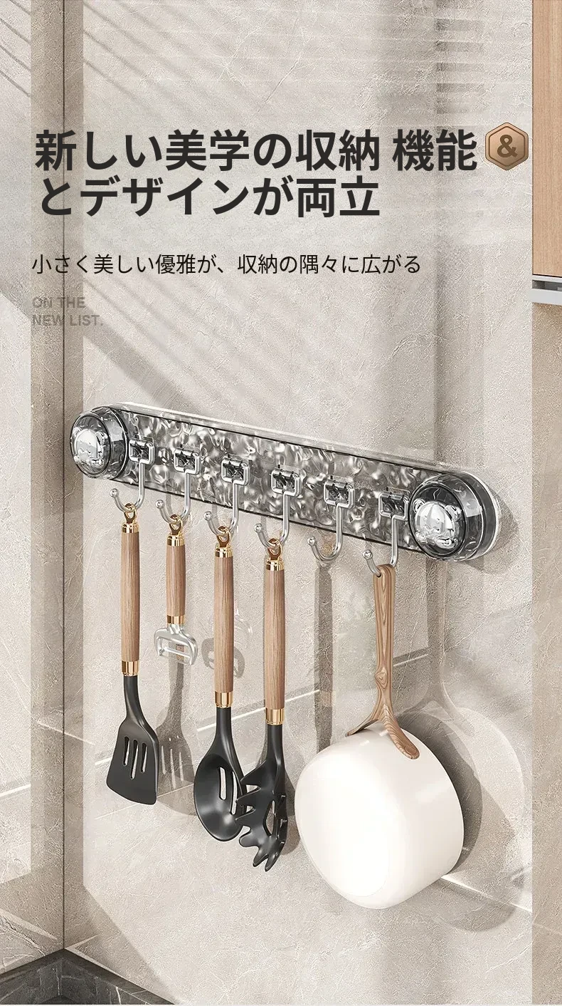 穴を開けずに取り付けられる多機能吸盤フック!キッチン用スプーンやヘラのための便利なウォールマウントフックラック。スッキリとしたデザインで、壁を傷めずに整理整頓。ご家庭のキッチンをもっと使いやすく!