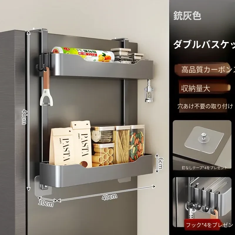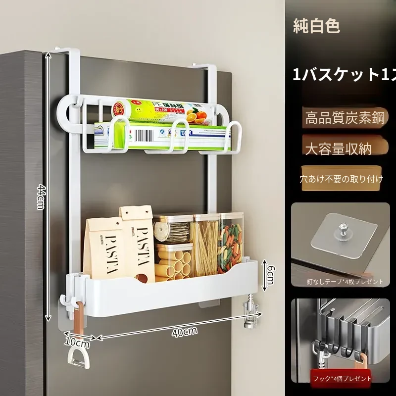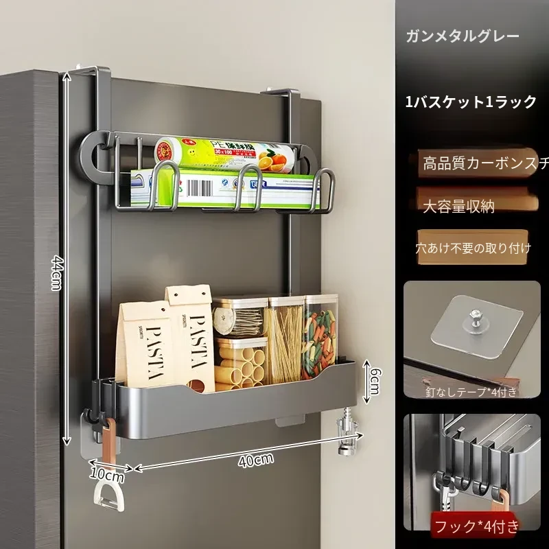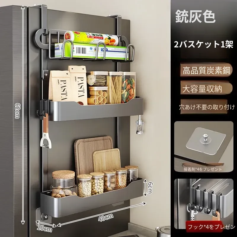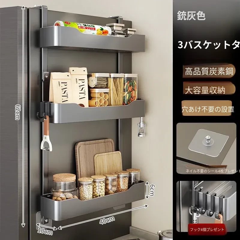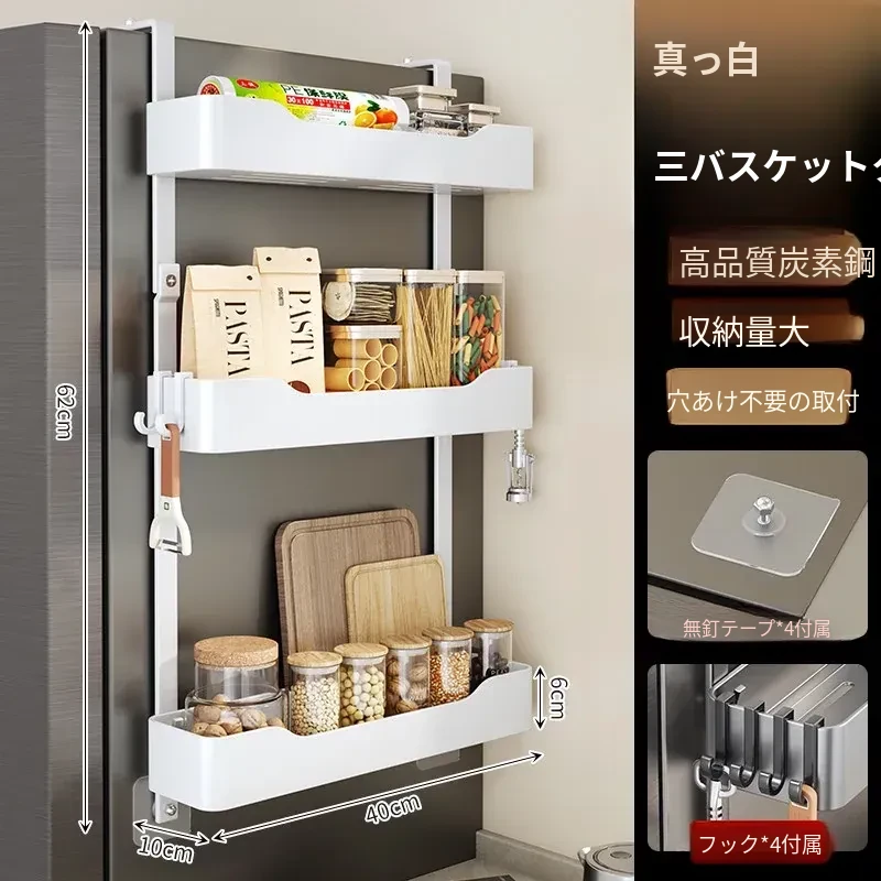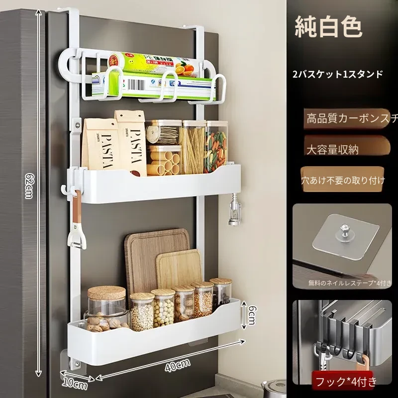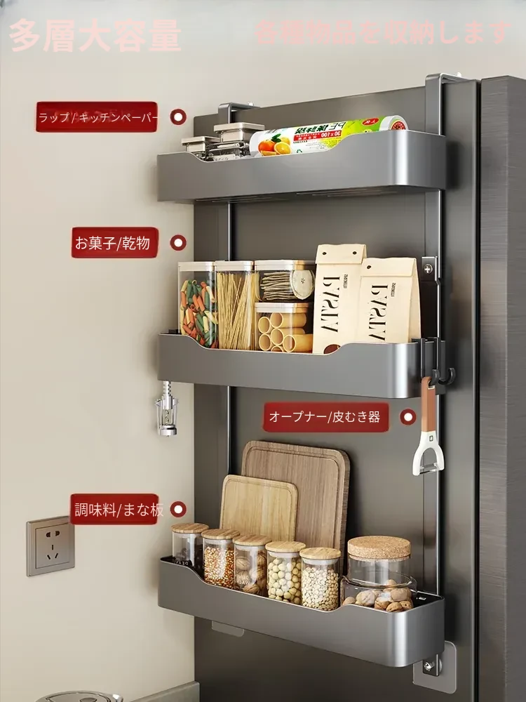 キッチン冷蔵庫用サイド収納ラック 壁掛け式 家庭用多機能・多層調味料収納棚 保鮮フィルムホルダー付き!整理整頓が簡単で、スペースを有効活用できる便利なアイテムです。