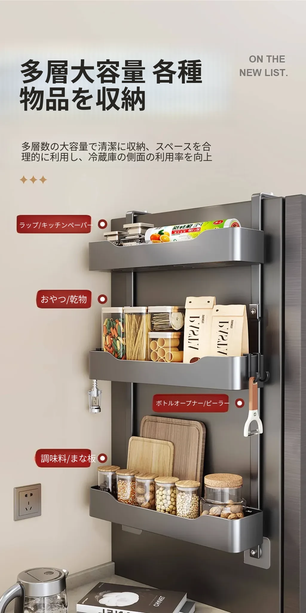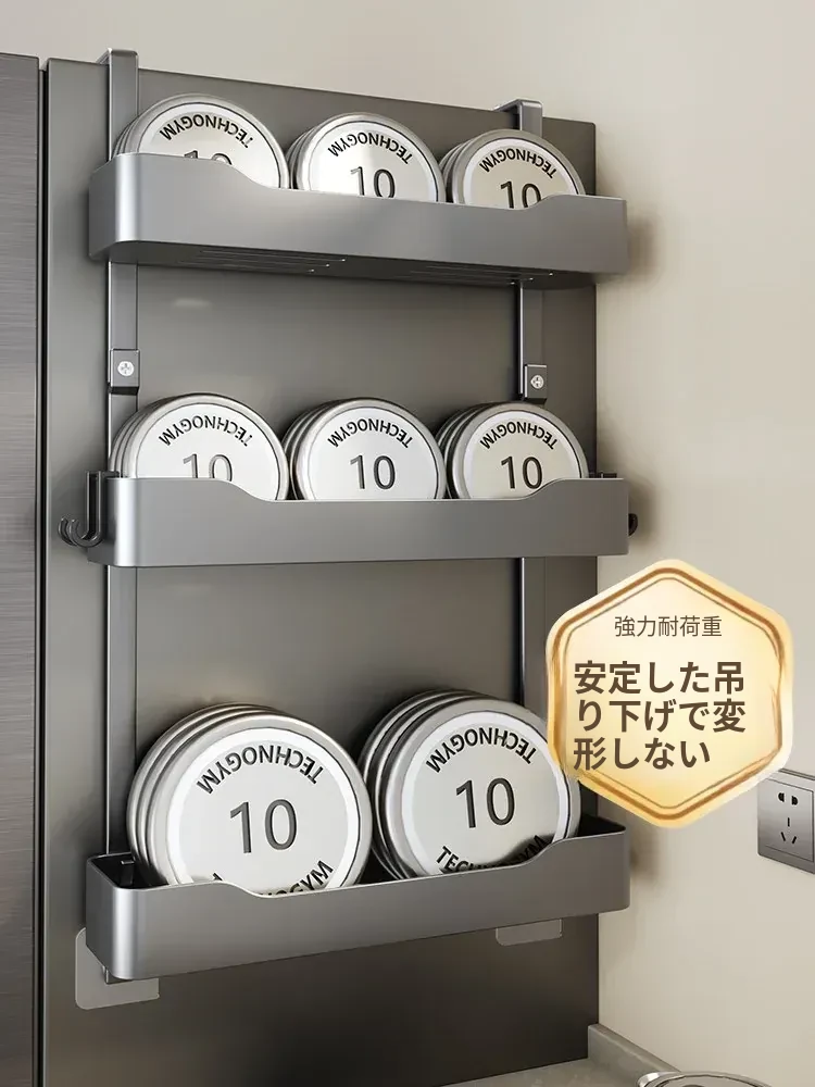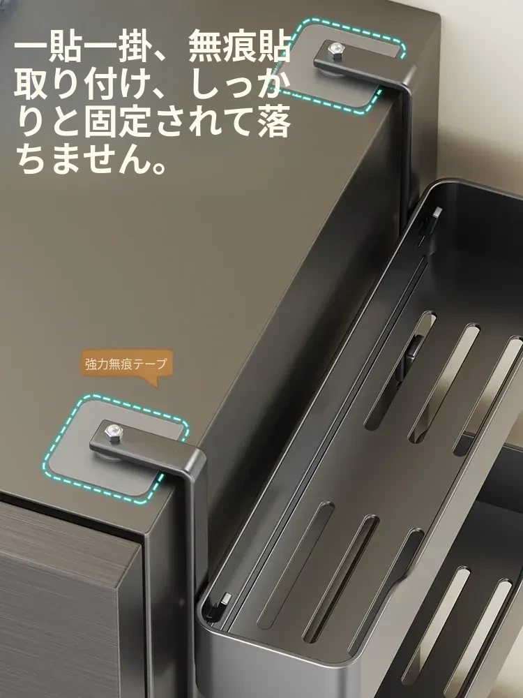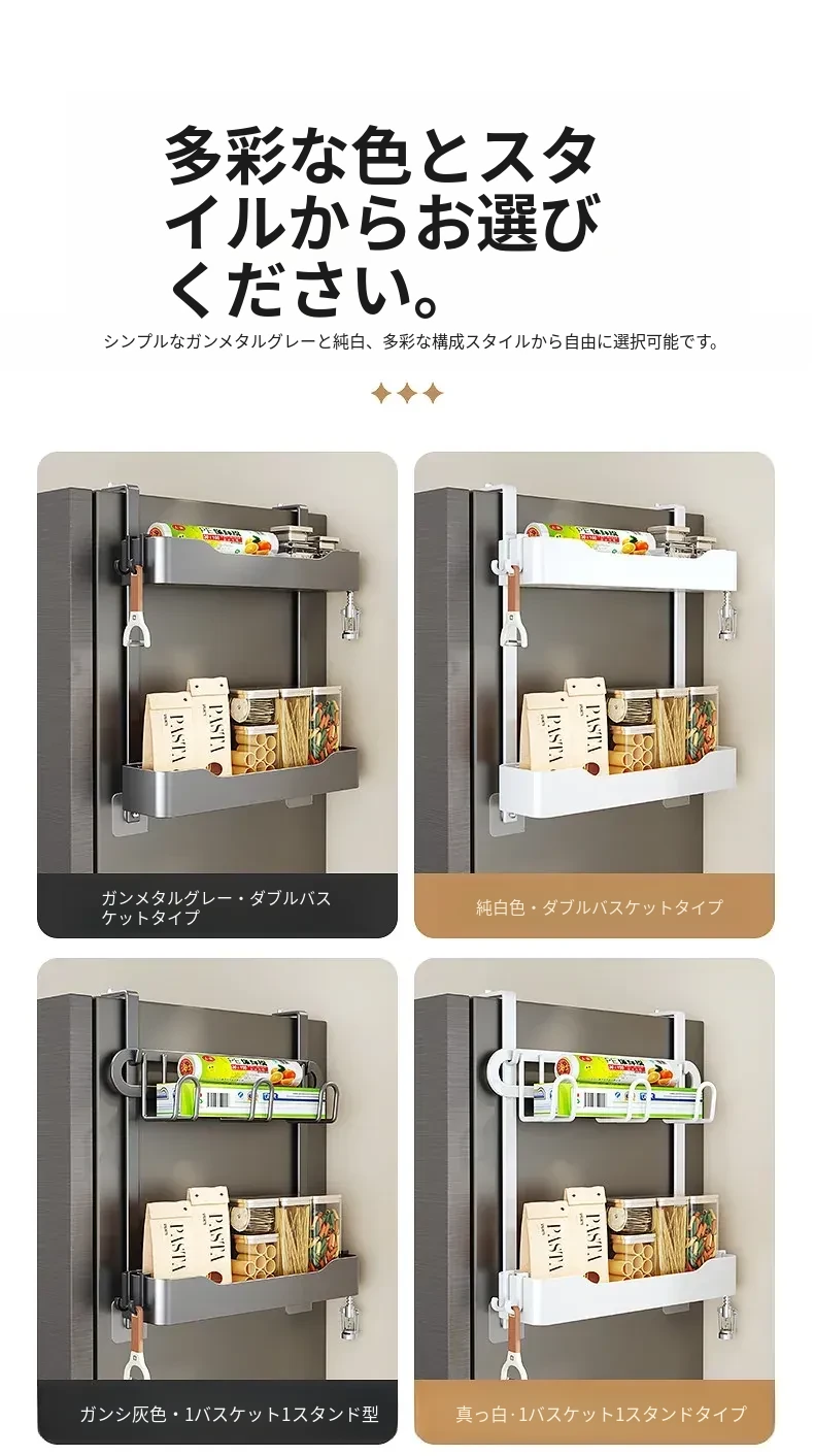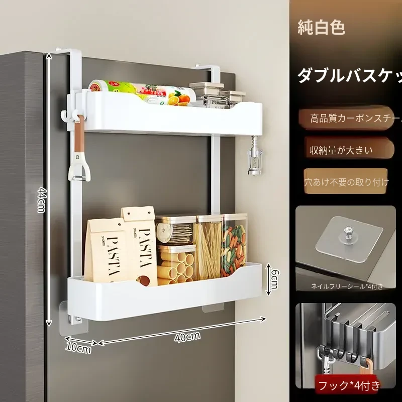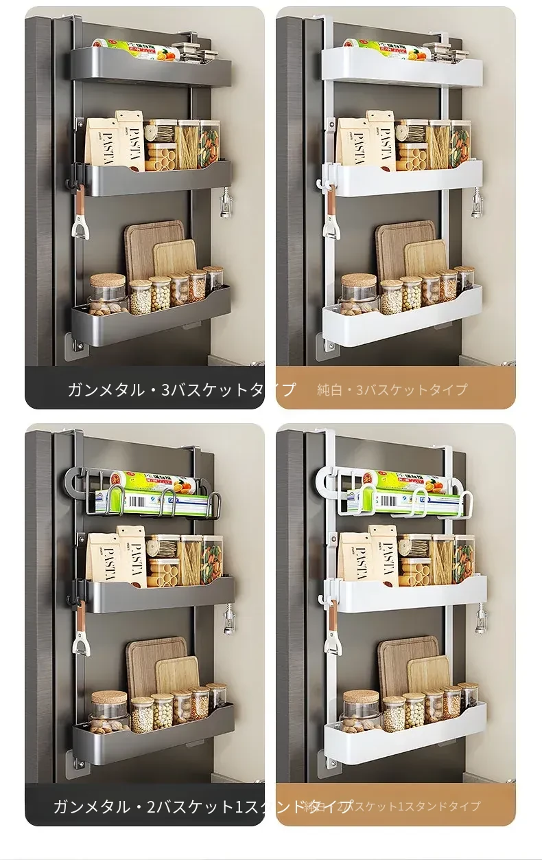 キッチン冷蔵庫用サイド収納ラック 壁掛け式 家庭用多機能・多層調味料収納棚 保鮮フィルムホルダー付き!整理整頓が簡単で、スペースを有効活用できる便利なアイテムです。