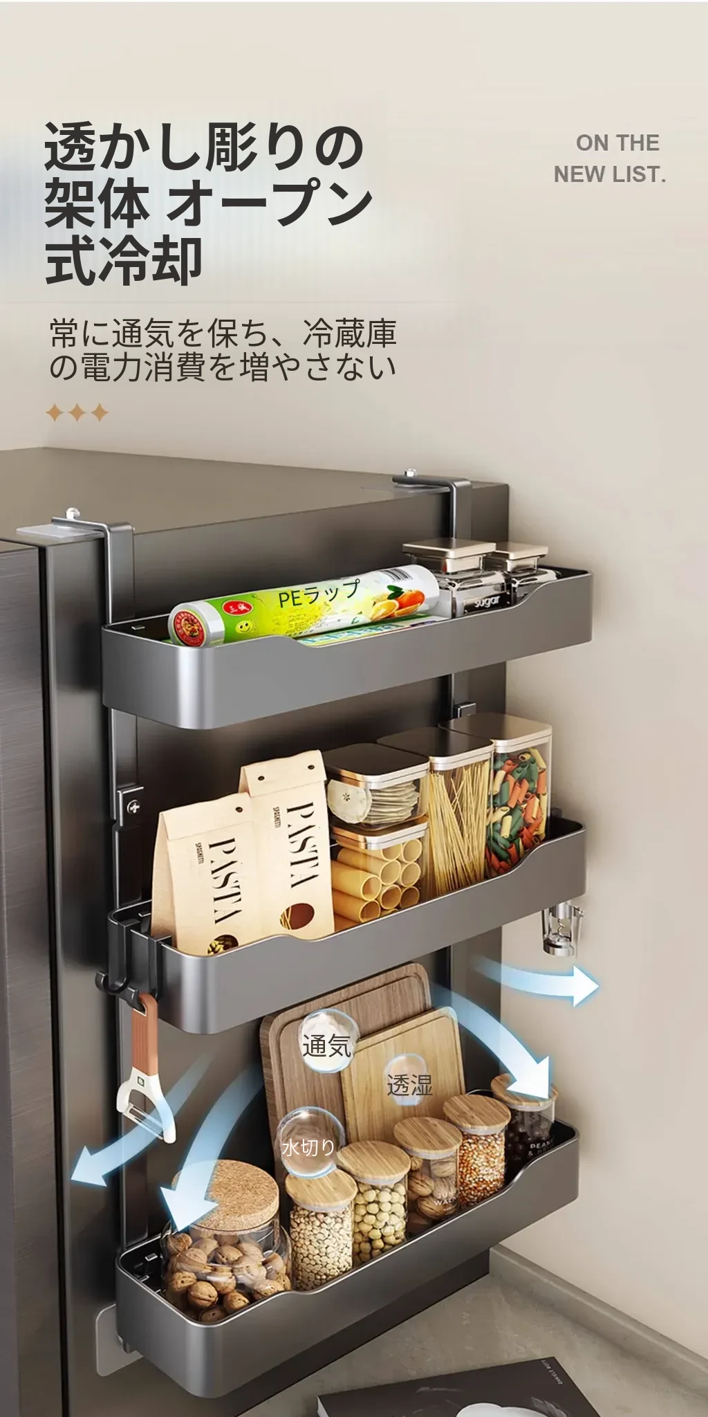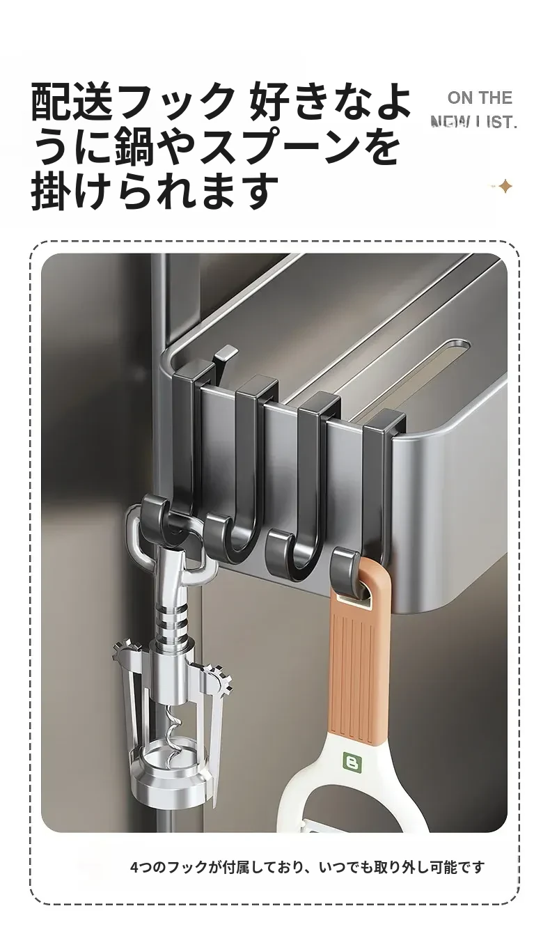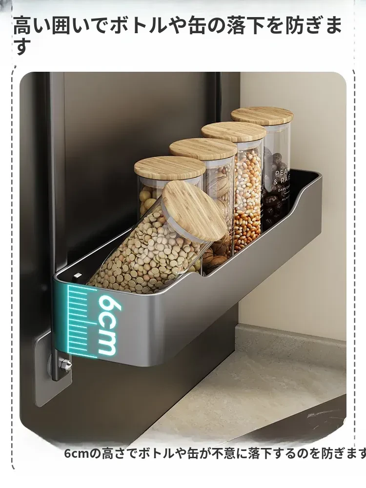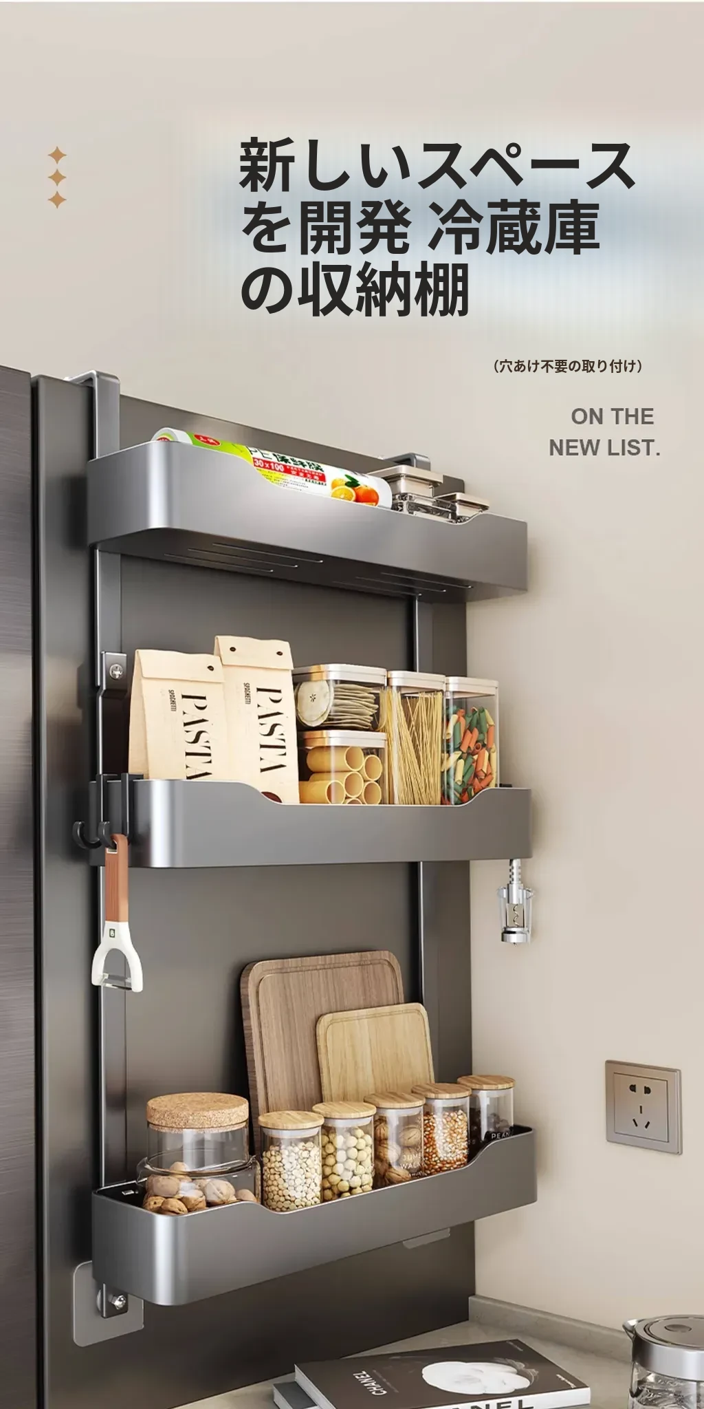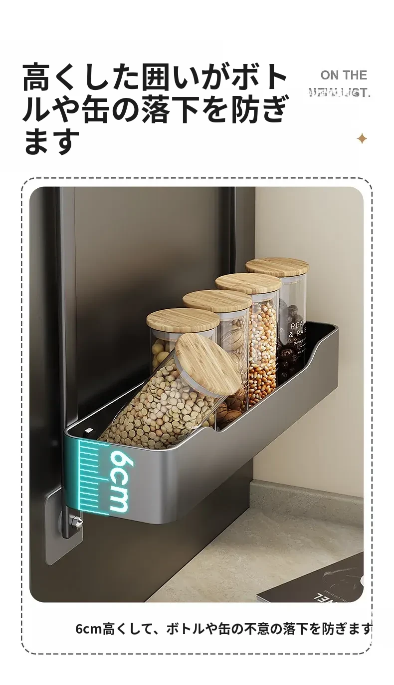 キッチン冷蔵庫用サイド収納ラック 壁掛け式 家庭用多機能・多層調味料収納棚 保鮮フィルムホルダー付き!整理整頓が簡単で、スペースを有効活用できる便利なアイテムです。