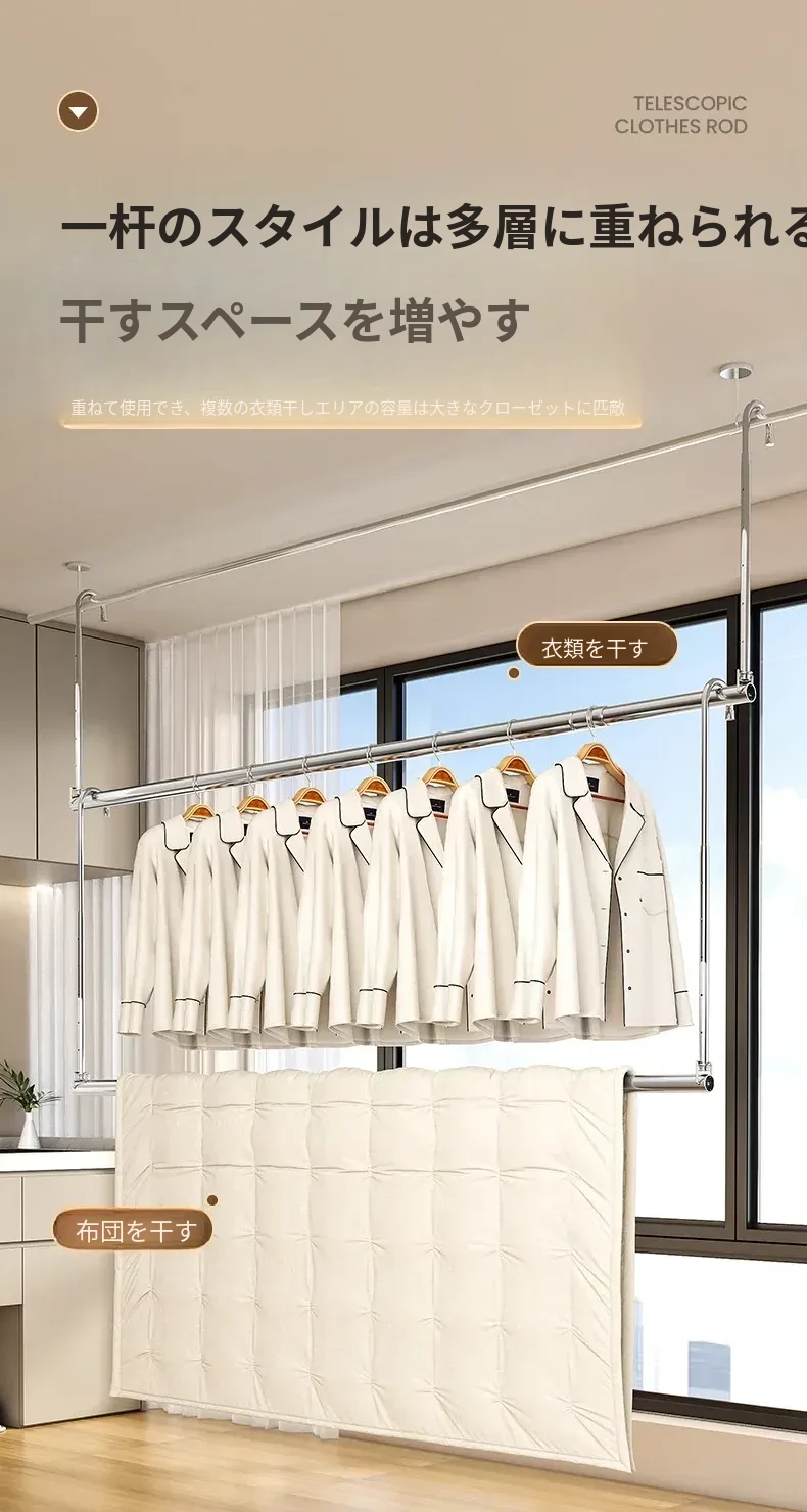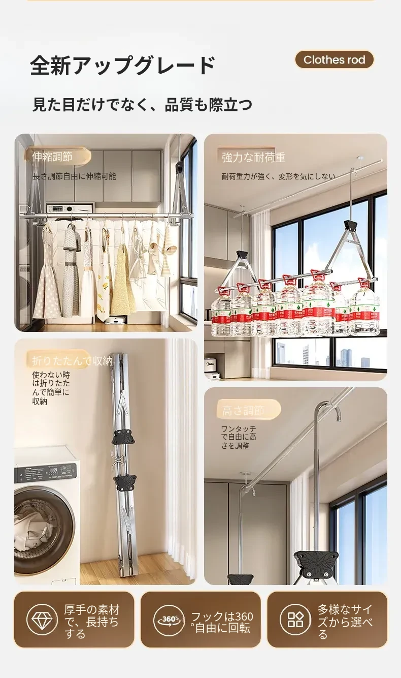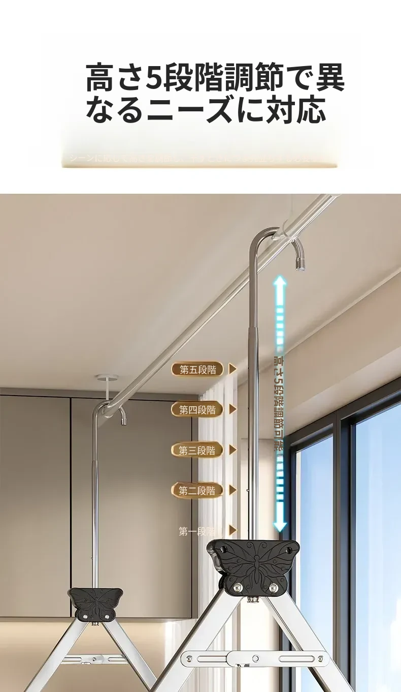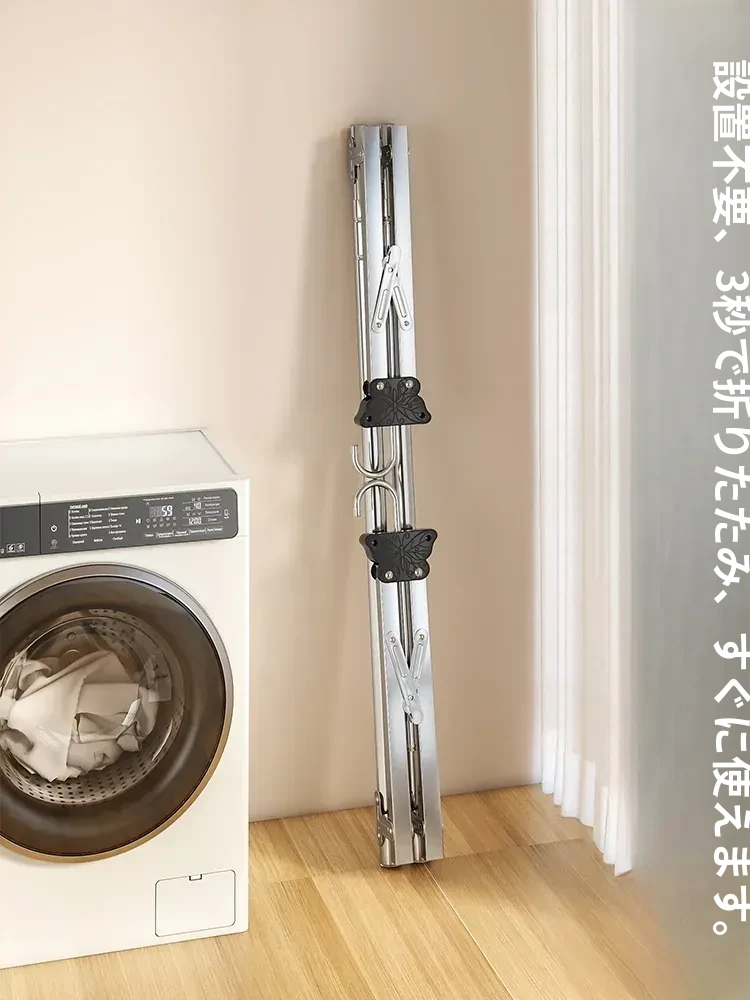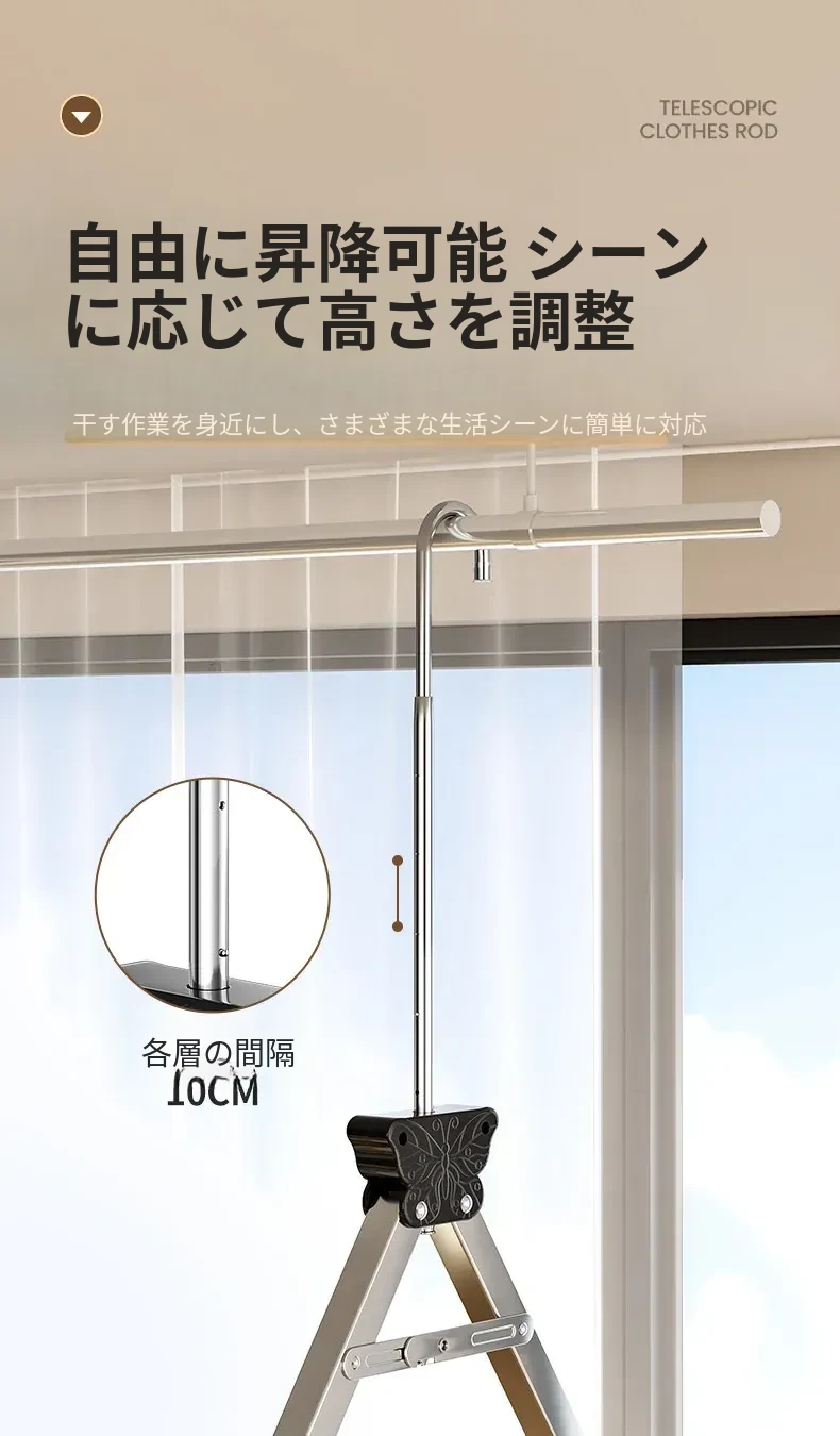 バルコニー用の伸縮式折りたたみ物干しラック - 多機能で昇降可能、衣類や布団も楽々干せる便利アイテム!