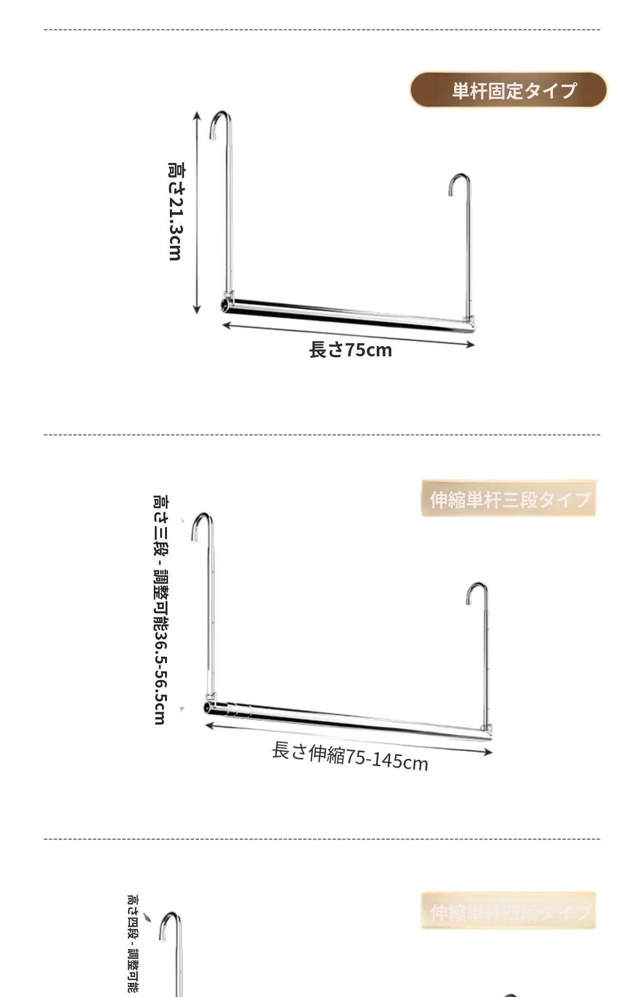 単杆【3段調整】伸縮75-145CM【厚いステンレス】