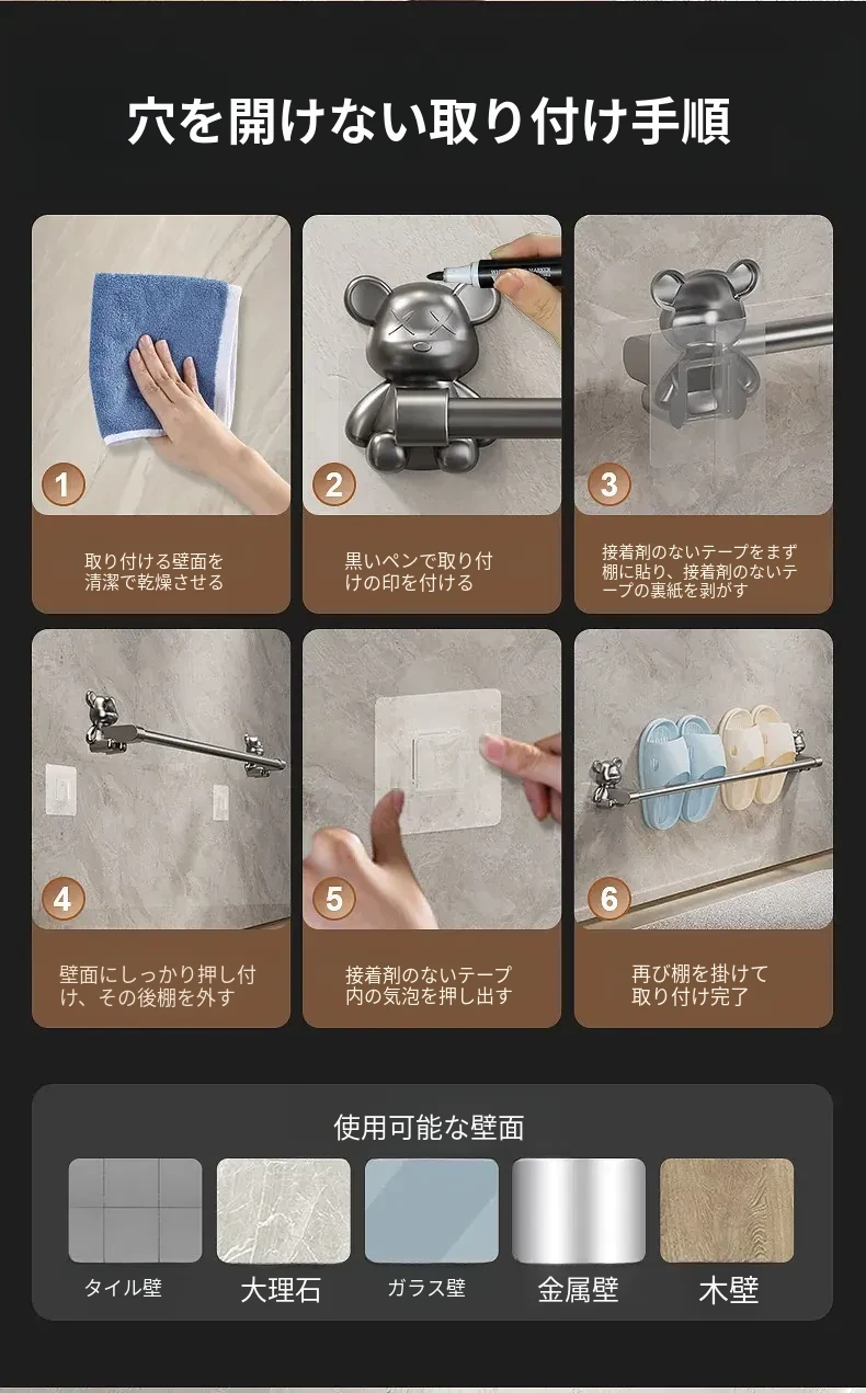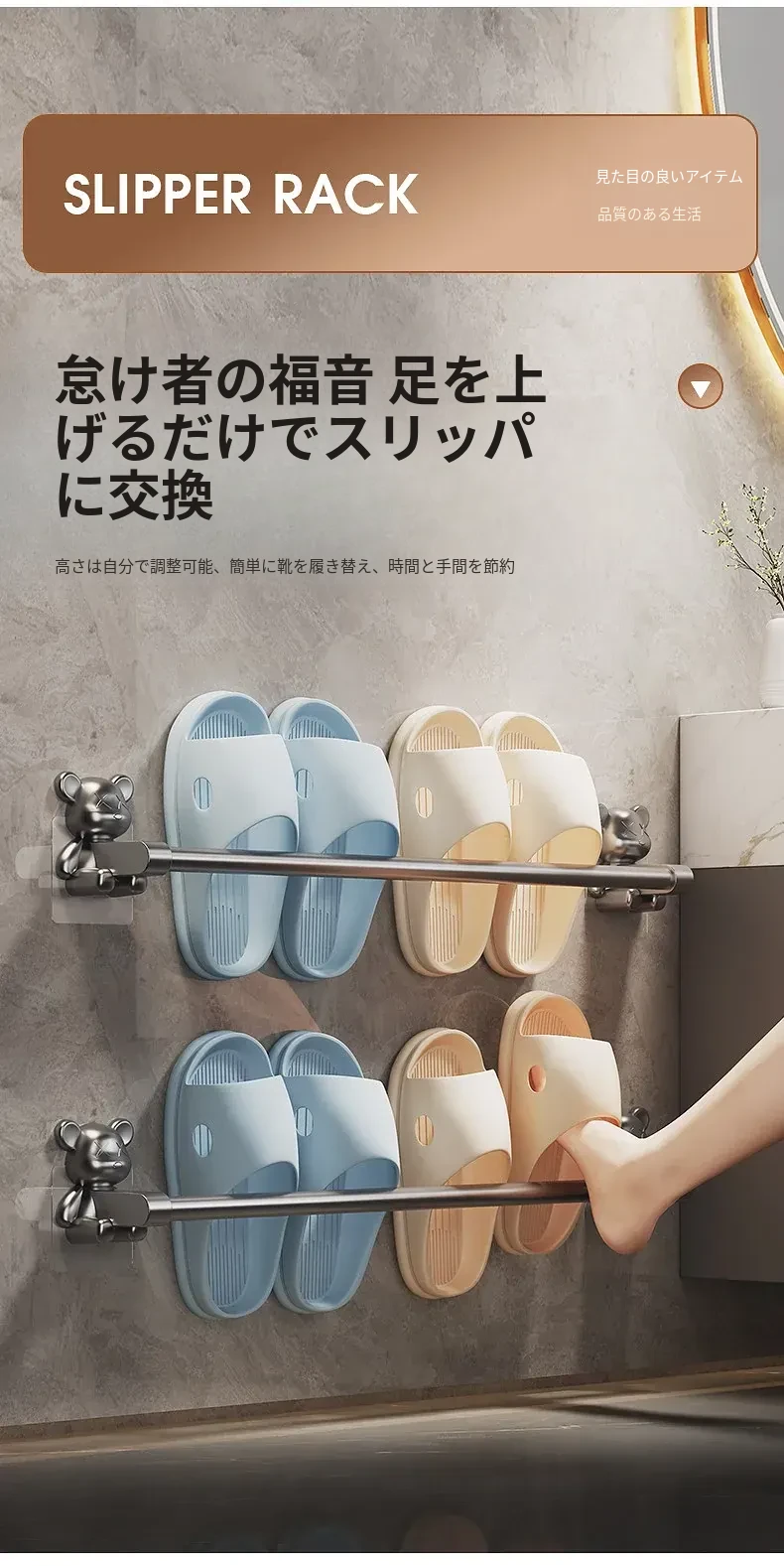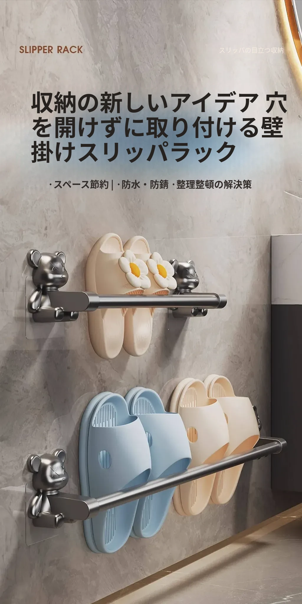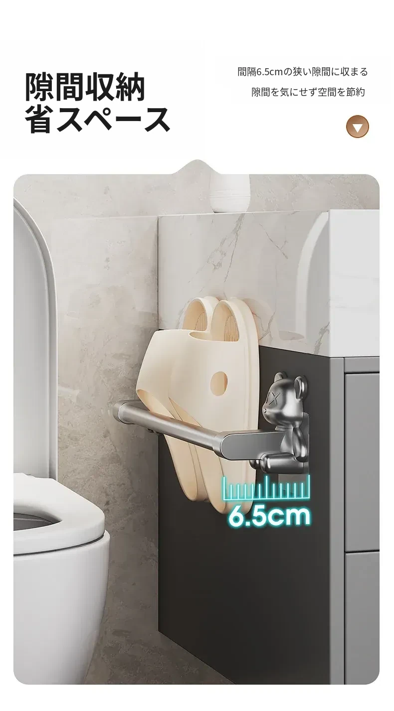 バスルーム用穴あけ不要スリッパラック!トイレや洗面所に最適な壁掛け収納棚。水切り機能付きで、靴の整理整頓も簡単!スペースを有効活用する便利な収納アイテムです。