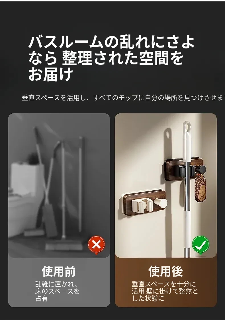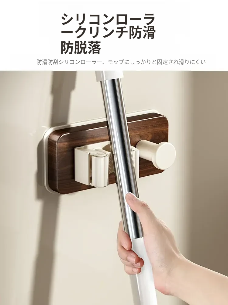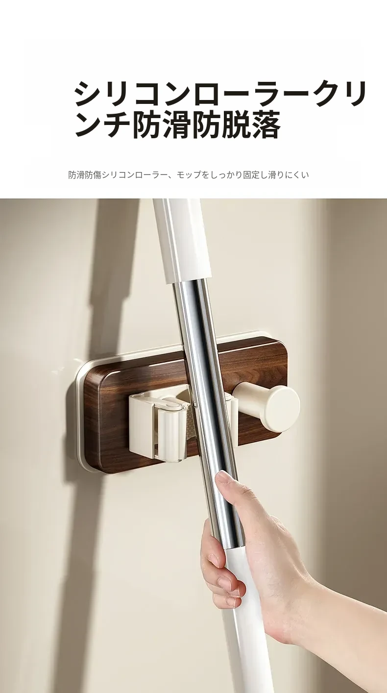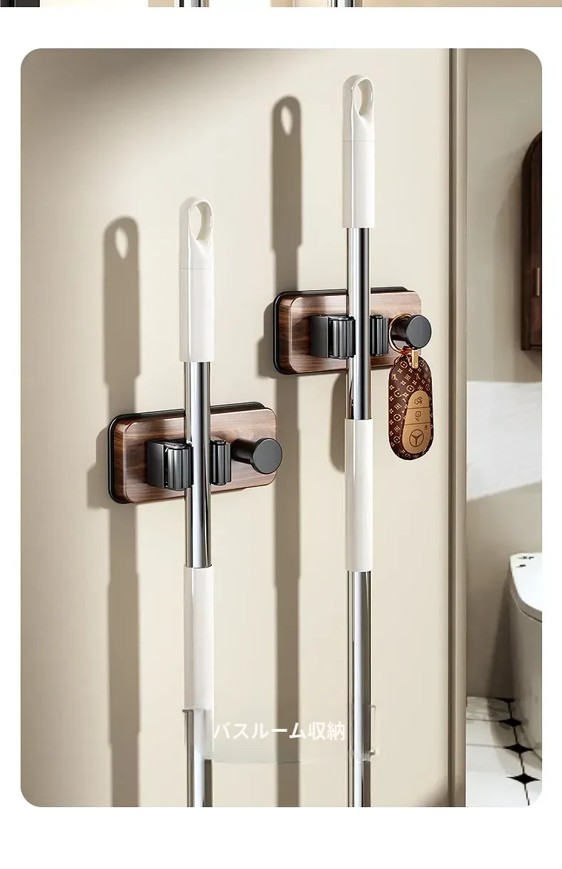 トイレ用モップ壁掛けクリップ、穴あけ不要の掃除道具収納ハンガー!バスルームやバルコニーに最適なほうき・モップ用キャッチャーで、すっきり整理整頓を実現!