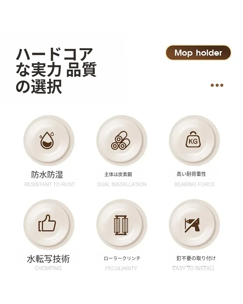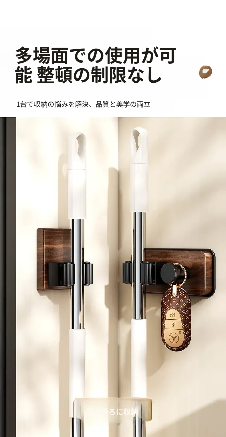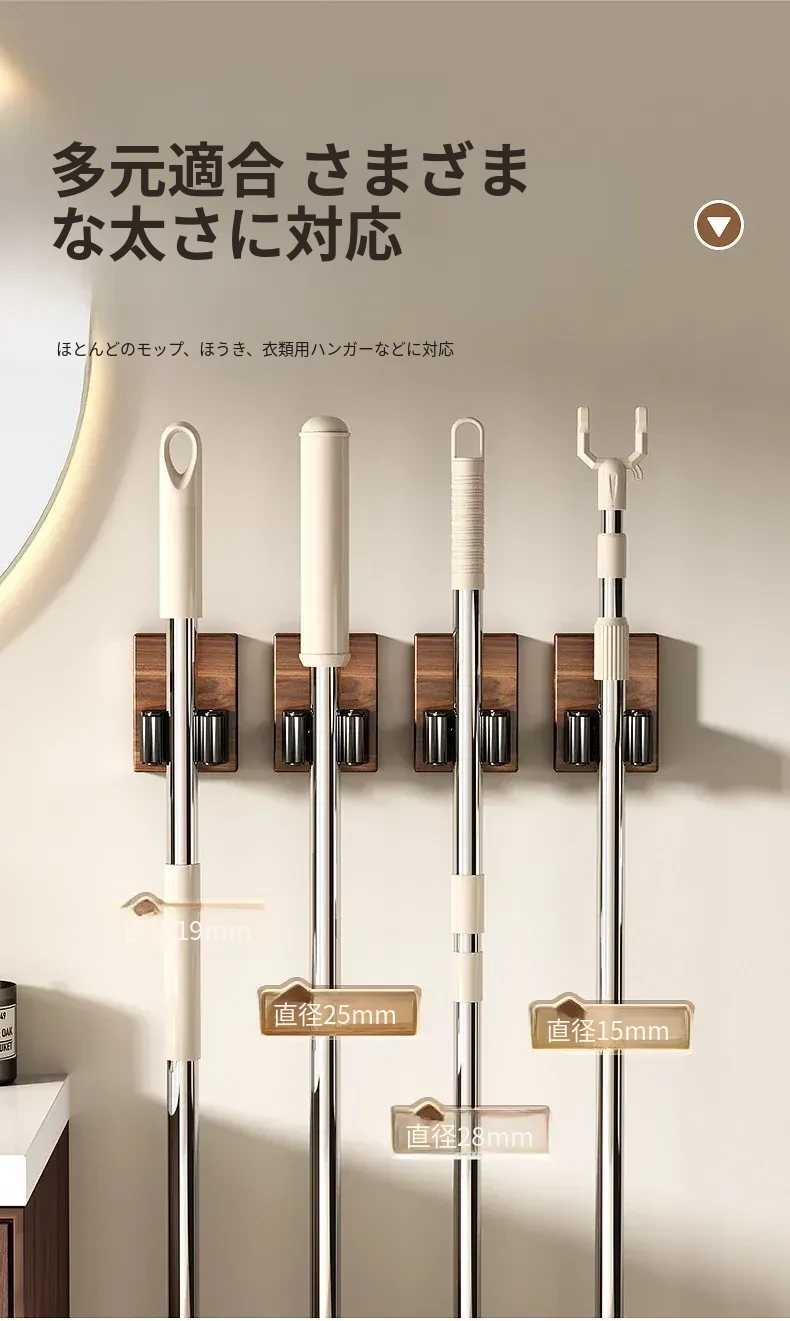 トイレ用モップ壁掛けクリップ、穴あけ不要の掃除道具収納ハンガー!バスルームやバルコニーに最適なほうき・モップ用キャッチャーで、すっきり整理整頓を実現!
