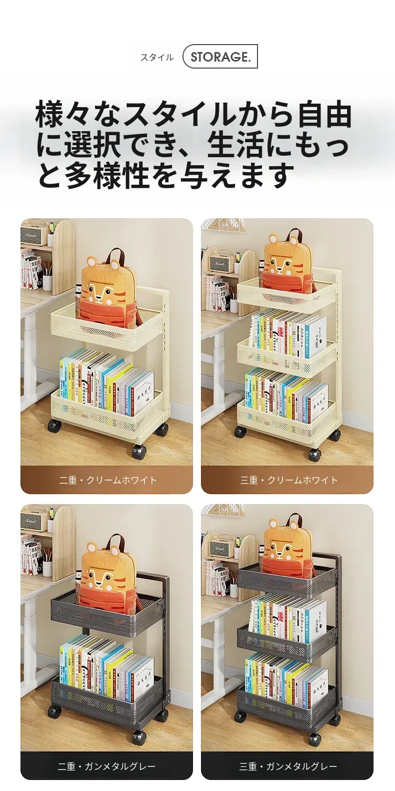 ミルクホワイト【2段】段間調整可能-キャスター付き