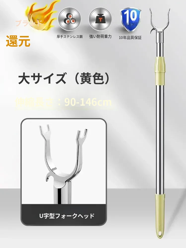 【黄ロングタイプ】アルミ合金ハンガーポール【伸縮90-146cm】