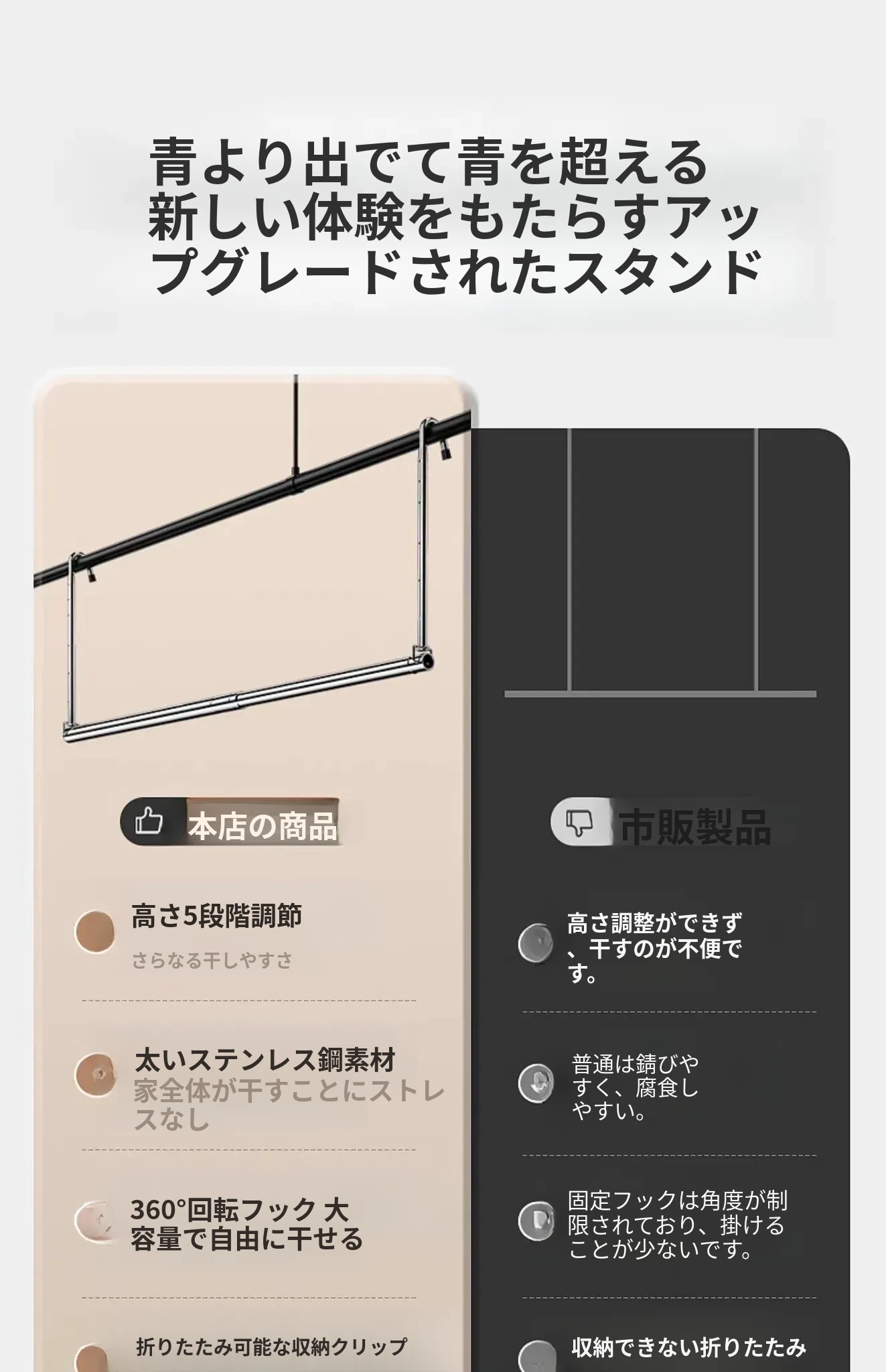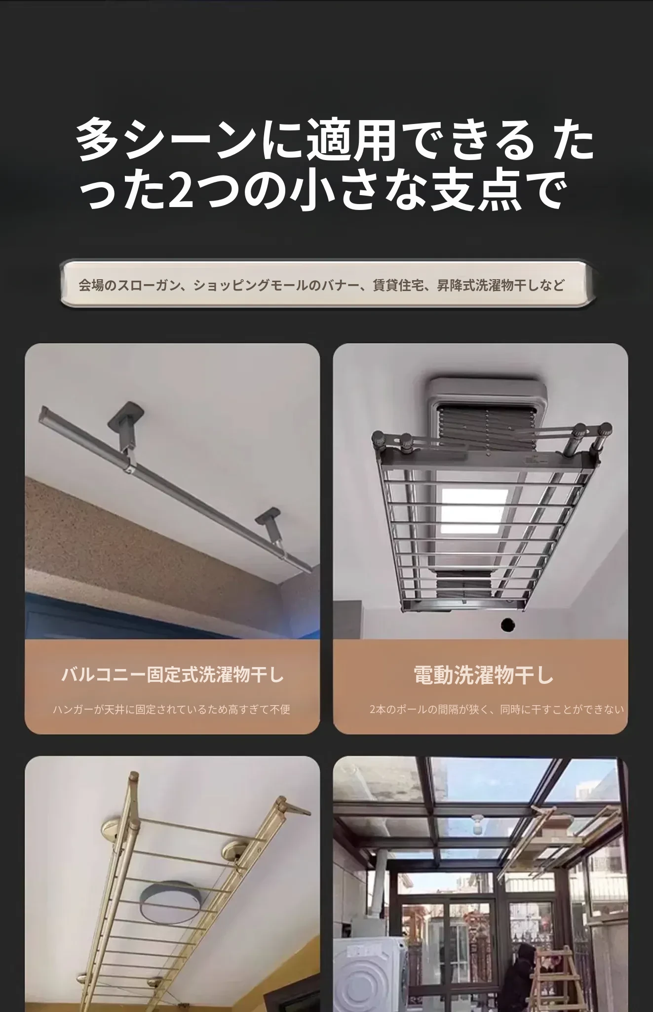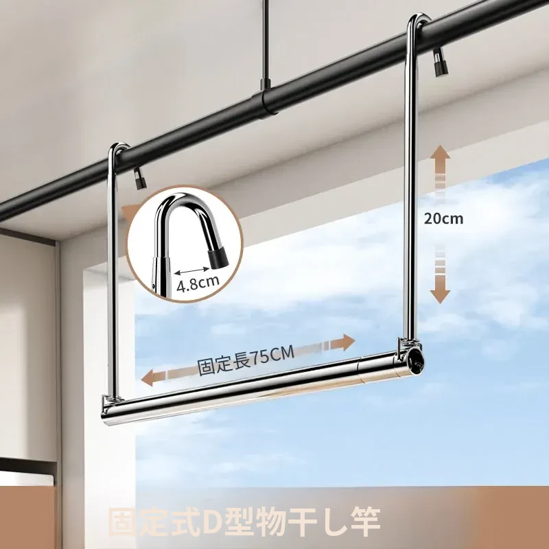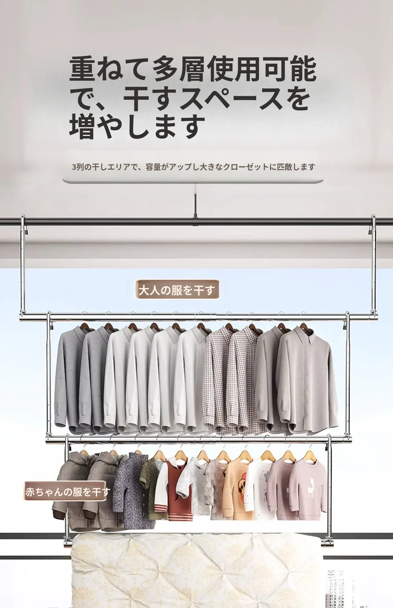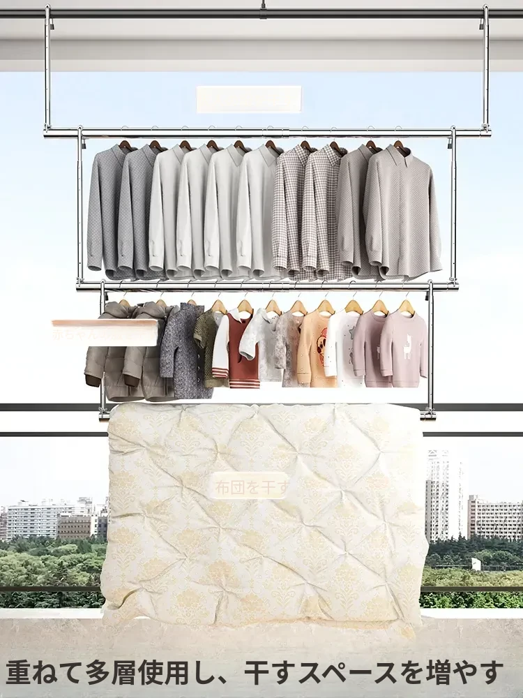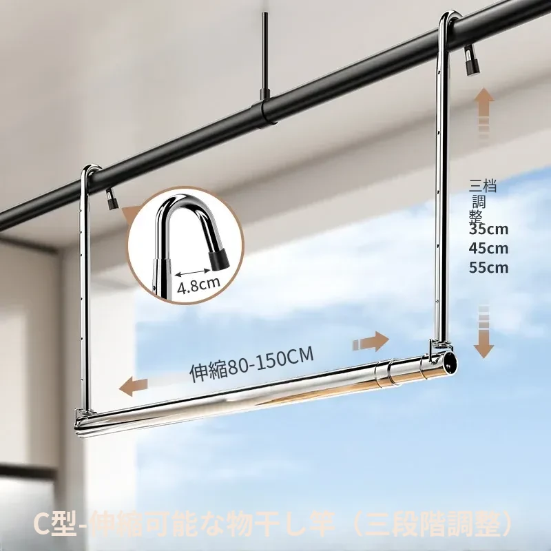 バルコニー用伸縮式物干し竿 - ステンレス製・穴あけ不要・昇降式で便利!布団も干せる魔法のハンガー。家庭での洗濯がもっと楽しくなるアイテム!