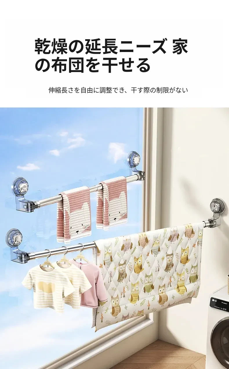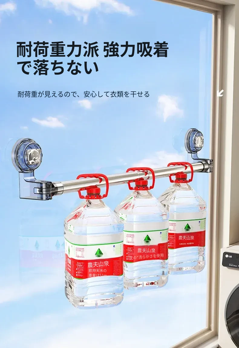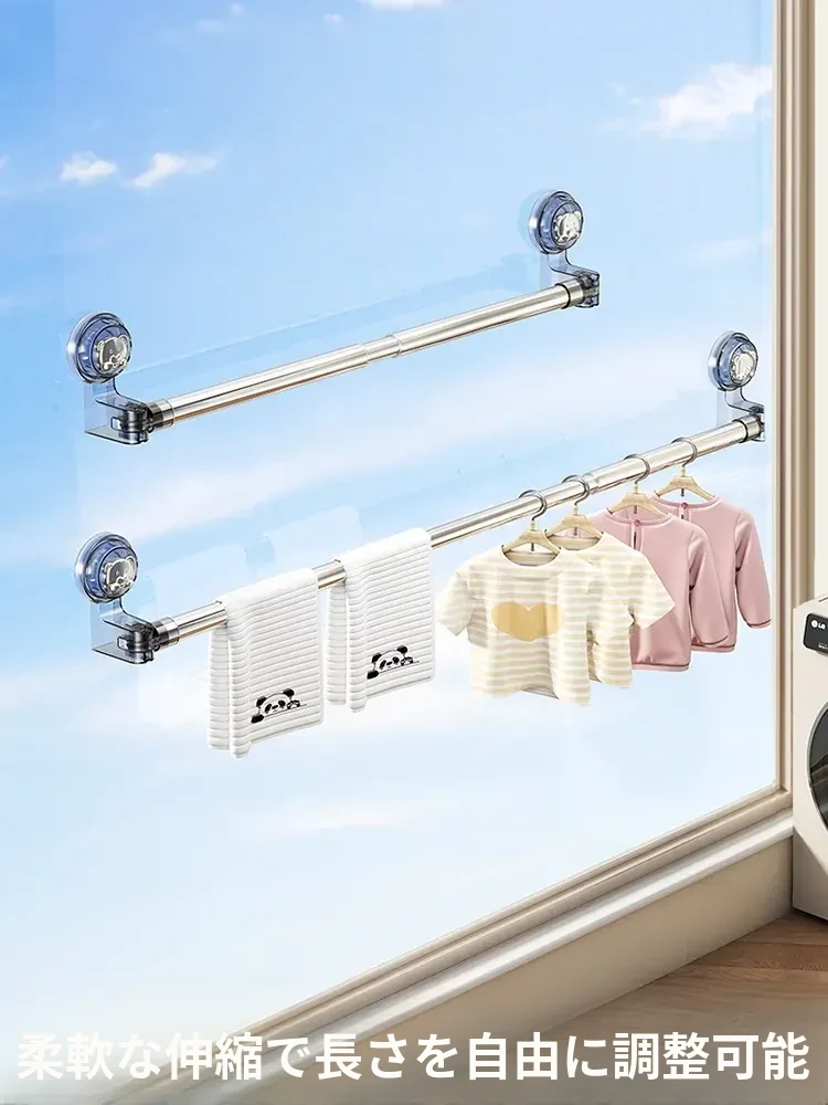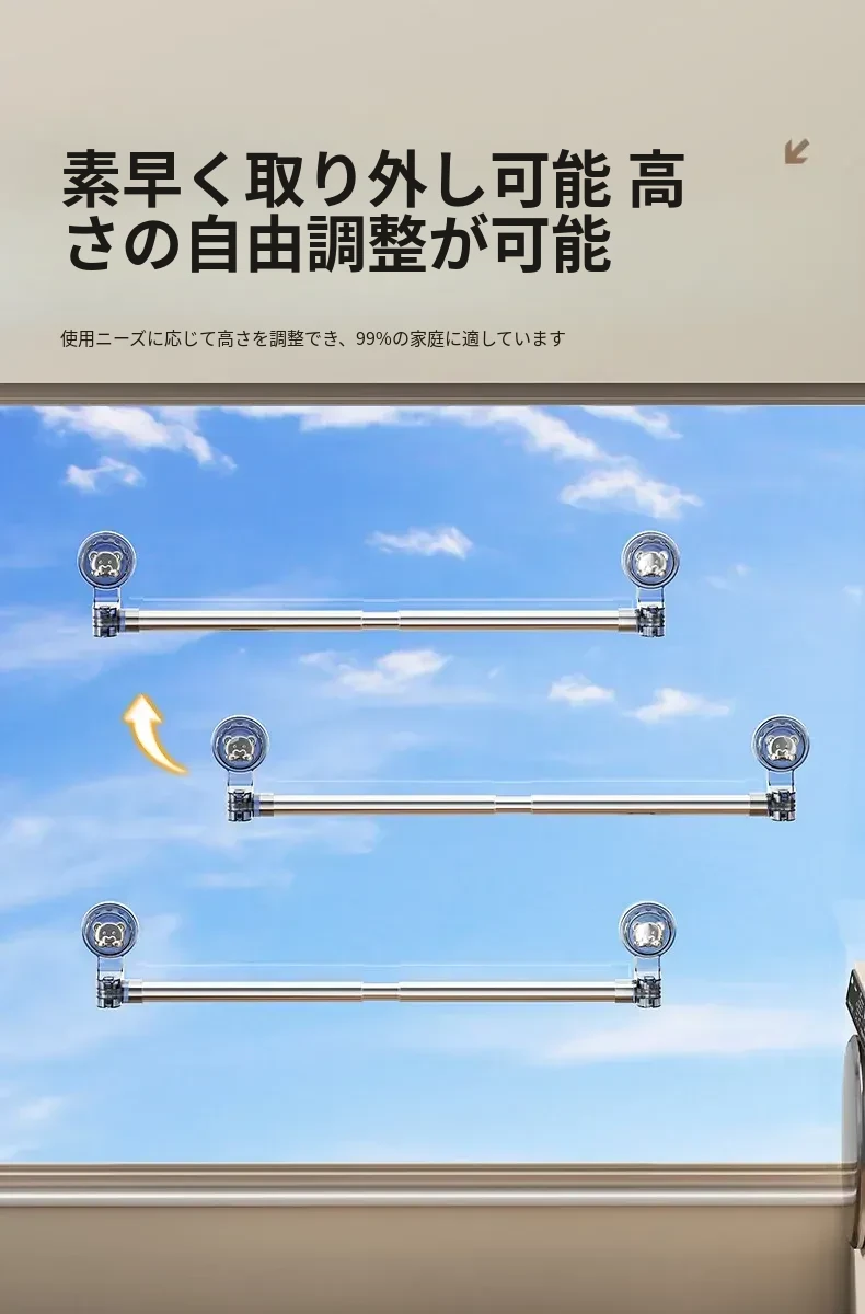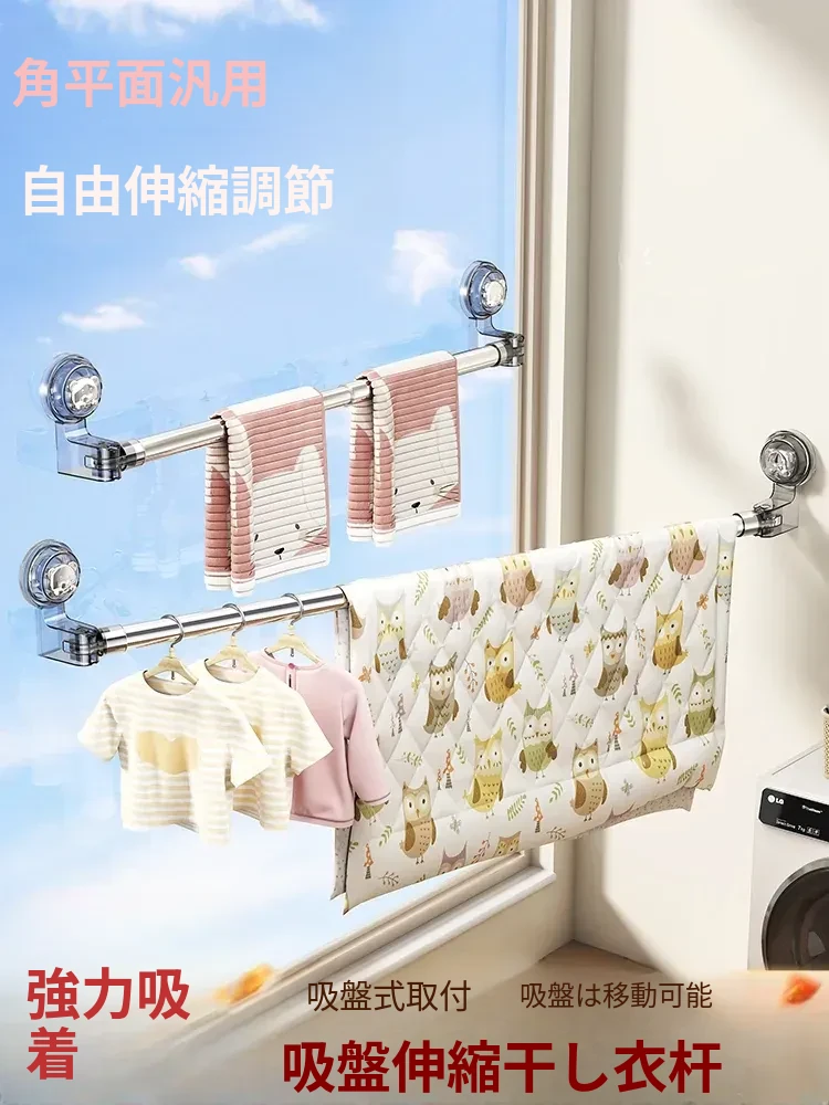吸盤式伸縮衣架!バルコニーや室内に最適な、穴を開けずに使える便利な干し物スタンド!衣類や布団を簡単に干せる!おしゃれで省スペース、整理整頓にも最適です!