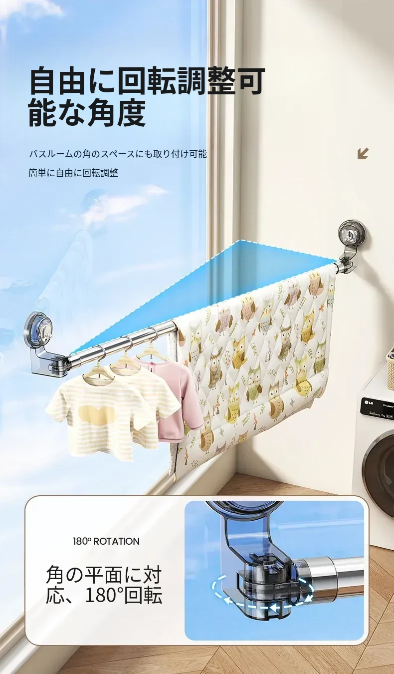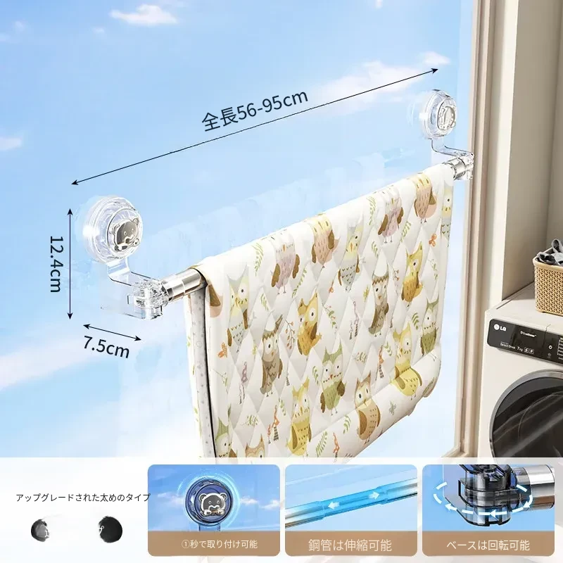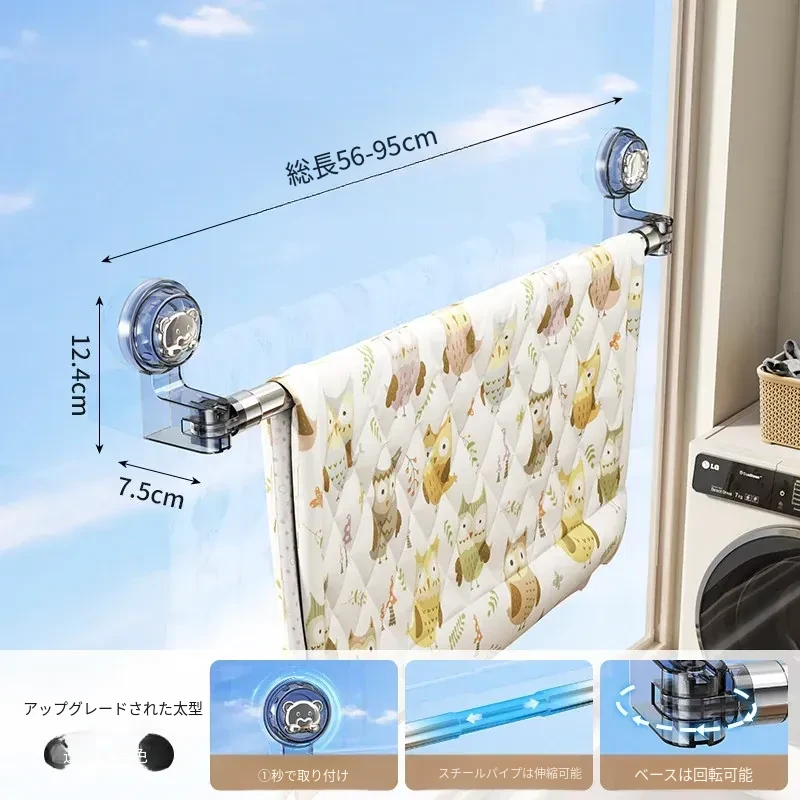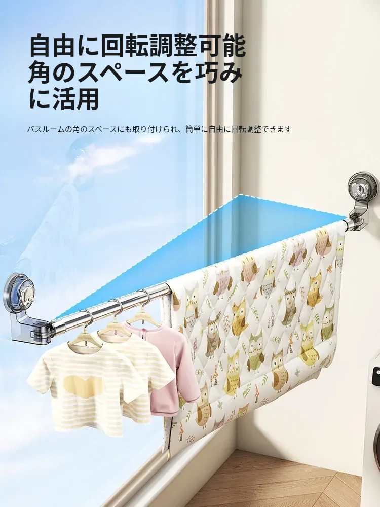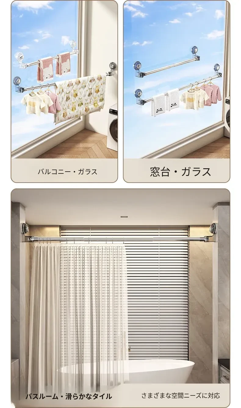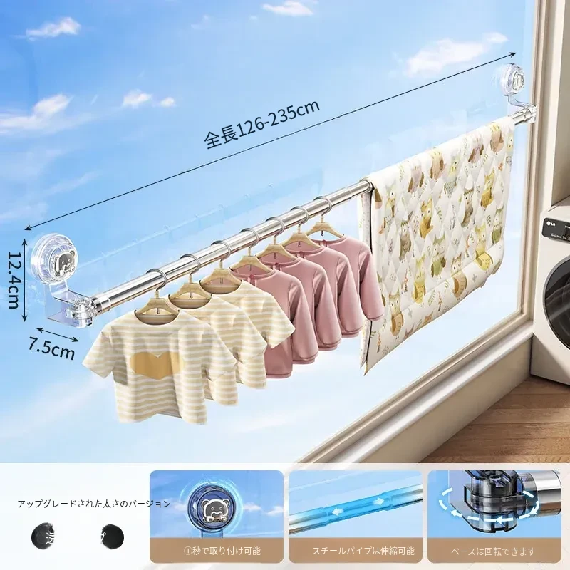 吸盤式伸縮衣架!バルコニーや室内に最適な、穴を開けずに使える便利な干し物スタンド!衣類や布団を簡単に干せる!おしゃれで省スペース、整理整頓にも最適です!