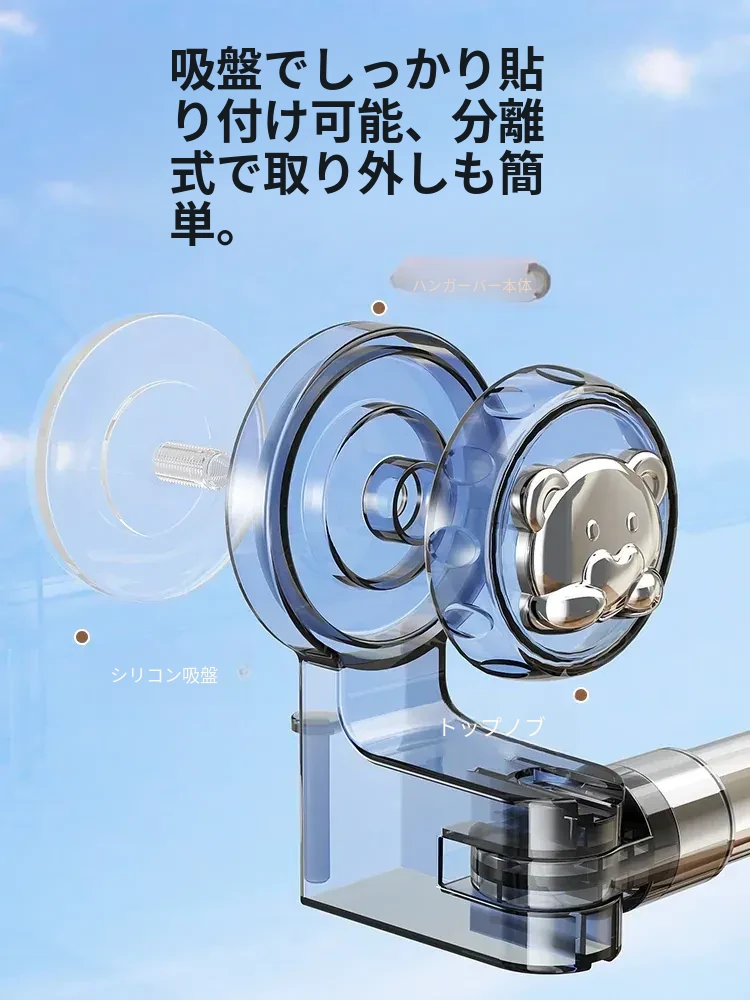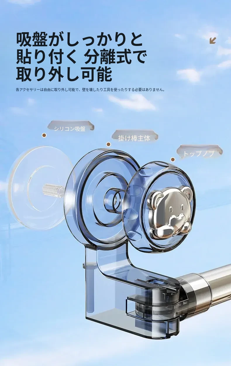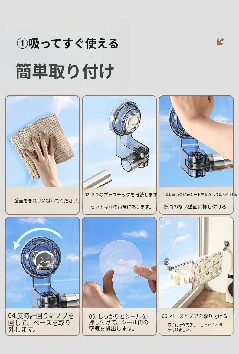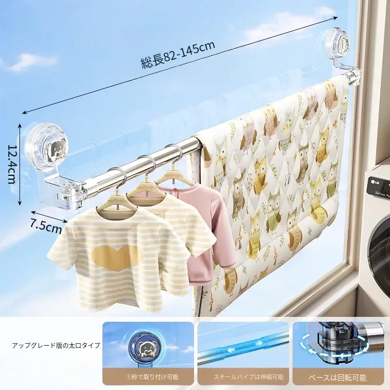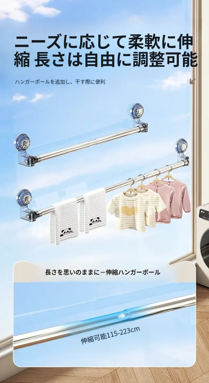 吸盤式伸縮衣架!バルコニーや室内に最適な、穴を開けずに使える便利な干し物スタンド!衣類や布団を簡単に干せる!おしゃれで省スペース、整理整頓にも最適です!