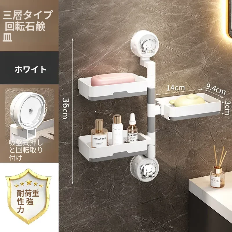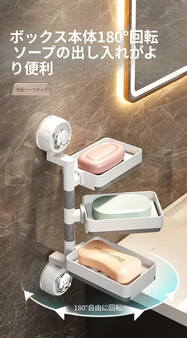 クリームホワイト⭐吸盤三重石鹸箱【180°回転可能】
