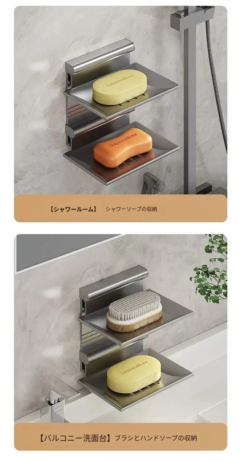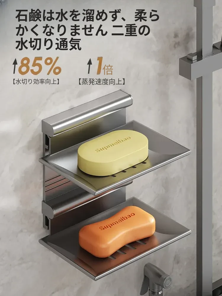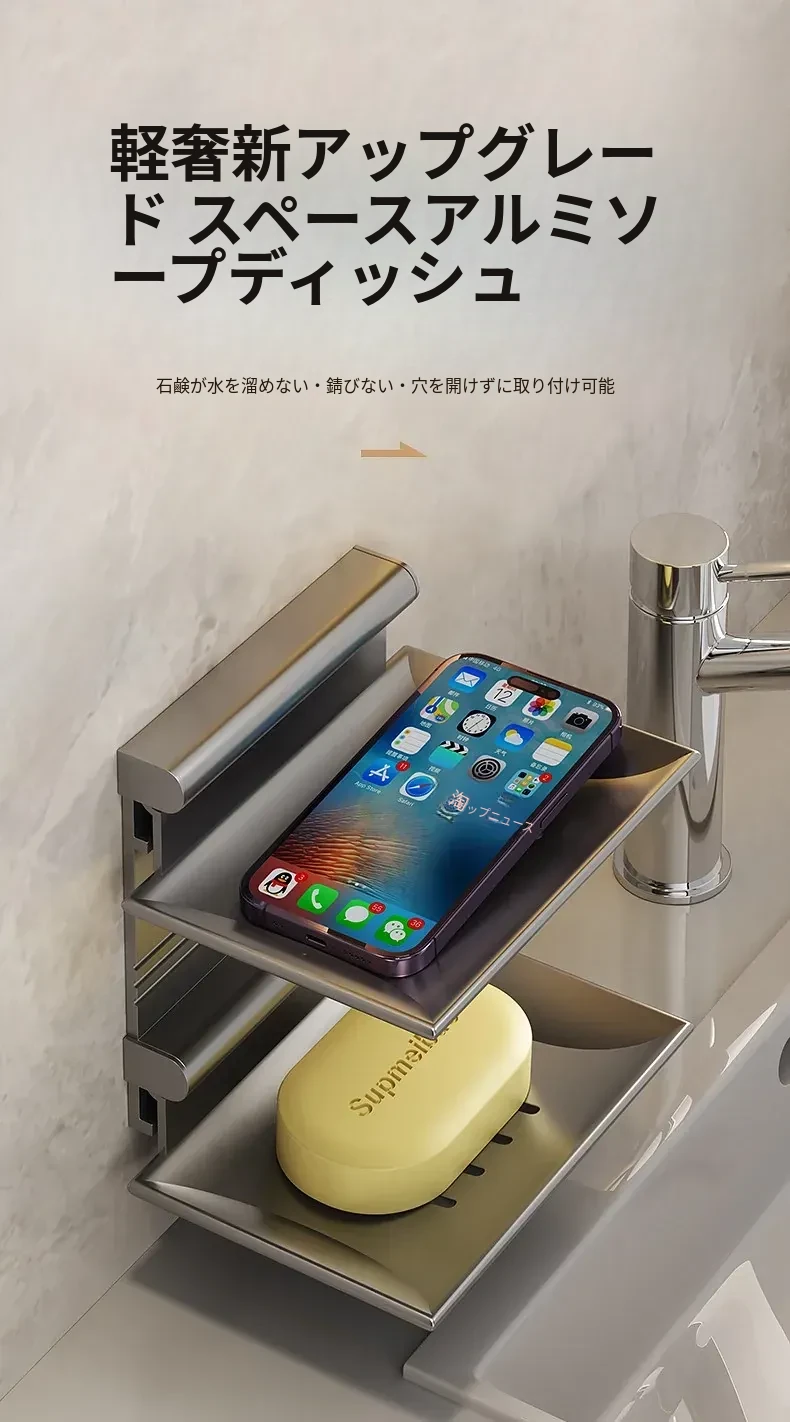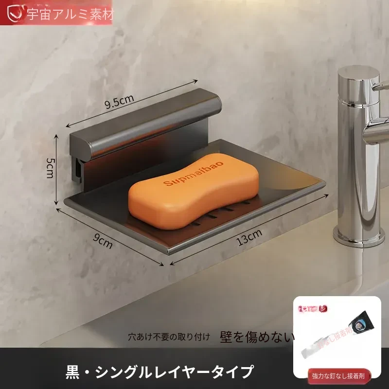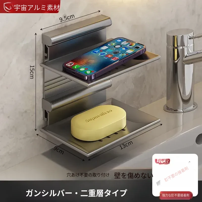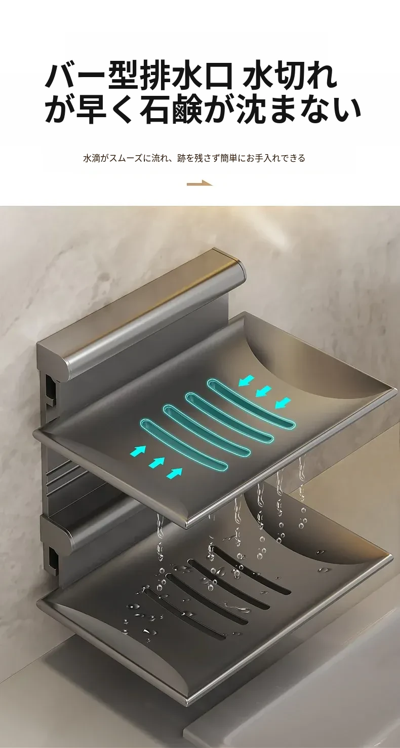 宇宙アルミ製 壁掛けソープホルダー - おしゃれで機能的なバスルーム収納!穴あけ不要、両層の水切り設計で、家庭用に最適な香り高い石鹸ボックス。スッキリした空間を演出します!