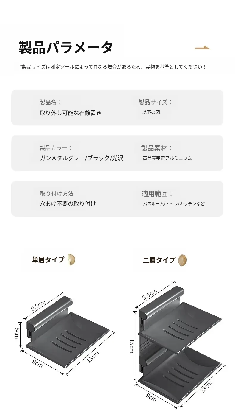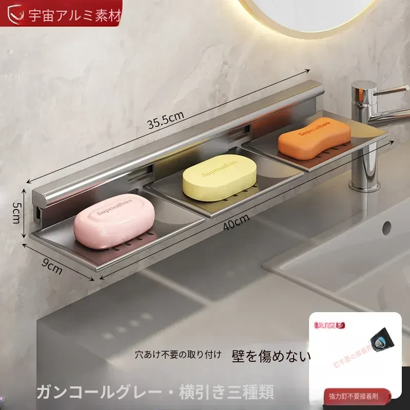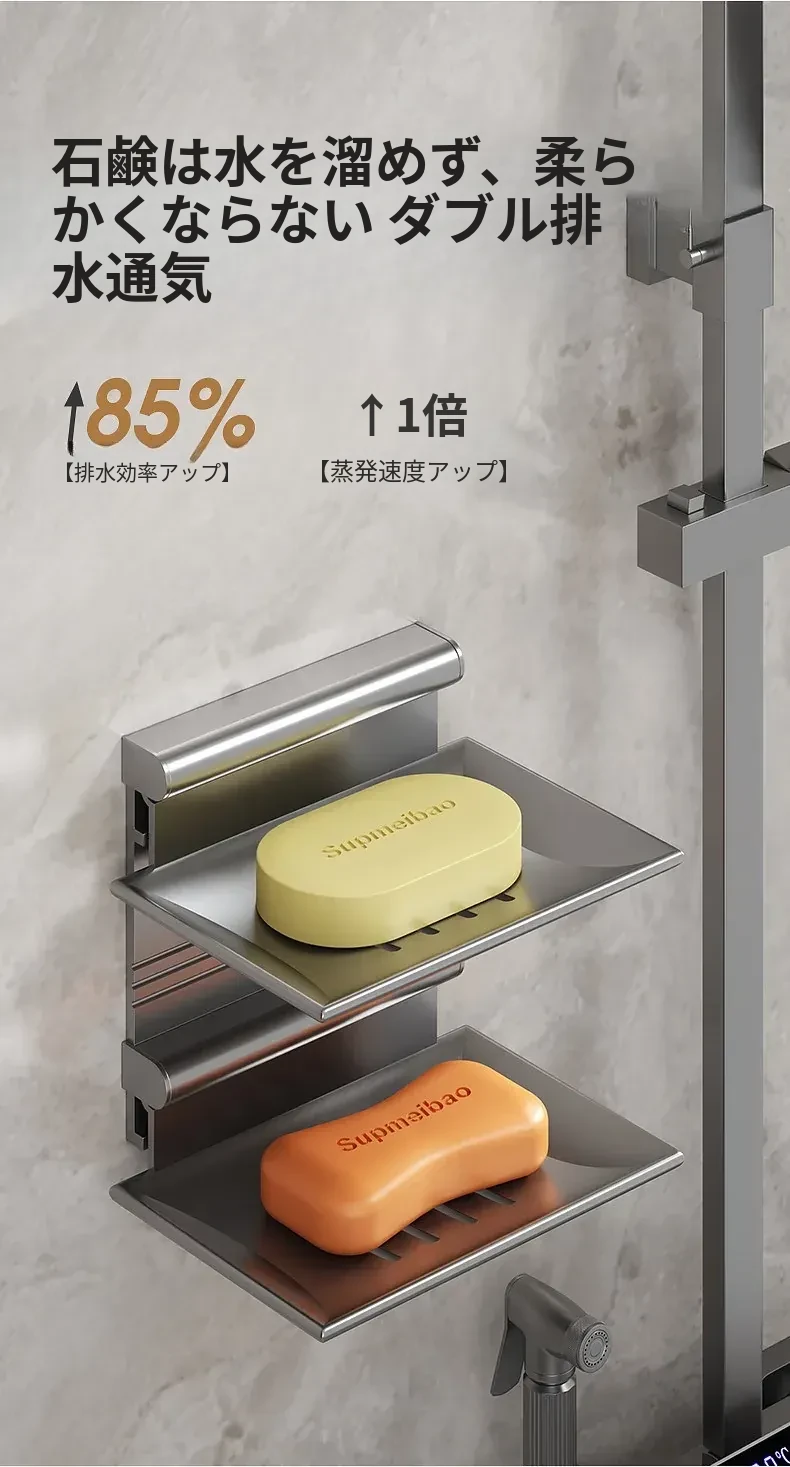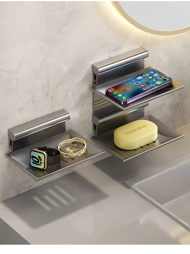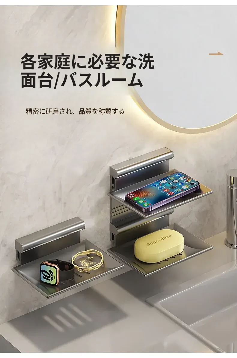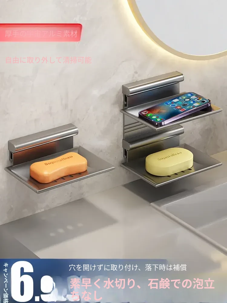 宇宙アルミ製 壁掛けソープホルダー - おしゃれで機能的なバスルーム収納!穴あけ不要、両層の水切り設計で、家庭用に最適な香り高い石鹸ボックス。スッキリした空間を演出します!