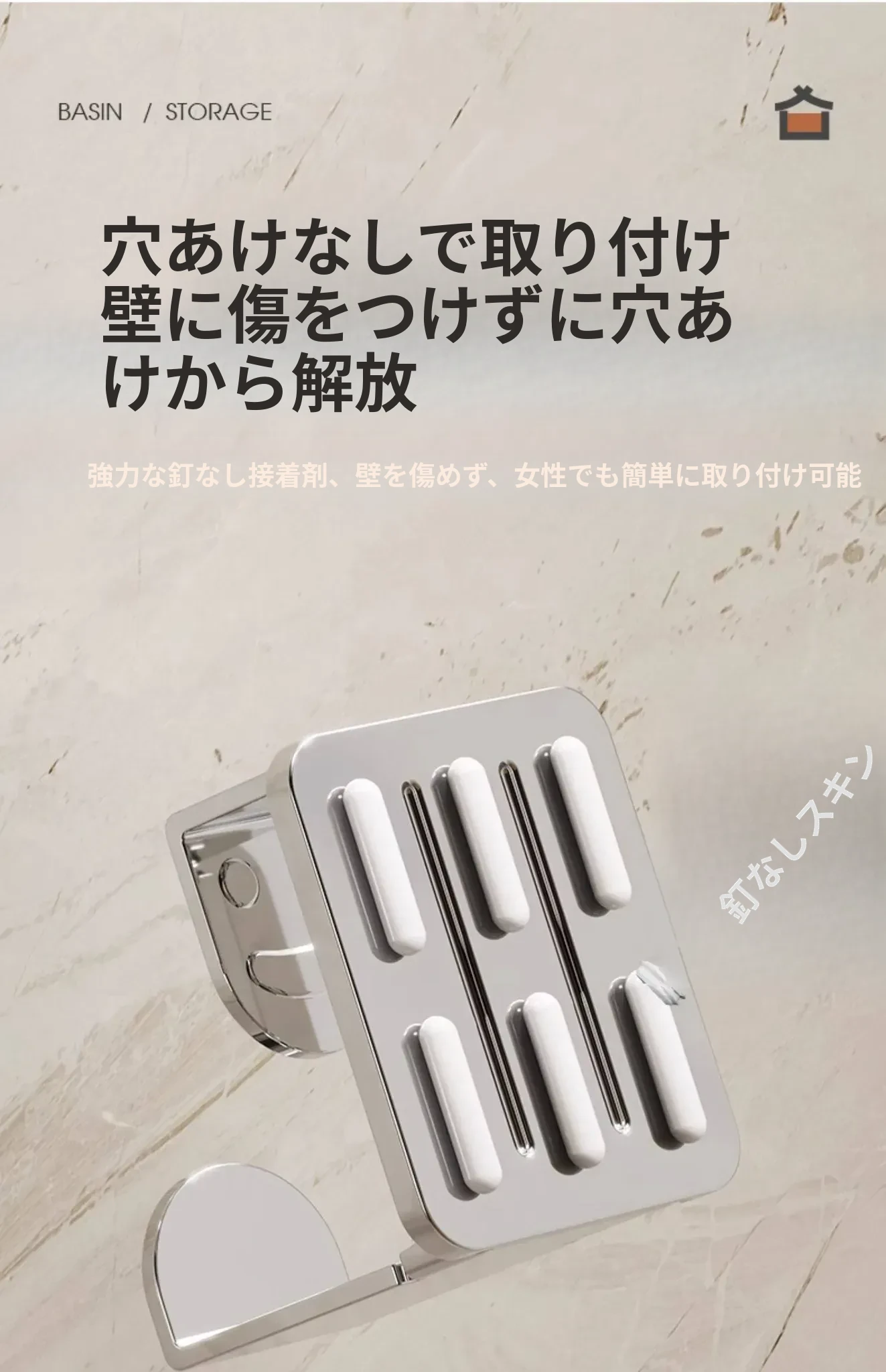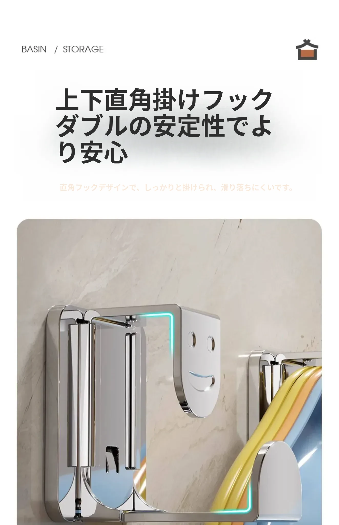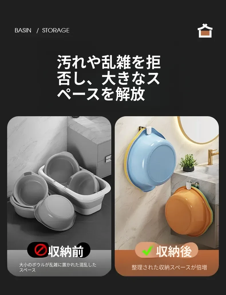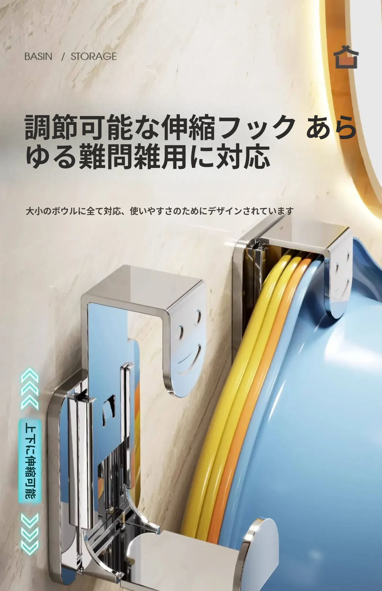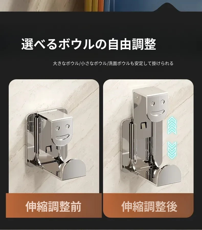 ステンレス製洗面器フック付きバスルーム収納ラック - 穴あけ不要!洗面器やバスボウルをスタイリッシュに収納できる便利なアイテムです。清潔感溢れるデザインで、狭いスペースも有効活用!